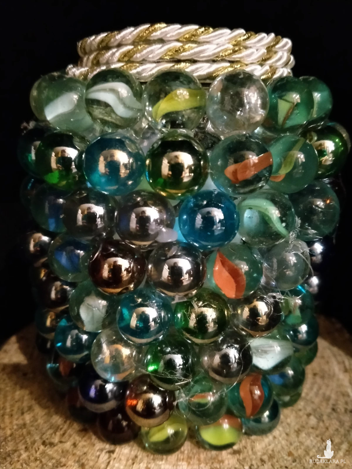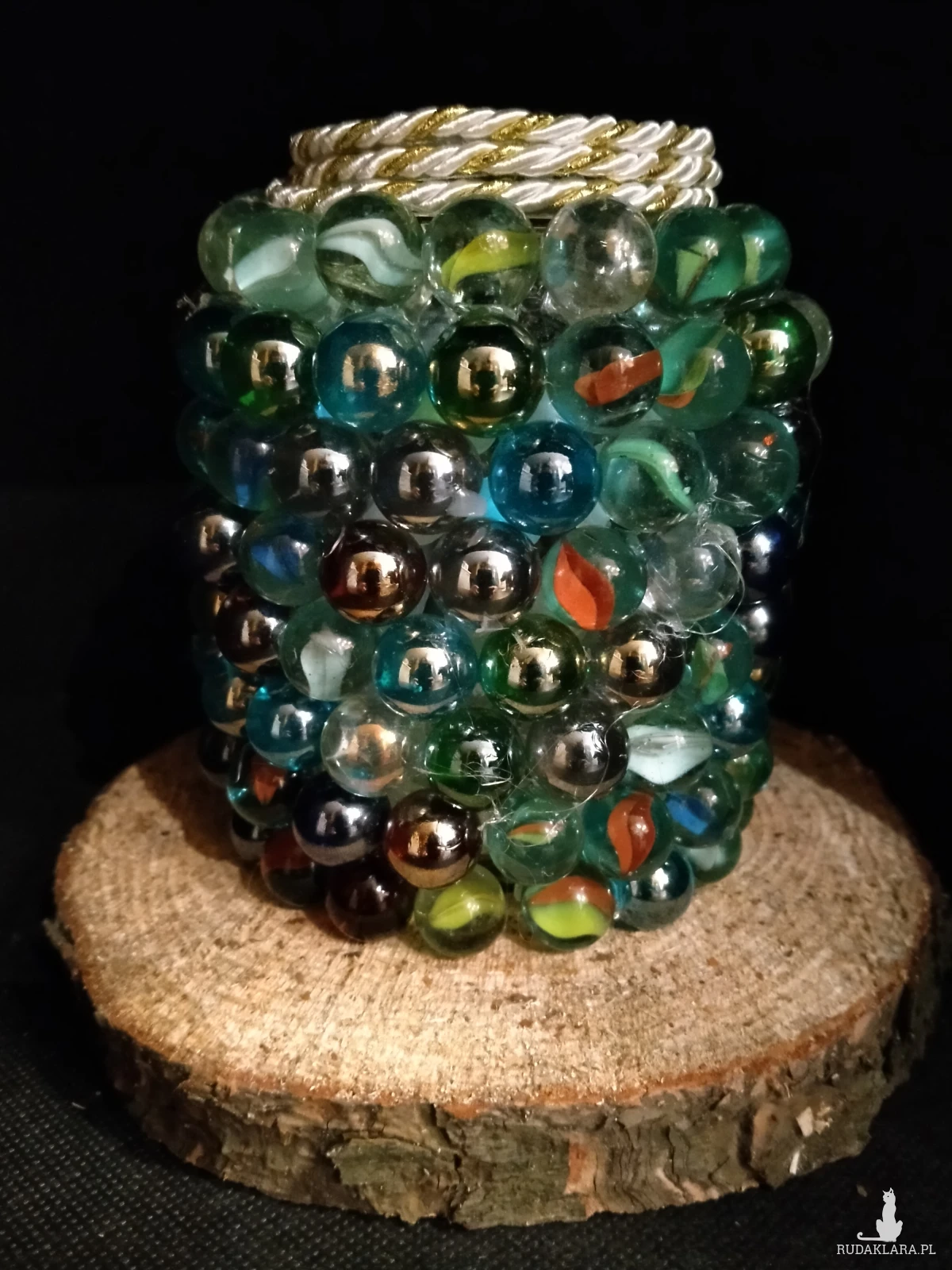 Ręcznie dekorowany lampion ze szklanego słoika, do dekoracji wykorzystałam szklane kulki dekoracyjne,