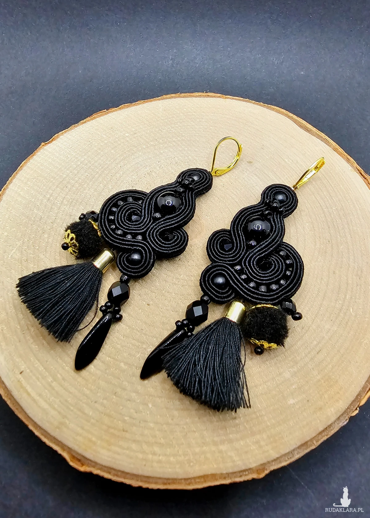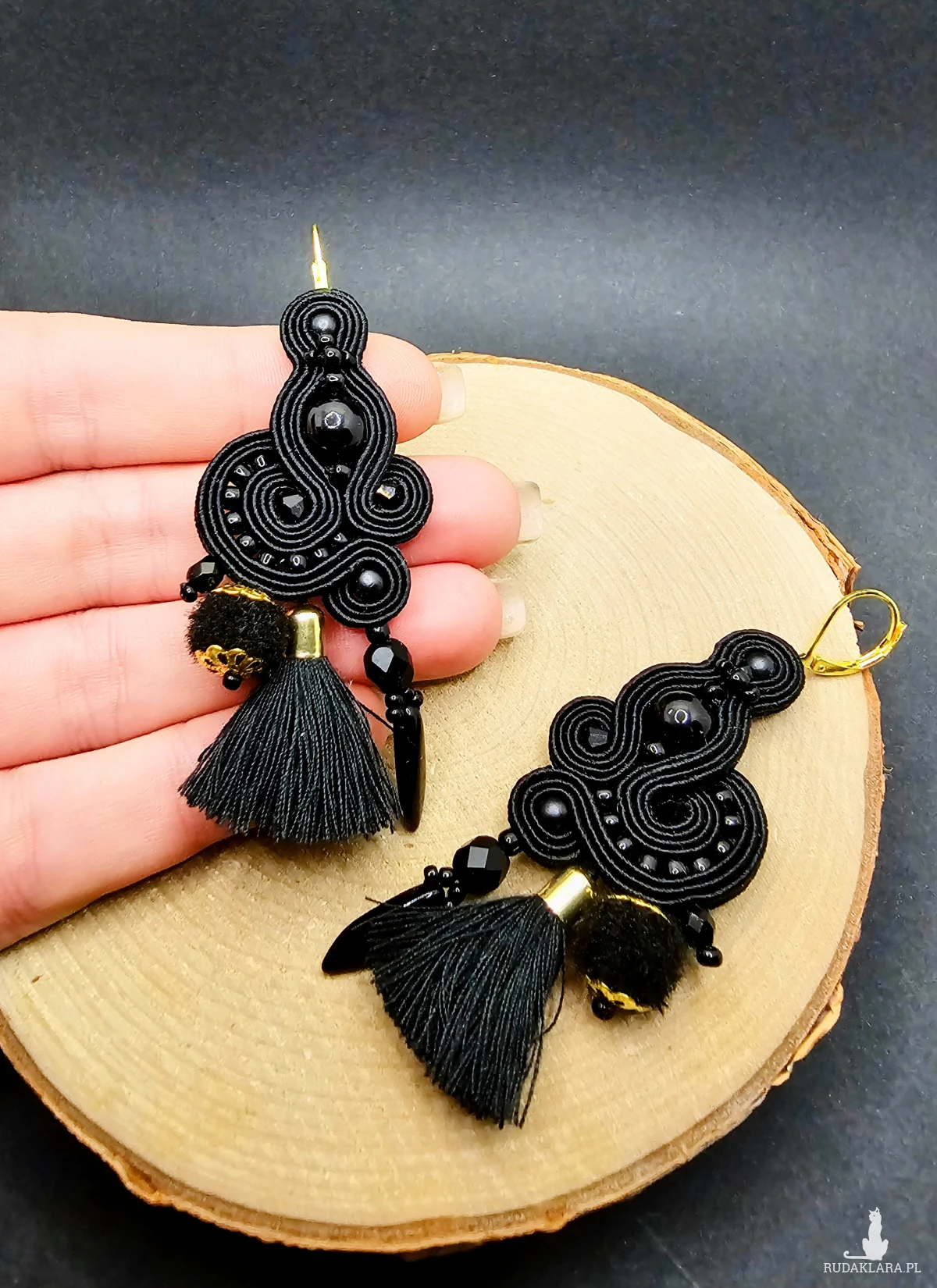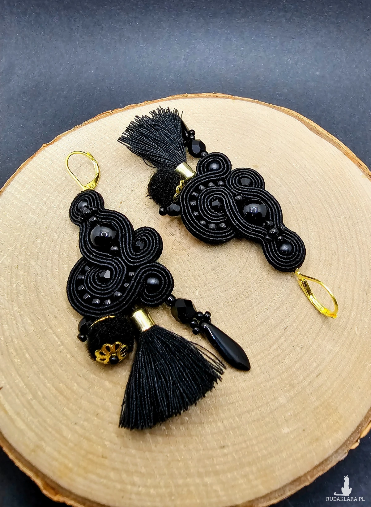 Czarne szklane kulki otoczone sznurkami sutasz oraz japońskimi koralikami TOHO i niewielkimi kryształkami. Dół kolczyków ozdobiony szklanymi koralikami, chwostami w złotej oprawie oraz pomponami. Kolczyki zawieszone na biglach angielskich w kolorze złotym.