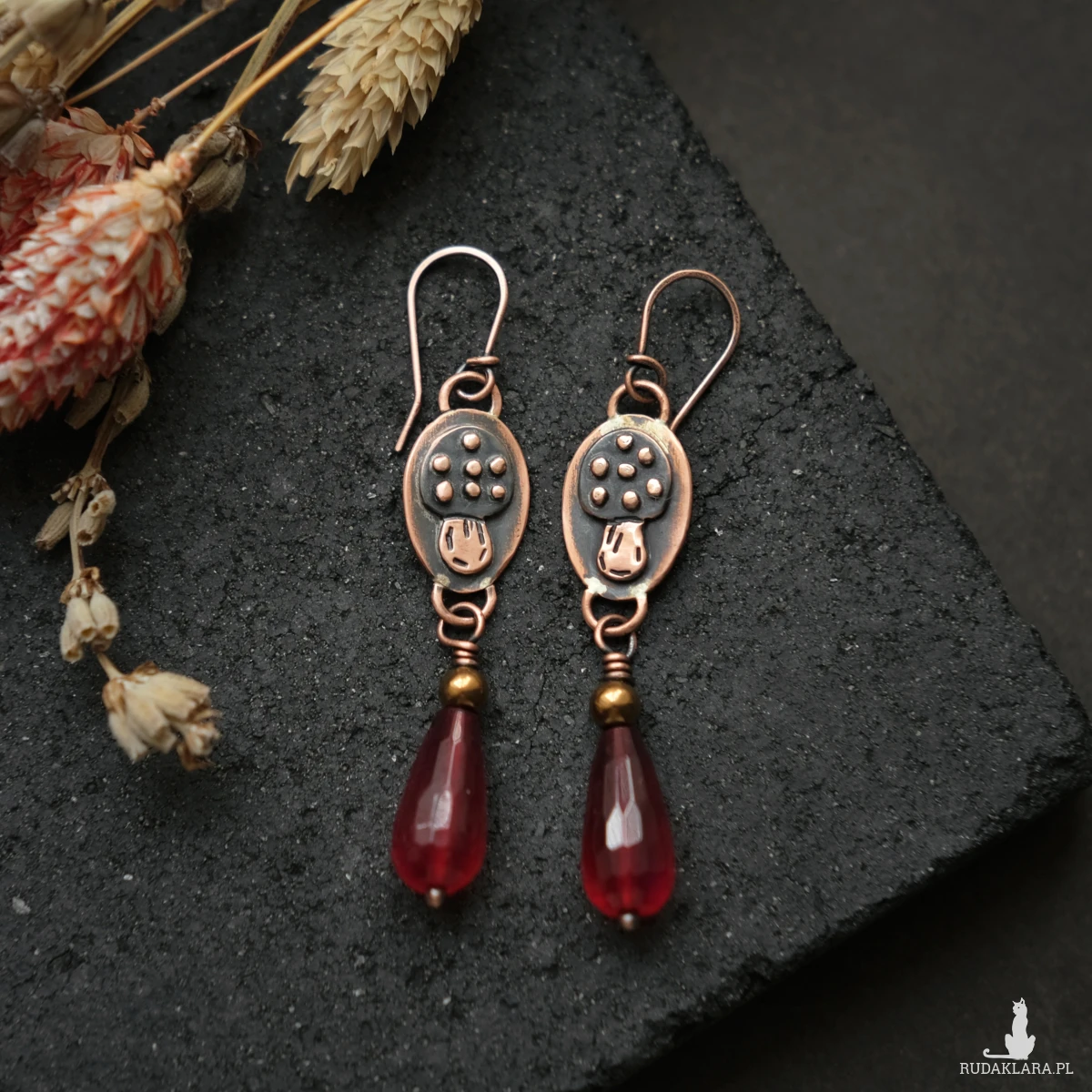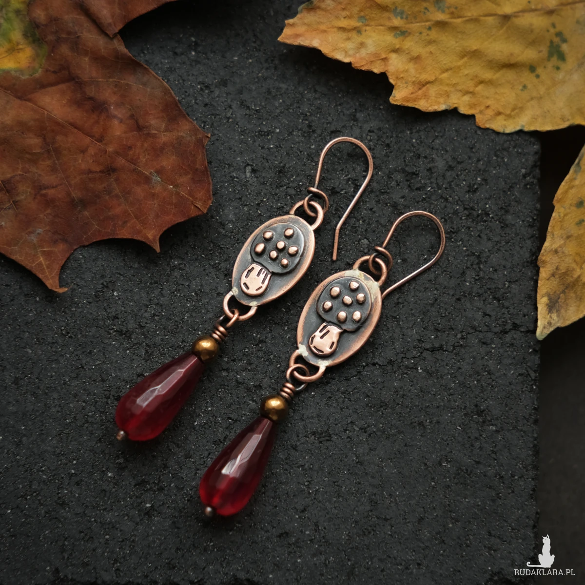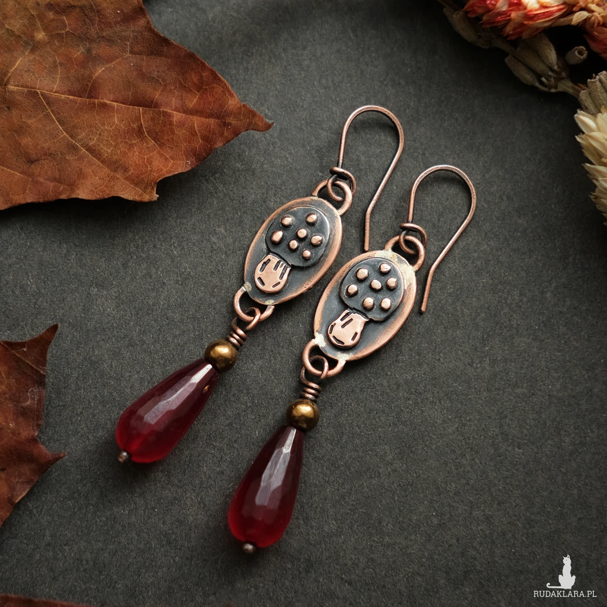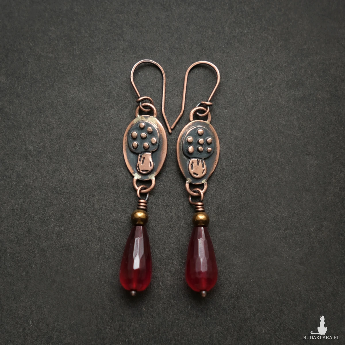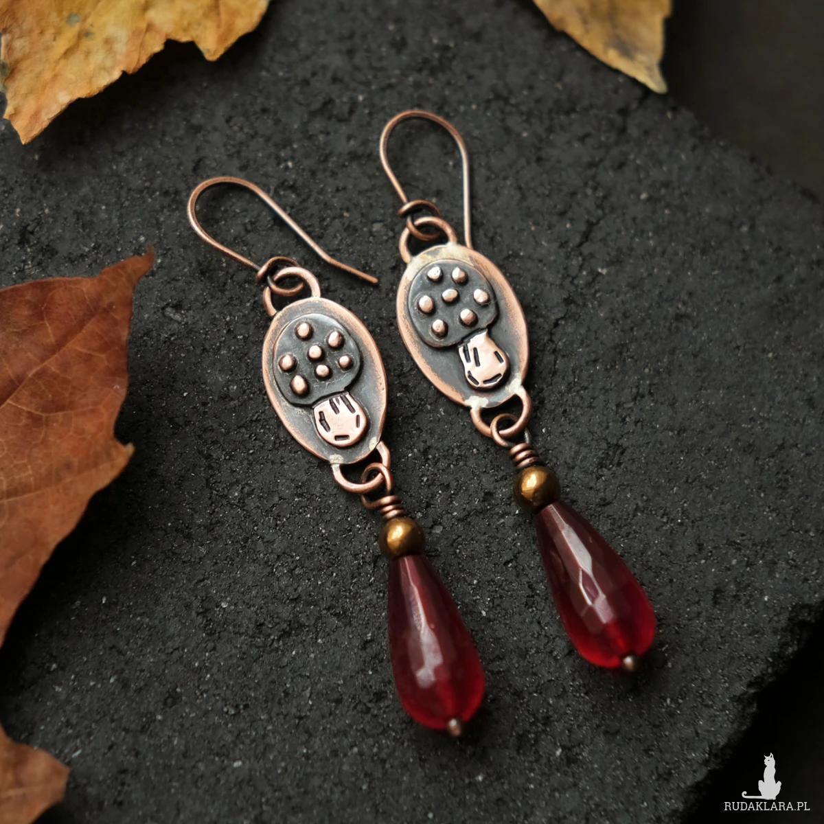 Miedziane unikatowe kolczyki z muchomorkami. Urocze i delikatne w bajkowym leśnym klimacie, posiadają kamienie agatu w kształcie długiej kropli (barwione na czerwono) oraz hematyt w miedzianym kolorze. Kolczyki sprawdzą się na co dzień, są bowiem leciutkie, jak i na większe okazje. Idealna propozycja dla fanek przyrody, grzybobrania i leśnych wojaży :-)