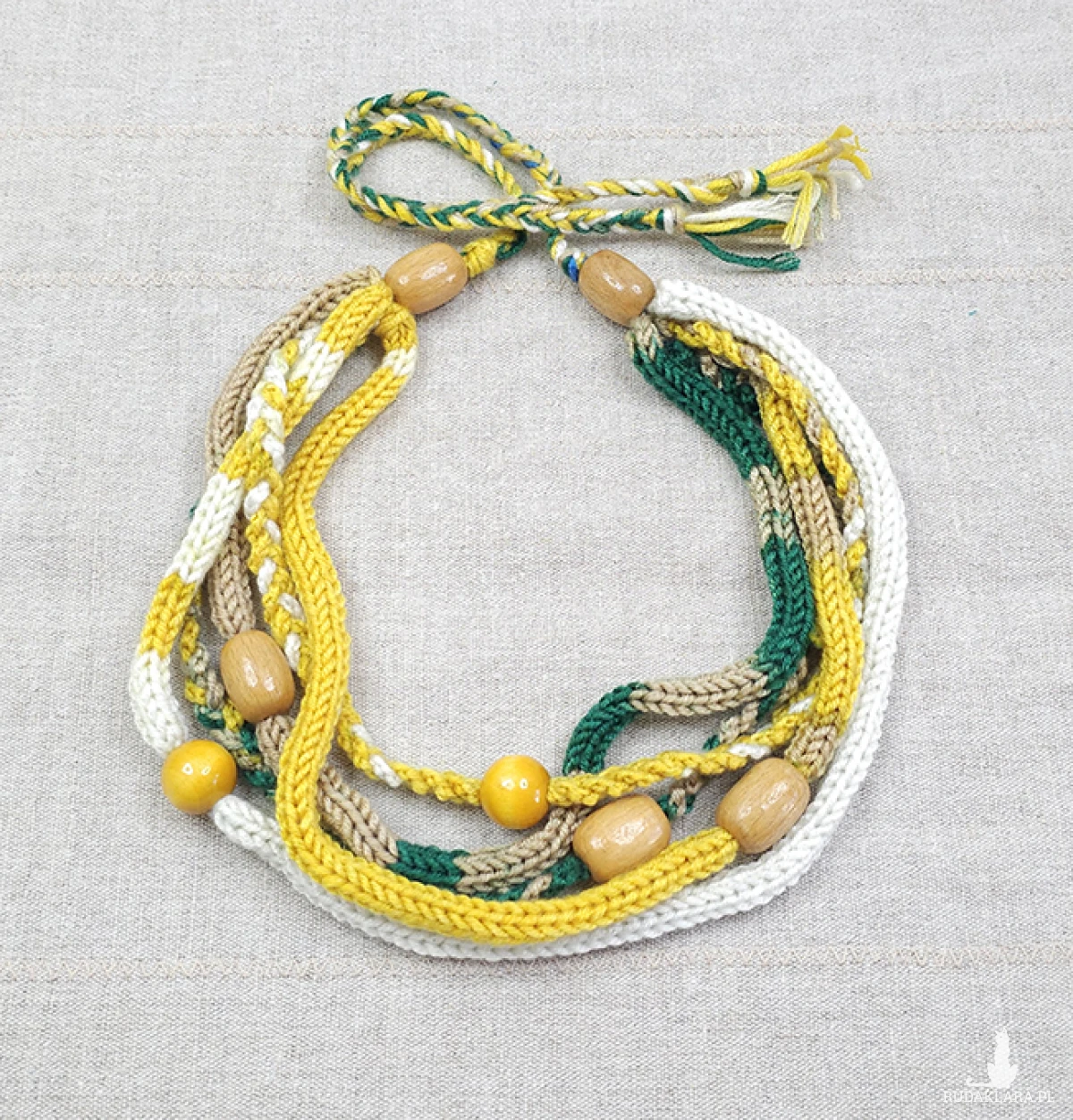 Naszyjnik składa się z 5 sznurków i jest do samodzielnego wiązania, co daje Ci swobodę w dopasowaniu długości (obwód min. 50 cm, max. 75 cm).