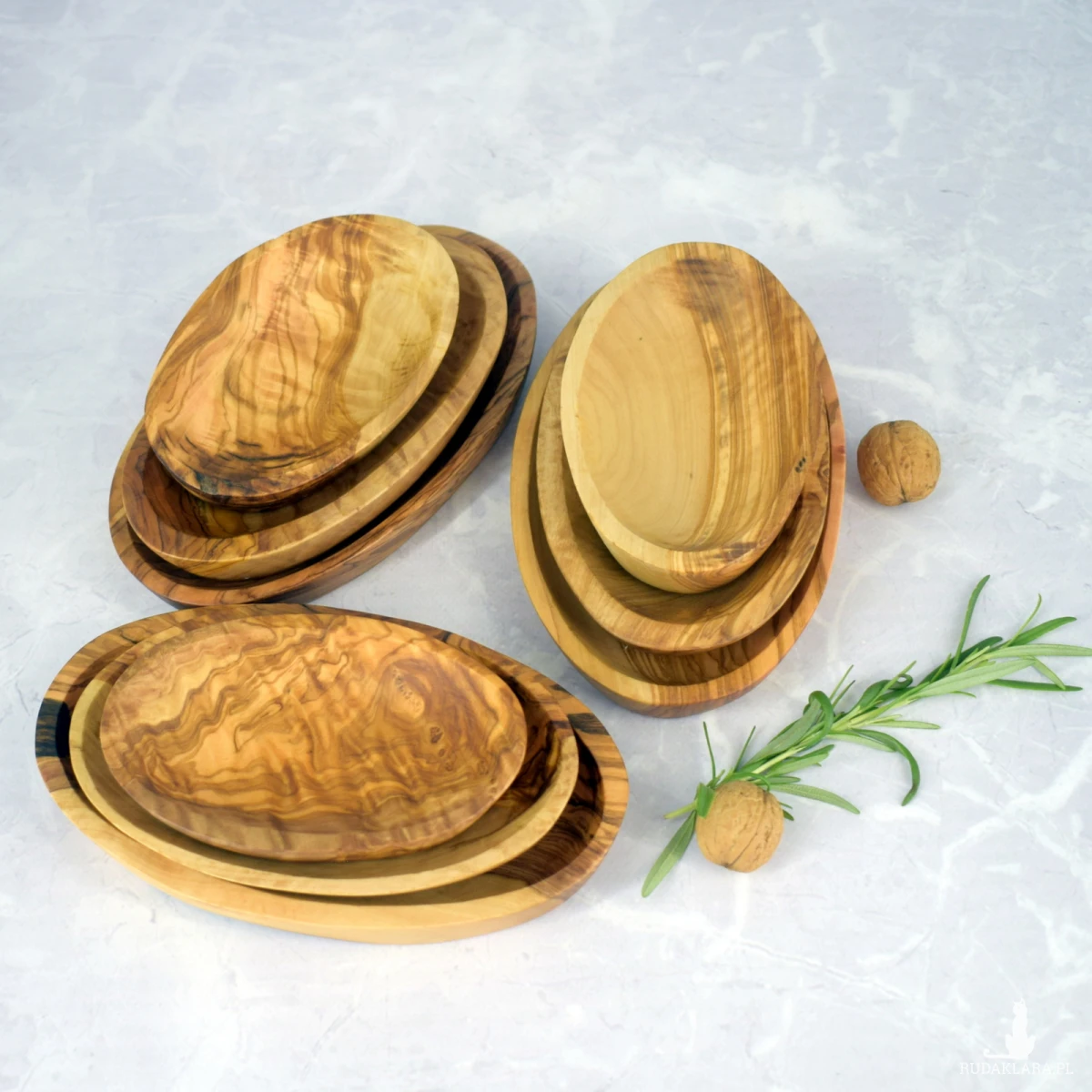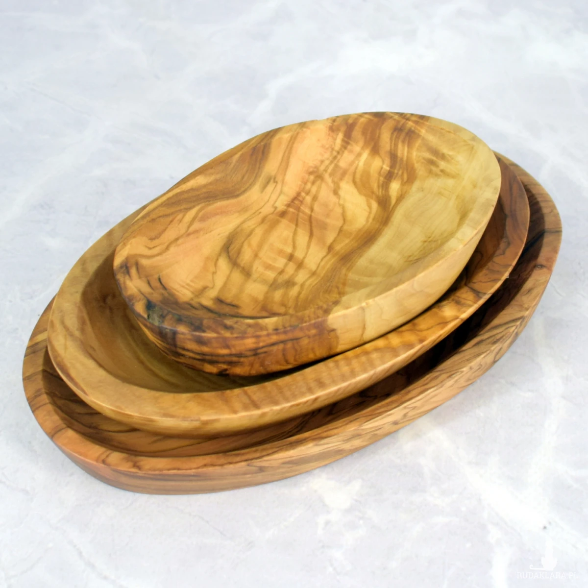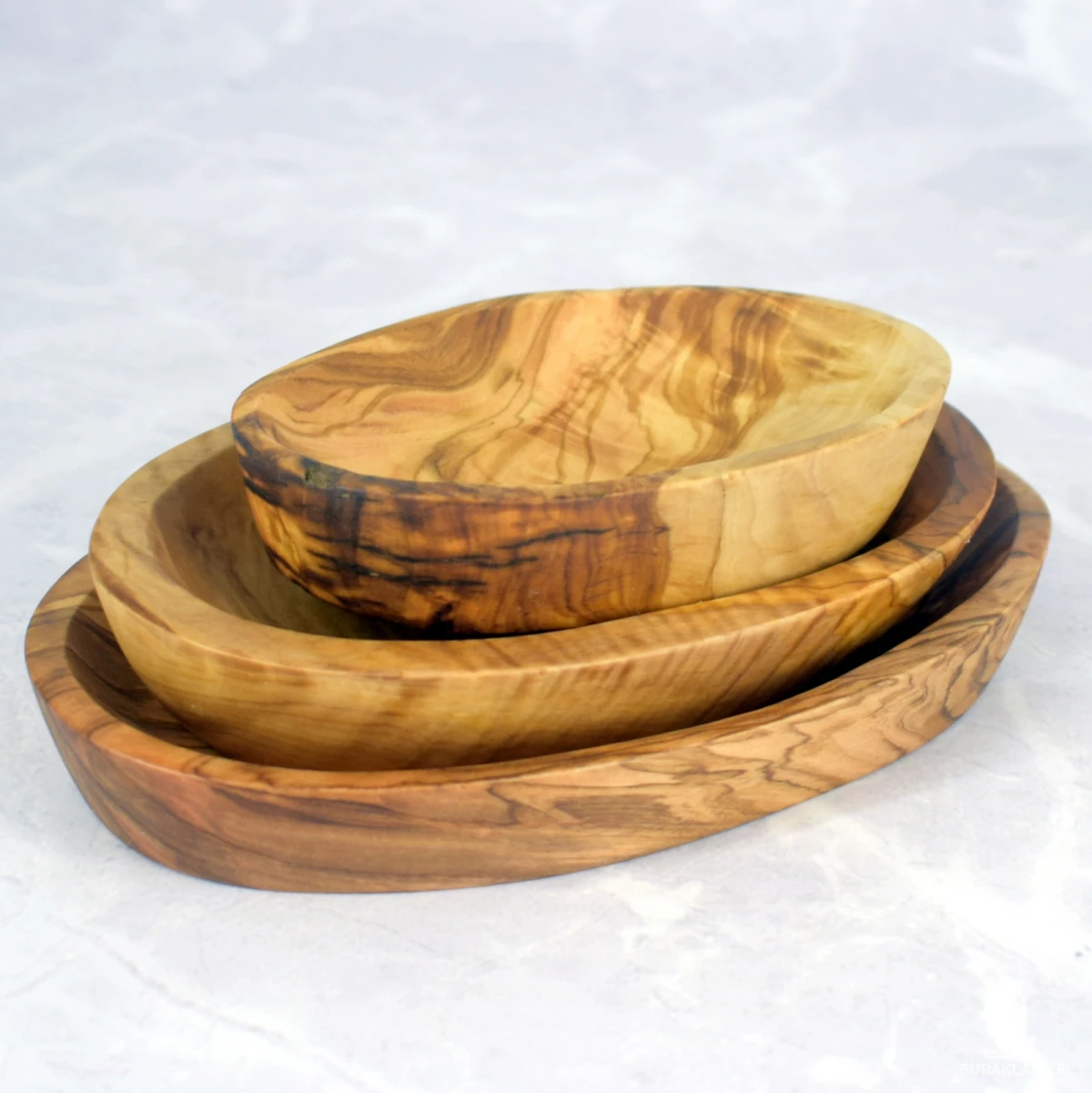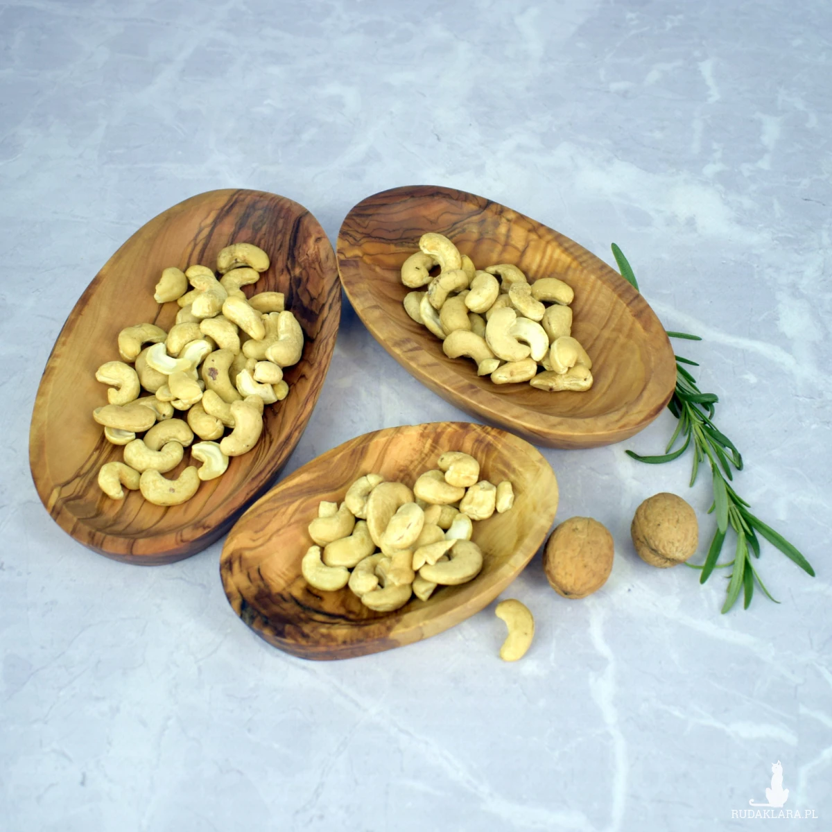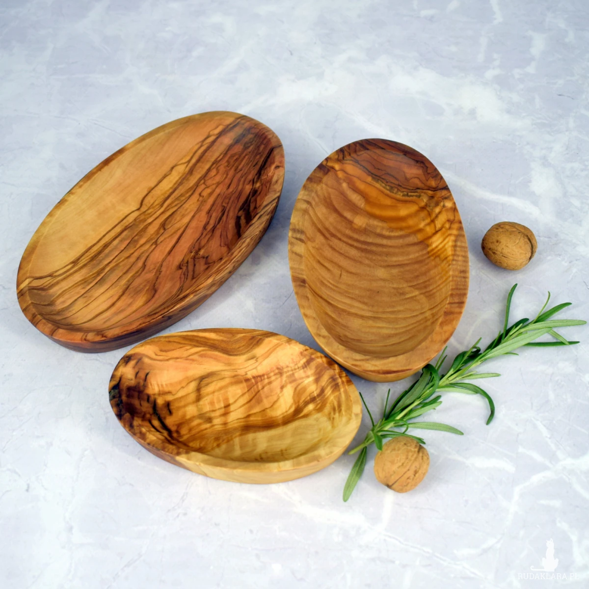 Zestaw trzech miseczek owalnych, idealnych do serwowania przekąsek, oliwek czy sosów. Doskonale sprawdzą się na przyjęciach oraz jako elegancka dekoracja kuchni czy jadalni. Wykonane z naturalnego drewna oliwnego, w 100% ekologiczne.