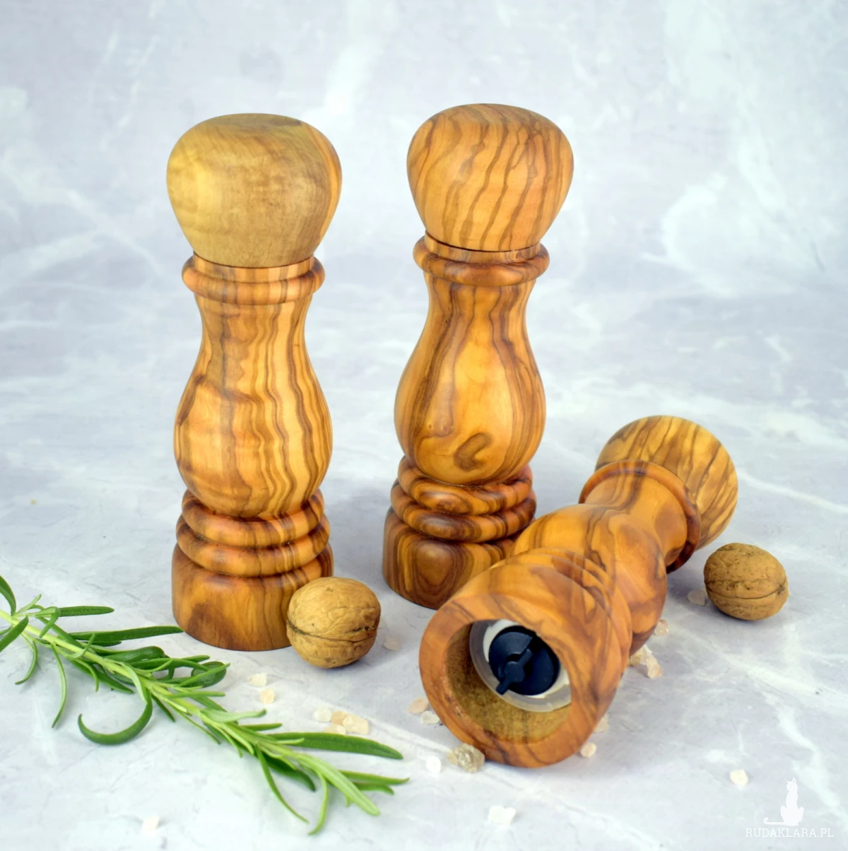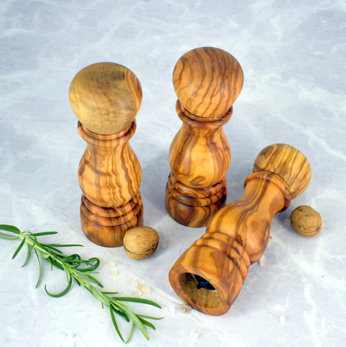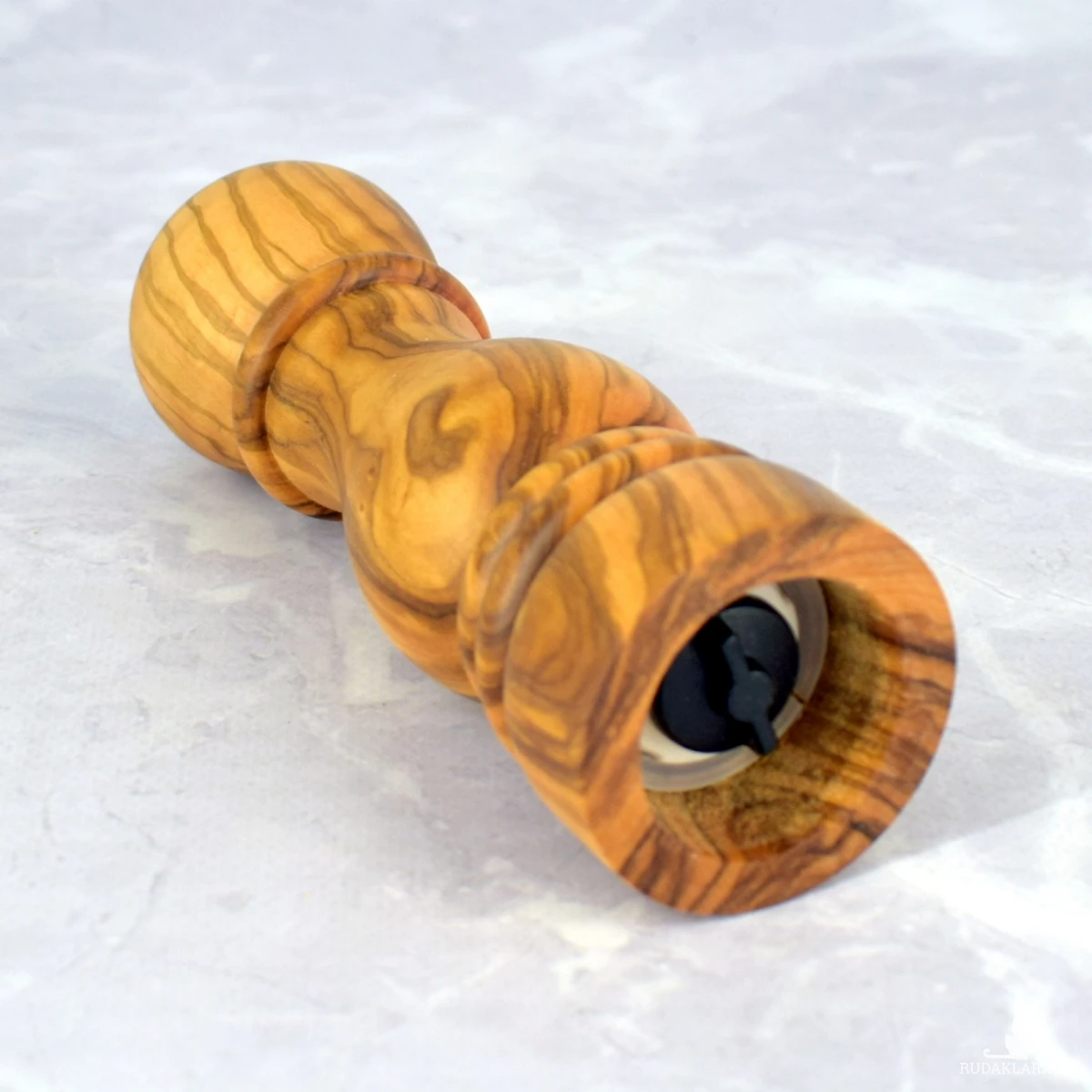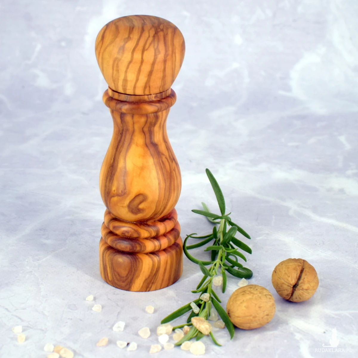 Ręczny młynek do pieprzu, soli oraz suszonych ziół, wykonany z jednego kawałka drewna oliwnego. Naturalne usłojenie sprawia, że każdy egzemplarz jest unikalny i przyciąga wzrok swoim szlachetnym wyglądem. Wyposażony w trwały ceramiczny mechanizm mielący, który nie koroduje i nie wpływa na smak przypraw. Górna część młynka łatwo się zdejmuje, umożliwiając szybkie i wygodne uzupełnienie przypraw.