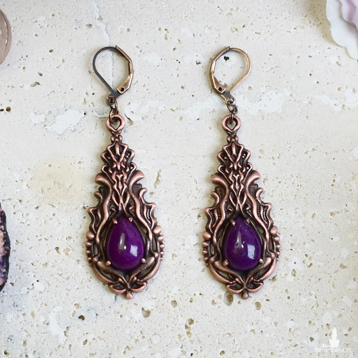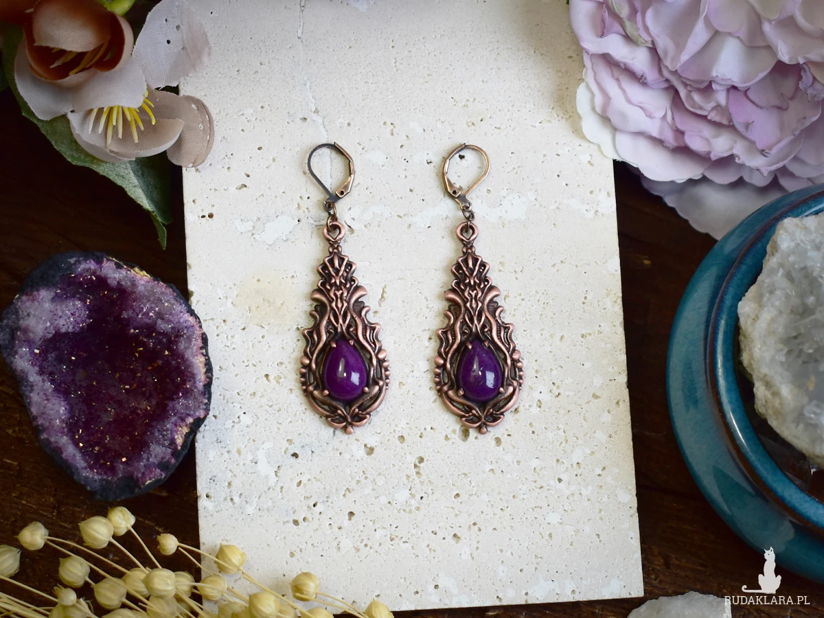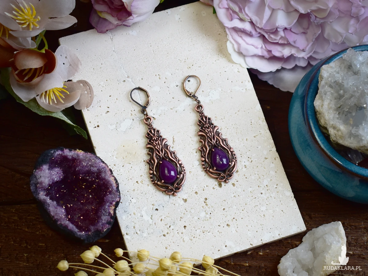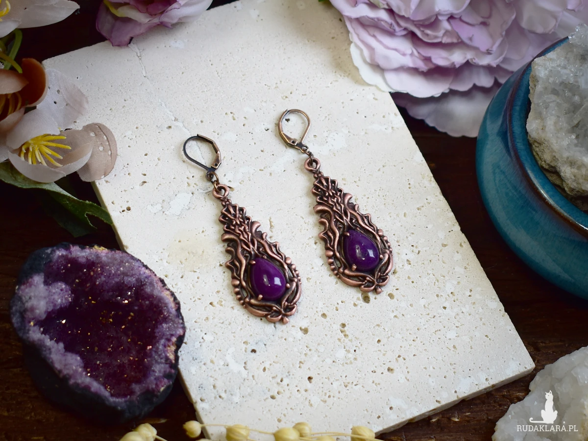 Kolczyki miedziane z fioletowym jadeitem to unikalna biżuteria w stylu wiktoriańskim i gotyckim. Wykonane metodą elektroformowania, charakteryzują się delikatnymi detalami, które nadają im wyjątkowy charakter. Fioletowy jadeit w połączeniu z miedzianą oprawą tworzy elegancki kontrast, idealny na specjalne okazje. To doskonały wybór na prezent dla miłośników biżuterii w vintage i gotyckim stylu. Kolczyki są lekkie, trwałe i stanowią piękny dodatek do każdej stylizacji, zarówno na co dzień, jak i na wyjątkowe wydarzenia.