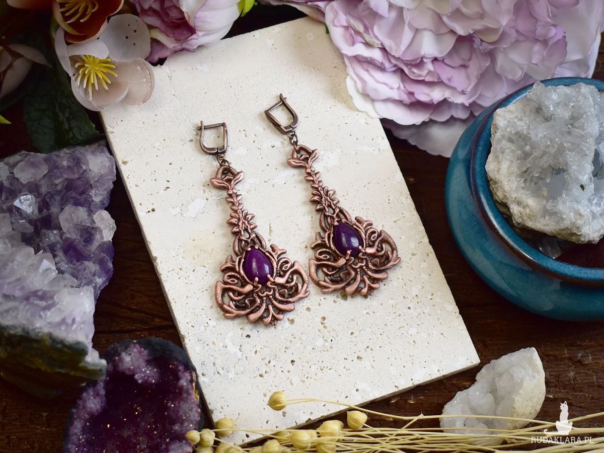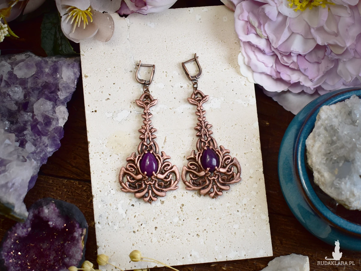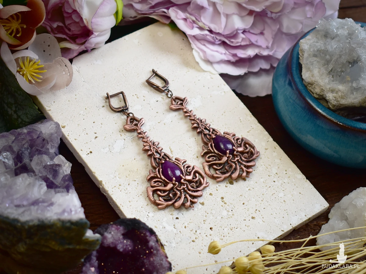 Kolczyki miedziane z fioletowym jadeitem to unikalna biżuteria w stylu wiktoriańskim i gotyckim. Wykonane metodą elektroformowania, charakteryzują się delikatnymi detalami, które nadają im wyjątkowy charakter. Fioletowy jadeit w połączeniu z miedzianą oprawą tworzy elegancki kontrast, idealny na specjalne okazje. To doskonały wybór na prezent dla miłośników biżuterii w vintage i gotyckim stylu. Kolczyki są lekkie, trwałe i stanowią piękny dodatek do każdej stylizacji, zarówno na co dzień, jak i na wyjątkowe wydarzenia.
