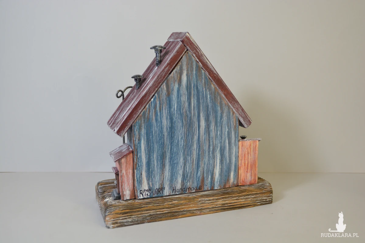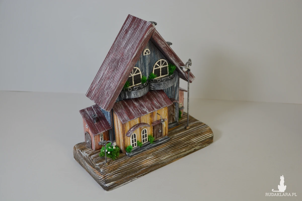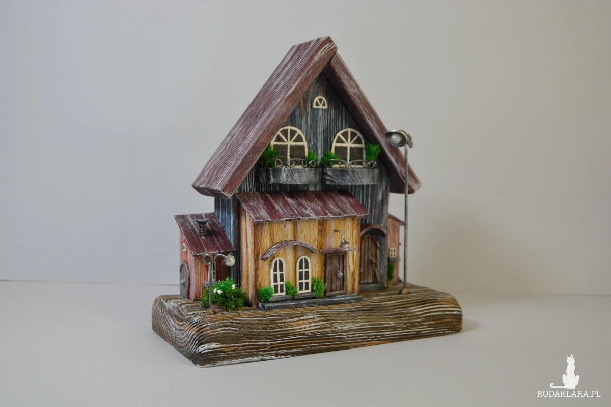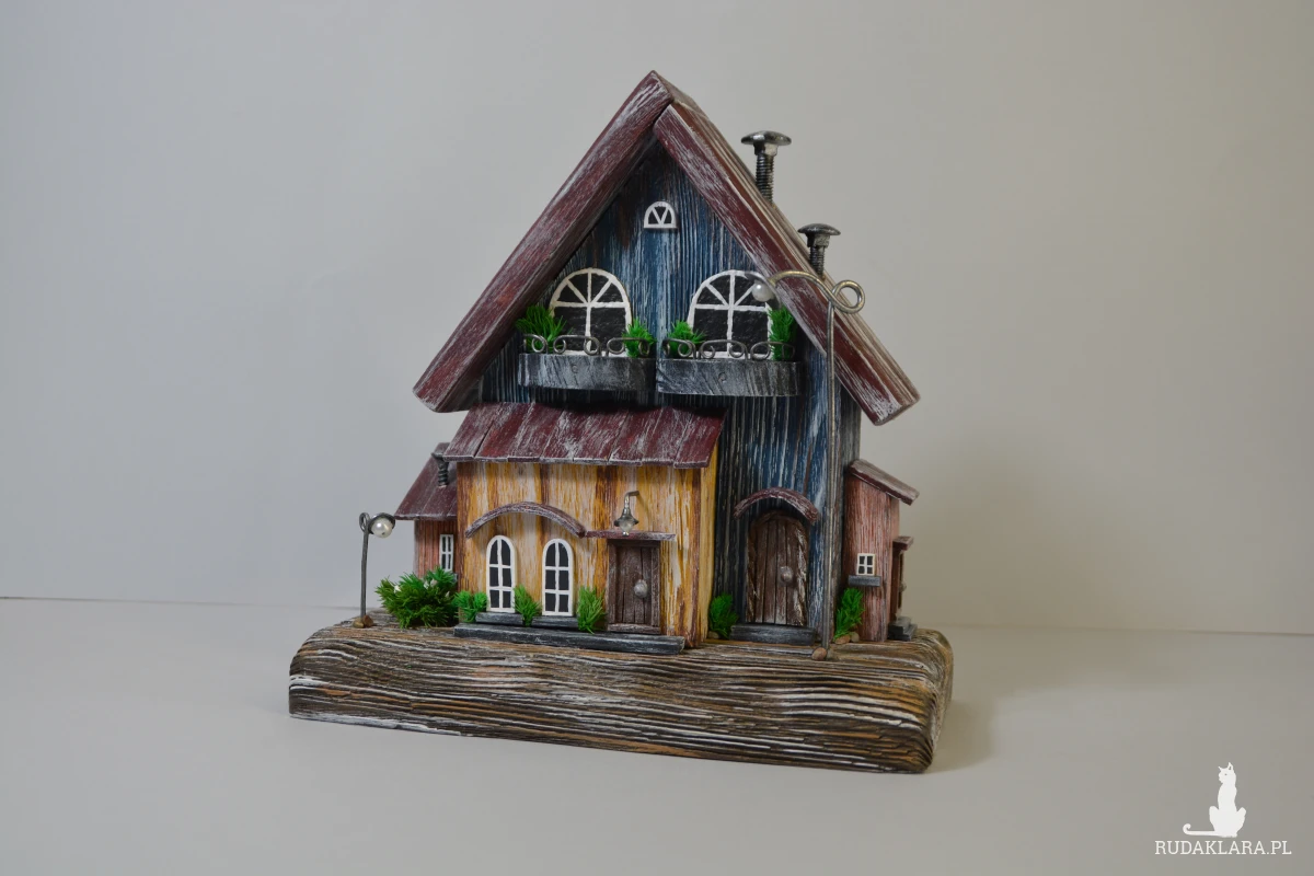 Ten ręcznie wykonany domek z drewna to wyjątkowa dekoracja, która wprowadza ciepły, bajkowy klimat do każdego wnętrza. Starannie wykonany z naturalnych materiałów, ozdobiony drobnymi detalami – okienkami, balkonami i mini roślinkami. Idealny jako ozdoba półki, komody czy parapetu. Świetny pomysł na prezent dla miłośników natury i stylu rustykalnego.