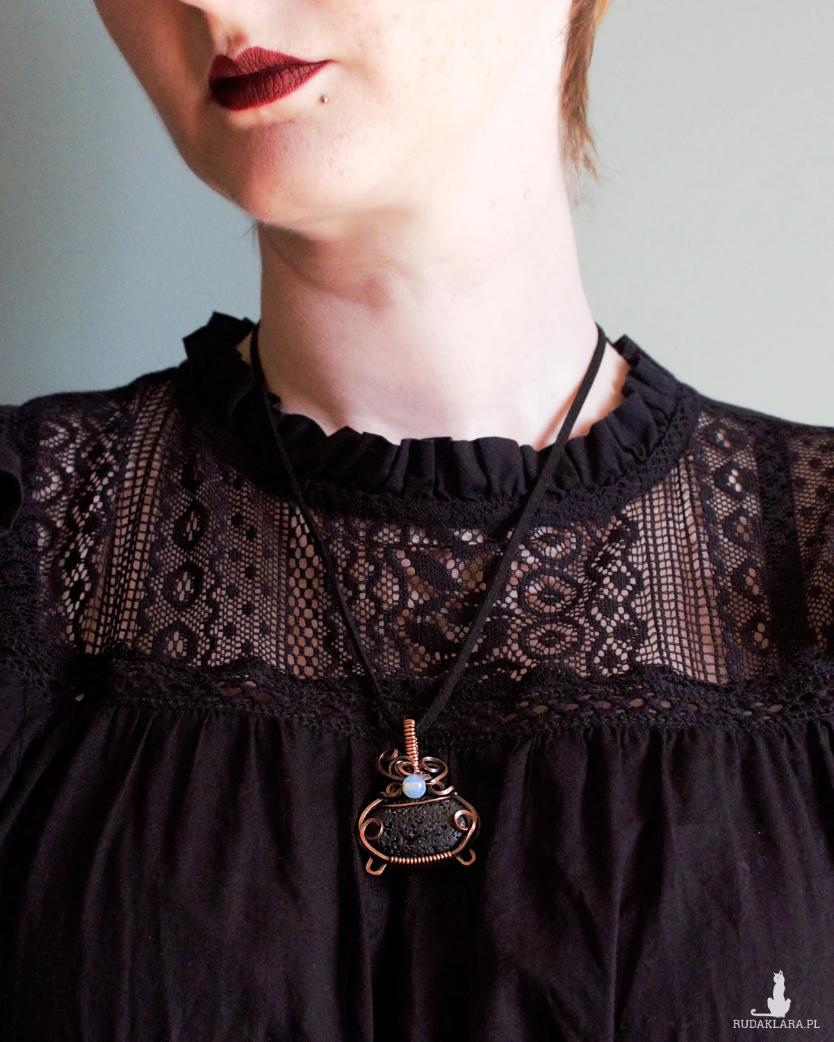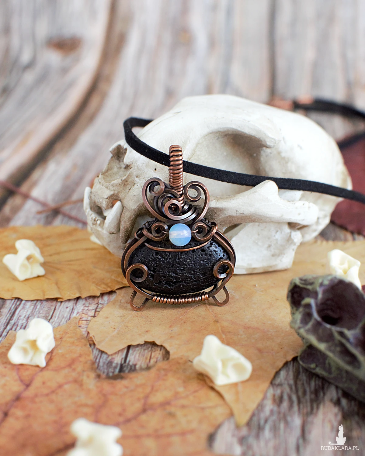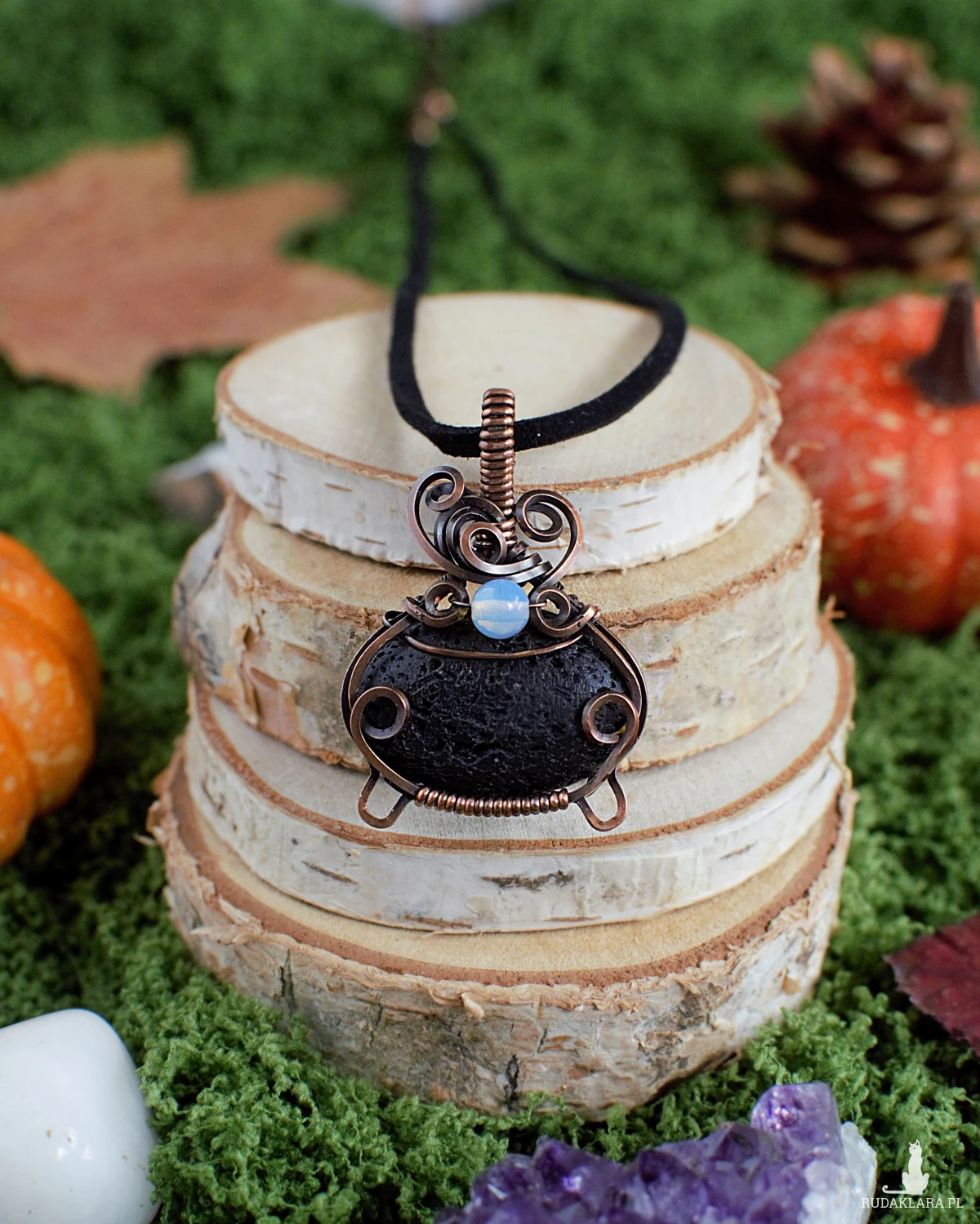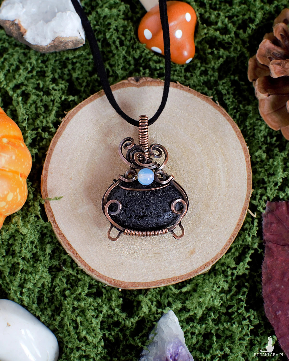 Kamień wulkaniczny stanowiący główną część kociołka wiedźmy został wzbogacony o miedziane zawijasy i pętle oraz koralik z opalitu, mające przypominać parę i bąbelki unoszące się nad naczyniem. Bo jak wiadomo, w kociołku prawdziwej wiedźmy zawsze dużo się dzieje :)