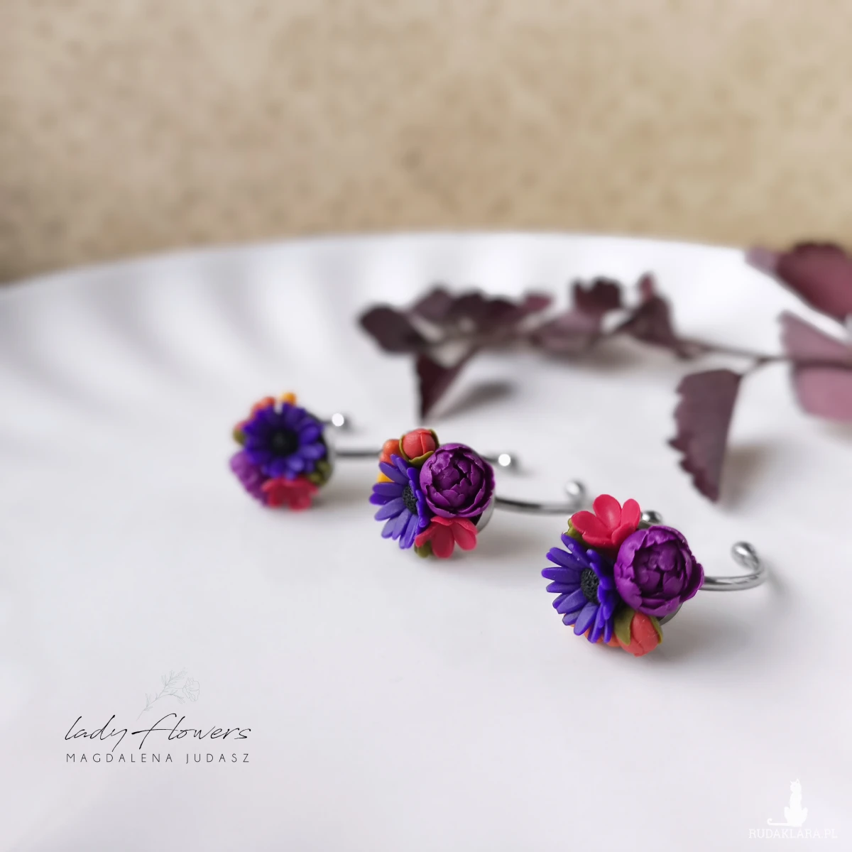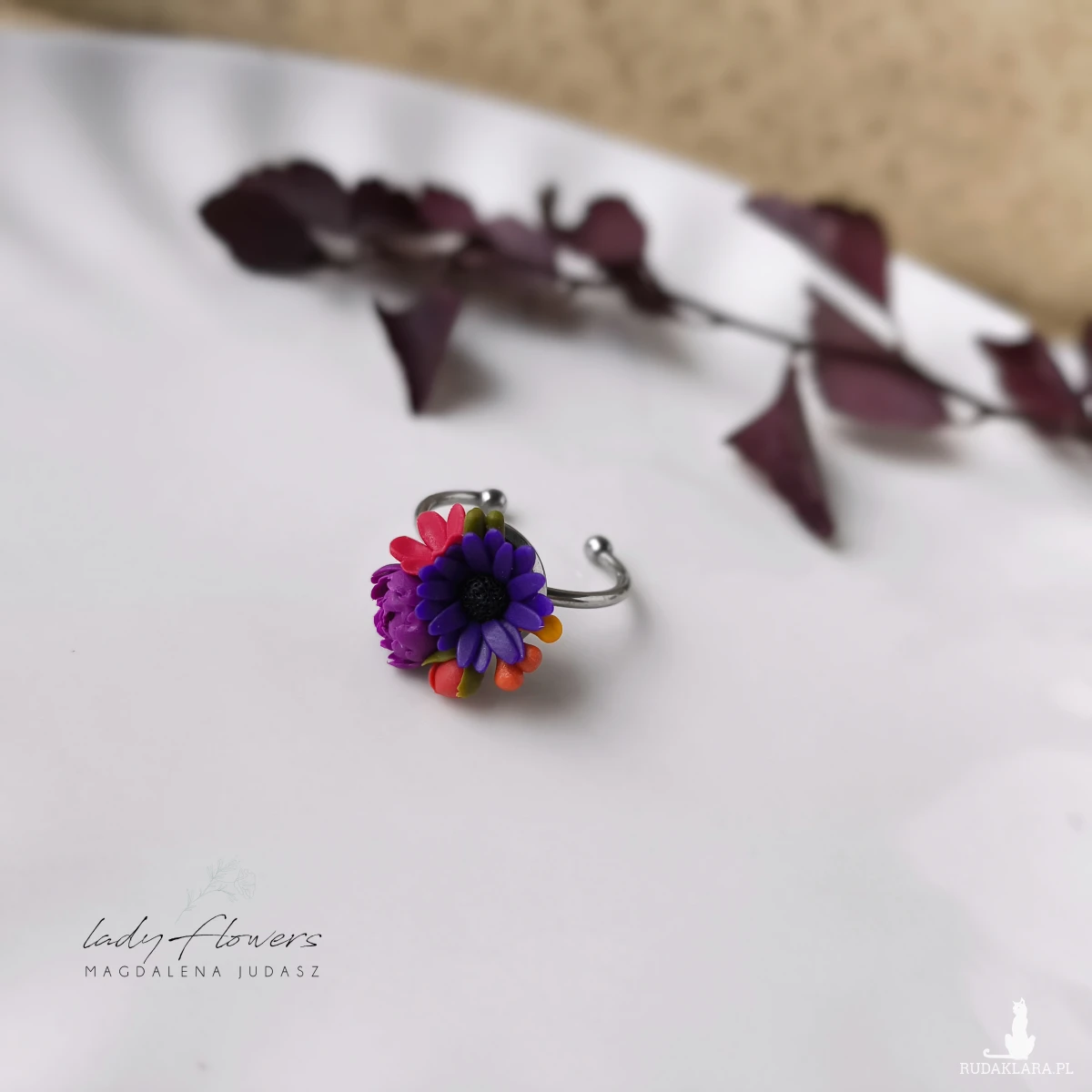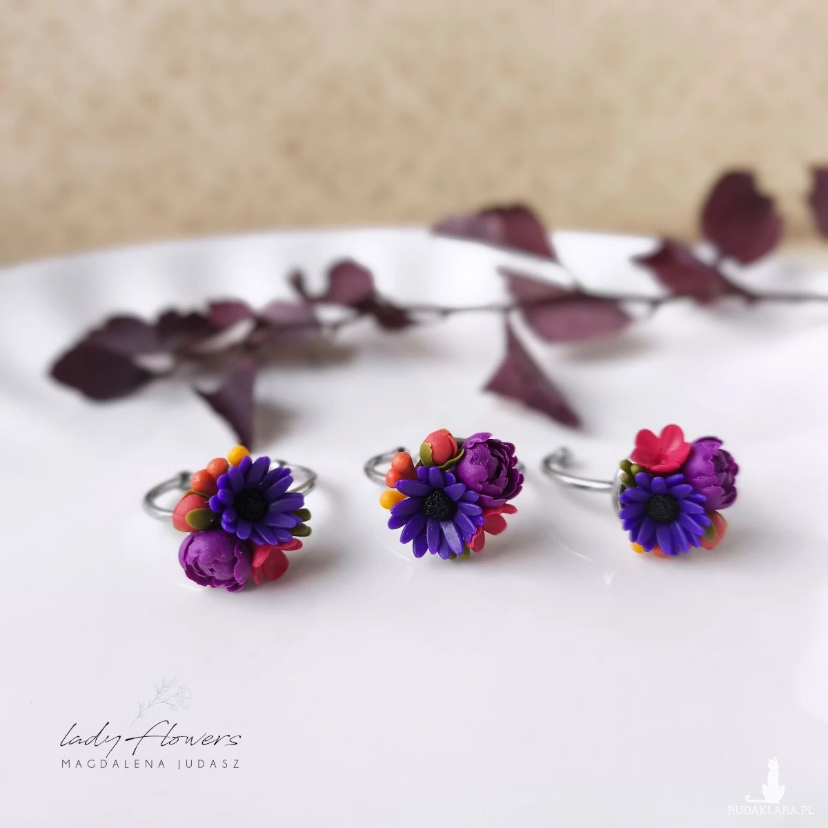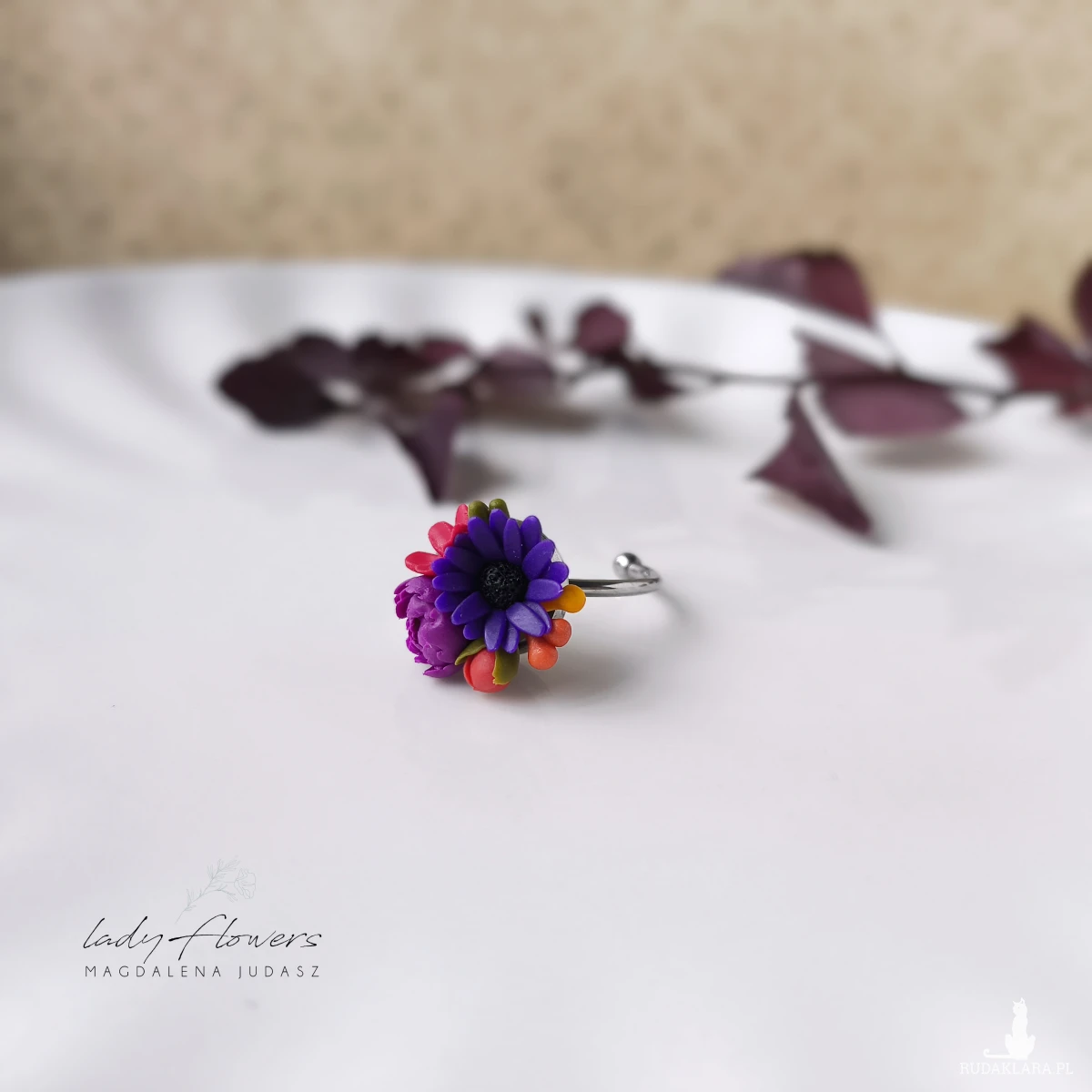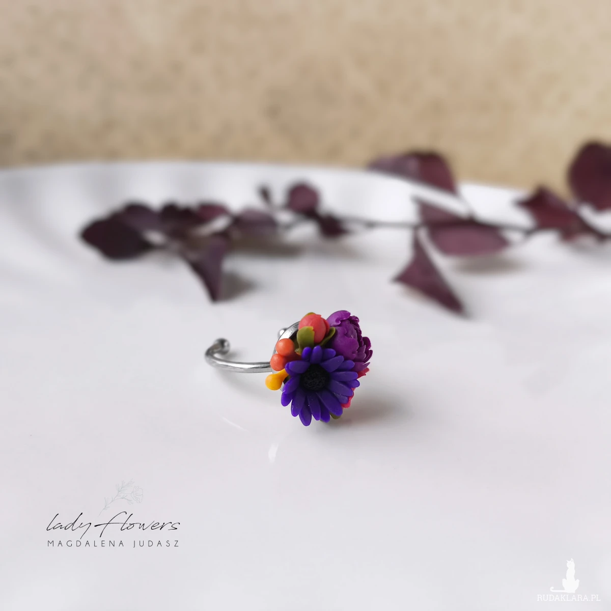 Pierścionek z ręcznie wykonanymi kwiatami z profesjonalnej masy termoutwardzalnej.