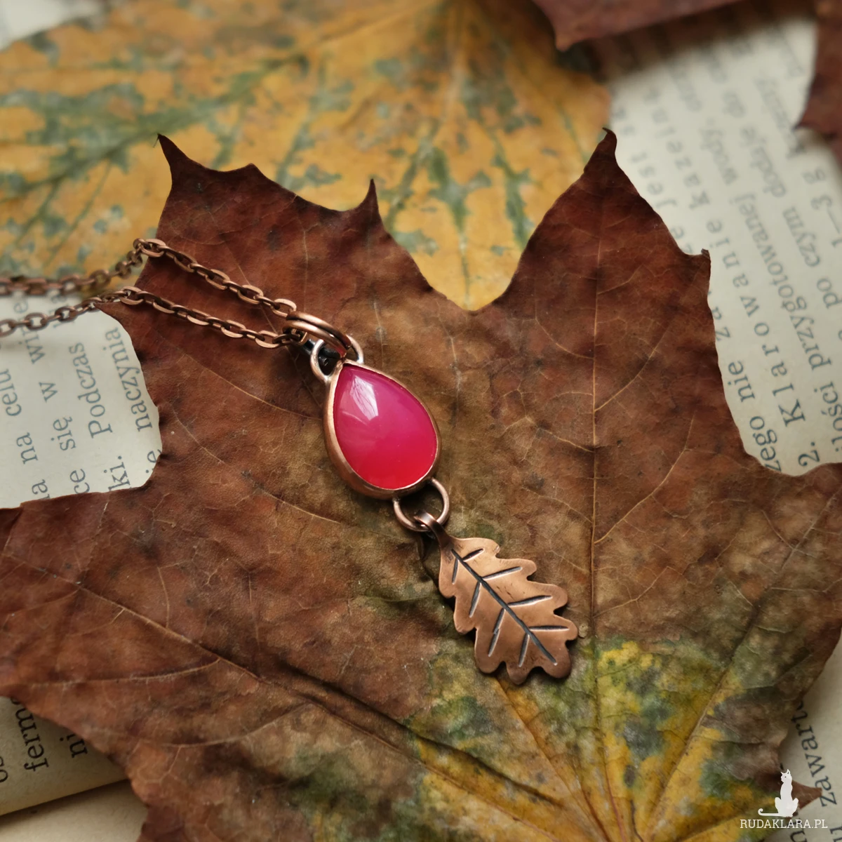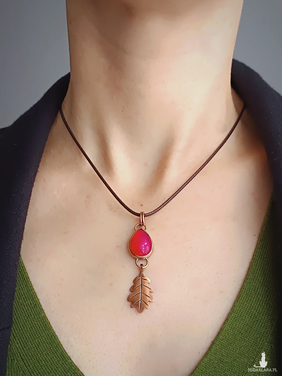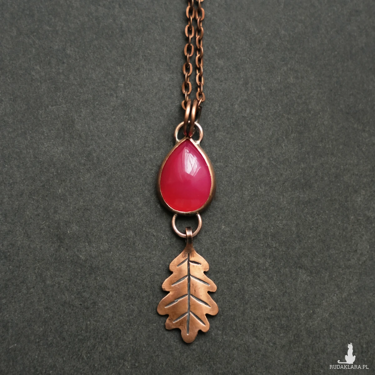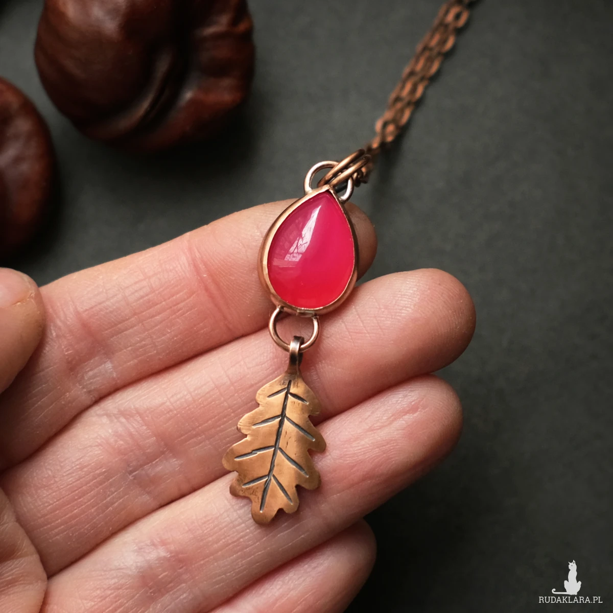 Miedziany wisiorek z listkiem dębu mieści w sobie kamień agatu brazylijskiego o mocnym różowym kolorze (kamień barwiony). Wszystkie elementy zostały stworzone ręcznie, co nadaje mu oryginalnego leśnego charakteru. Wisiorek ma naniesioną patynę. Idealnie sprawdzi się na dekolcie miłośniczki natury, ceniącej wyroby rękodzielnicze oraz delikatną biżuterię.