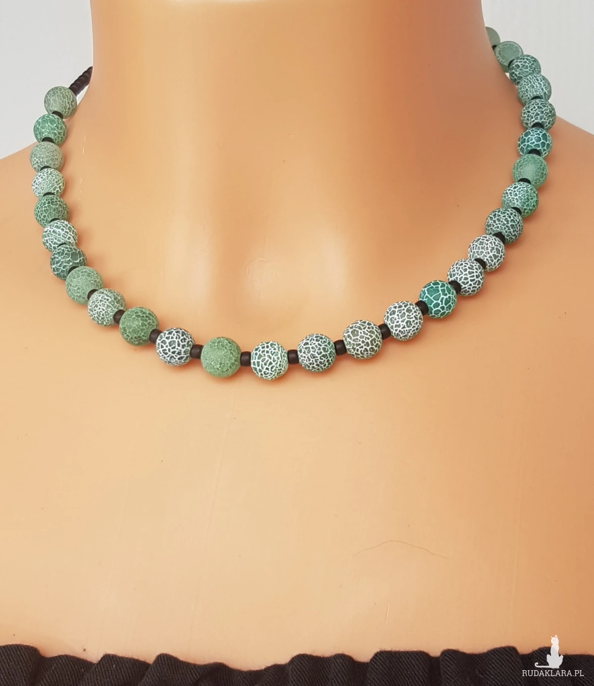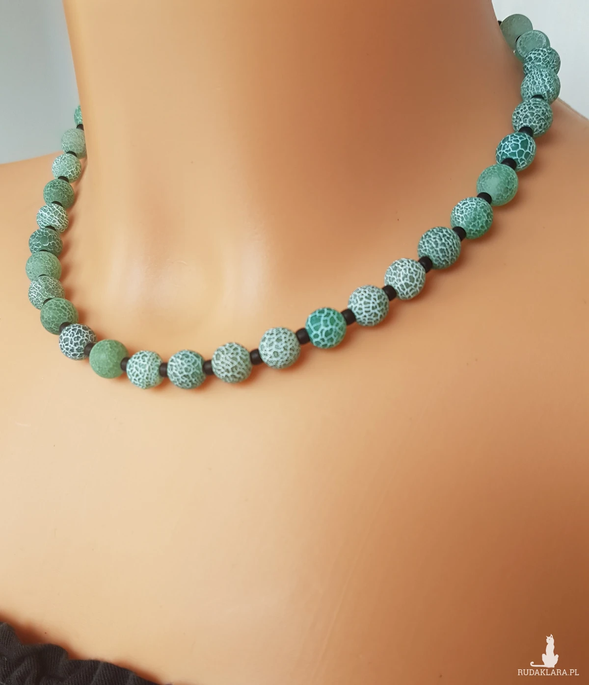 Naszyjnik z kul 8 mm agatu trawionego i małych, matowych koralików szklanych w kolorze czarnym. Naszyjnik jest krótki. Objętość wynosi 39 cm plus 2 cm łańcuszka, zapięcie stal w kolorze srebrnym.