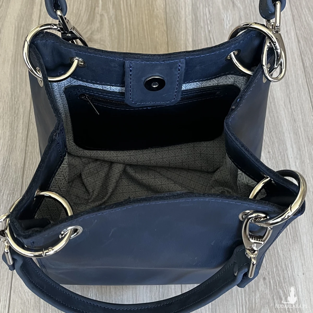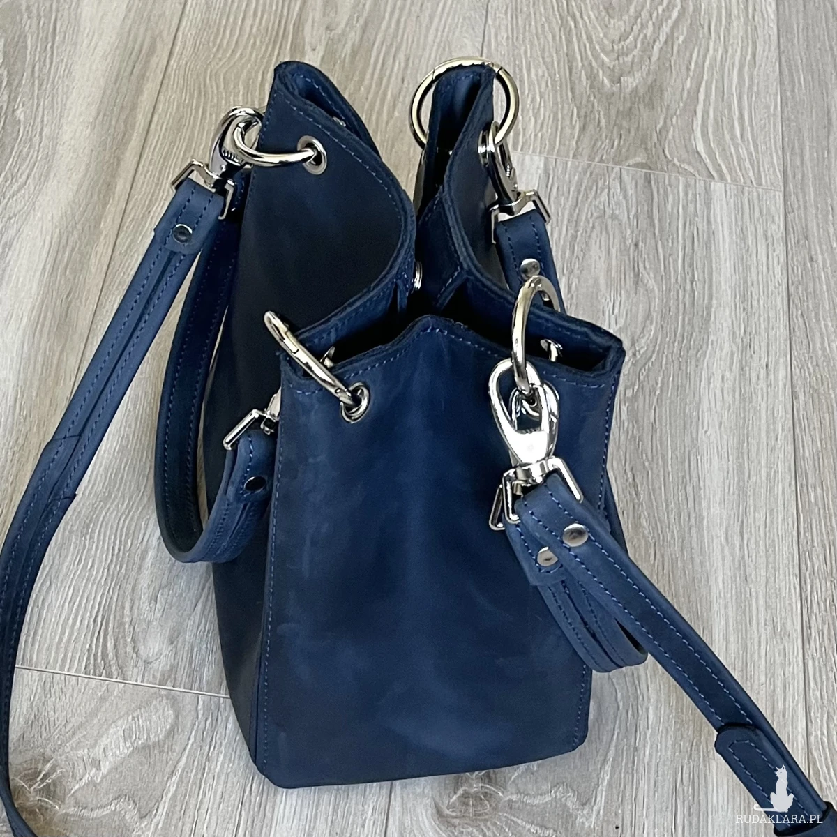 Niebieska torebka damska wyposażona w dwie odpinane skórzane rączki oraz długi regulowany odpinany skórzany pasek.