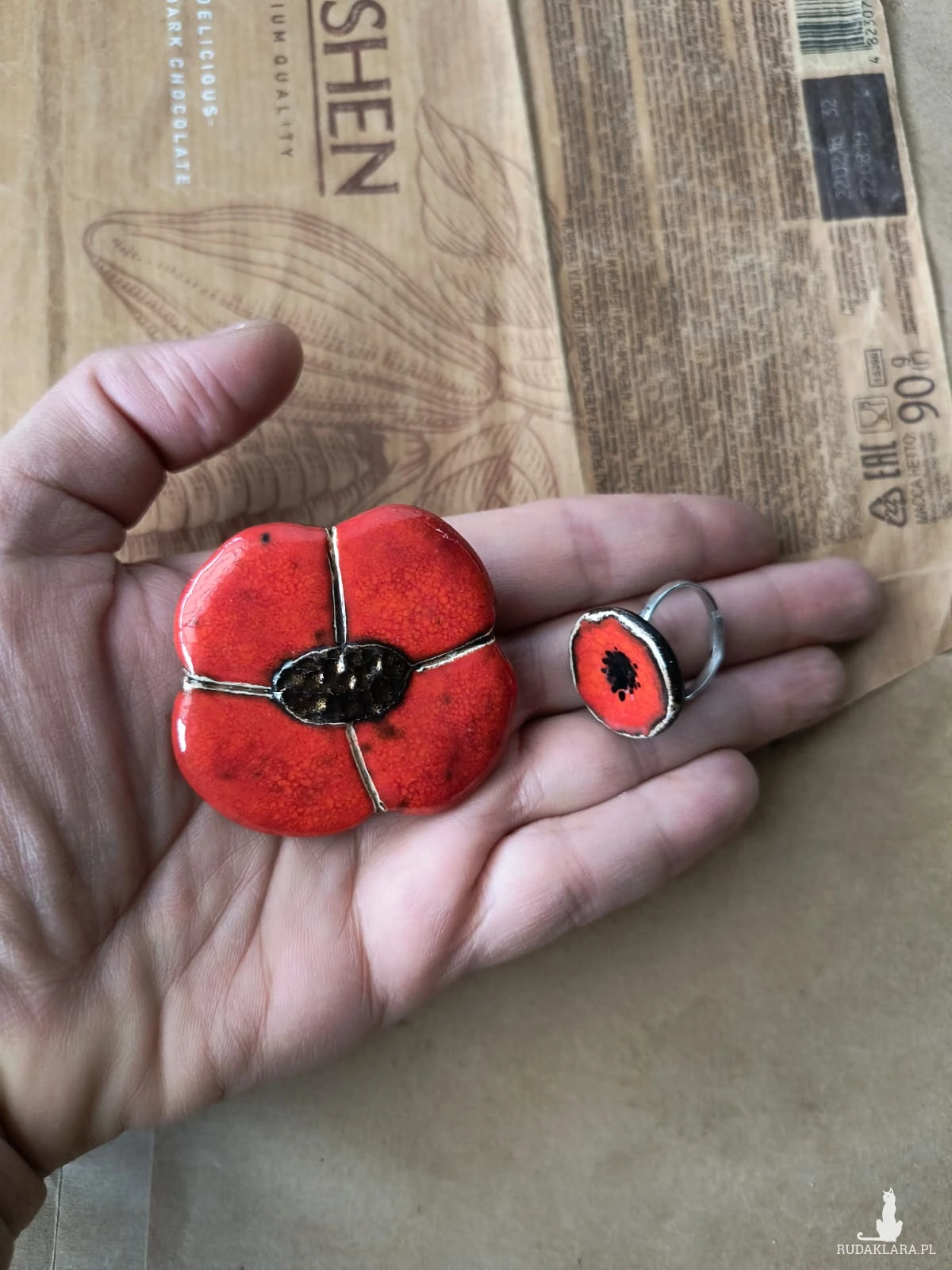 Broszka ceramiczna w postaci maku o wymiarach ok 5 cm x 4,5 cm, wykonana z gliny szamotowej wypalona na biskwit, a następnie szkliwiona w temp ok 1260 stopni C. Pierścionek regulowany o średnicy ok 1,5 cm. polecam serdecznie.