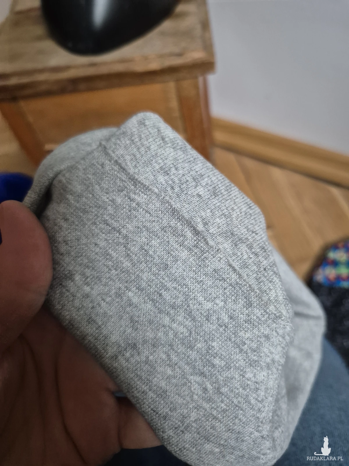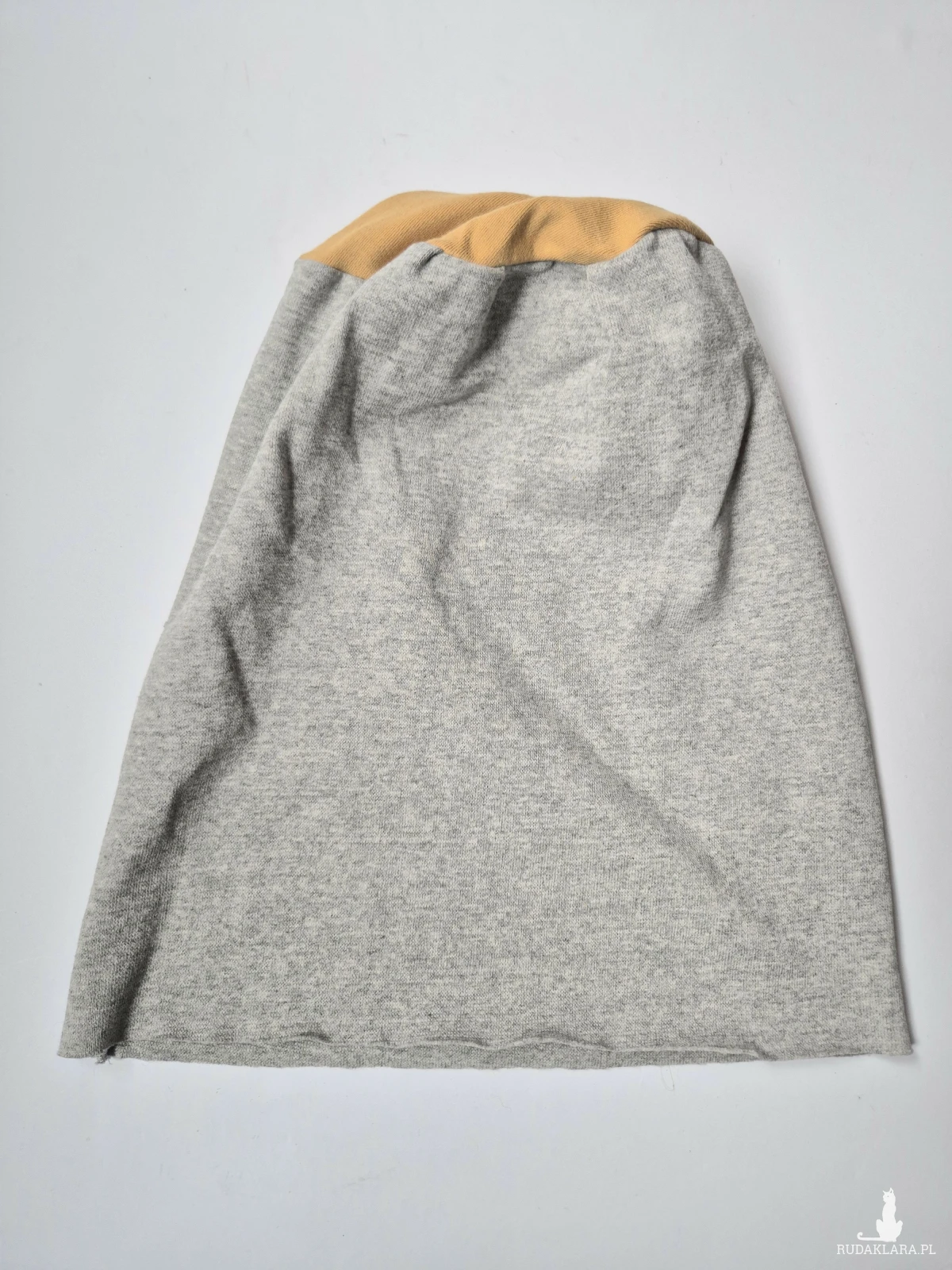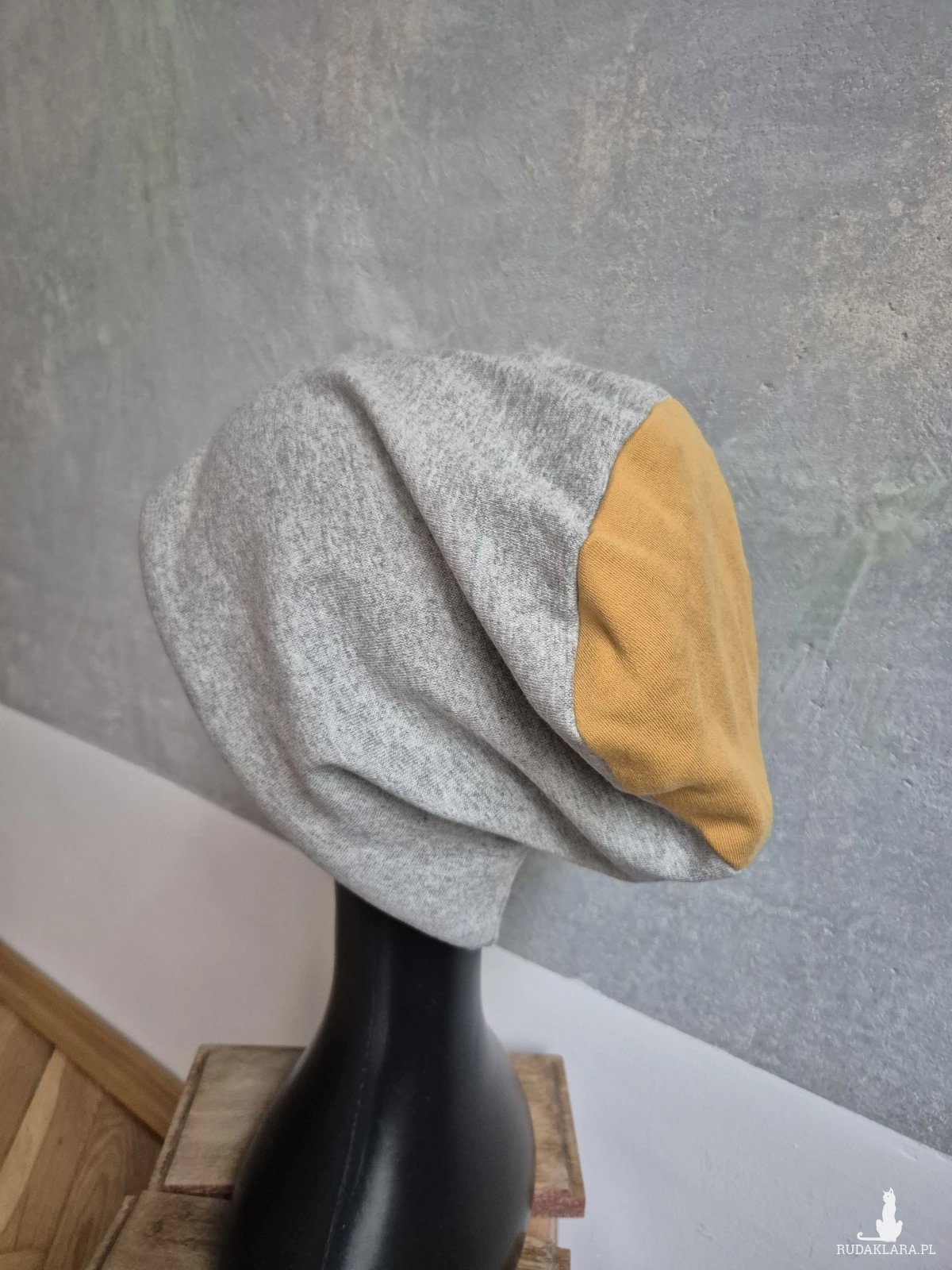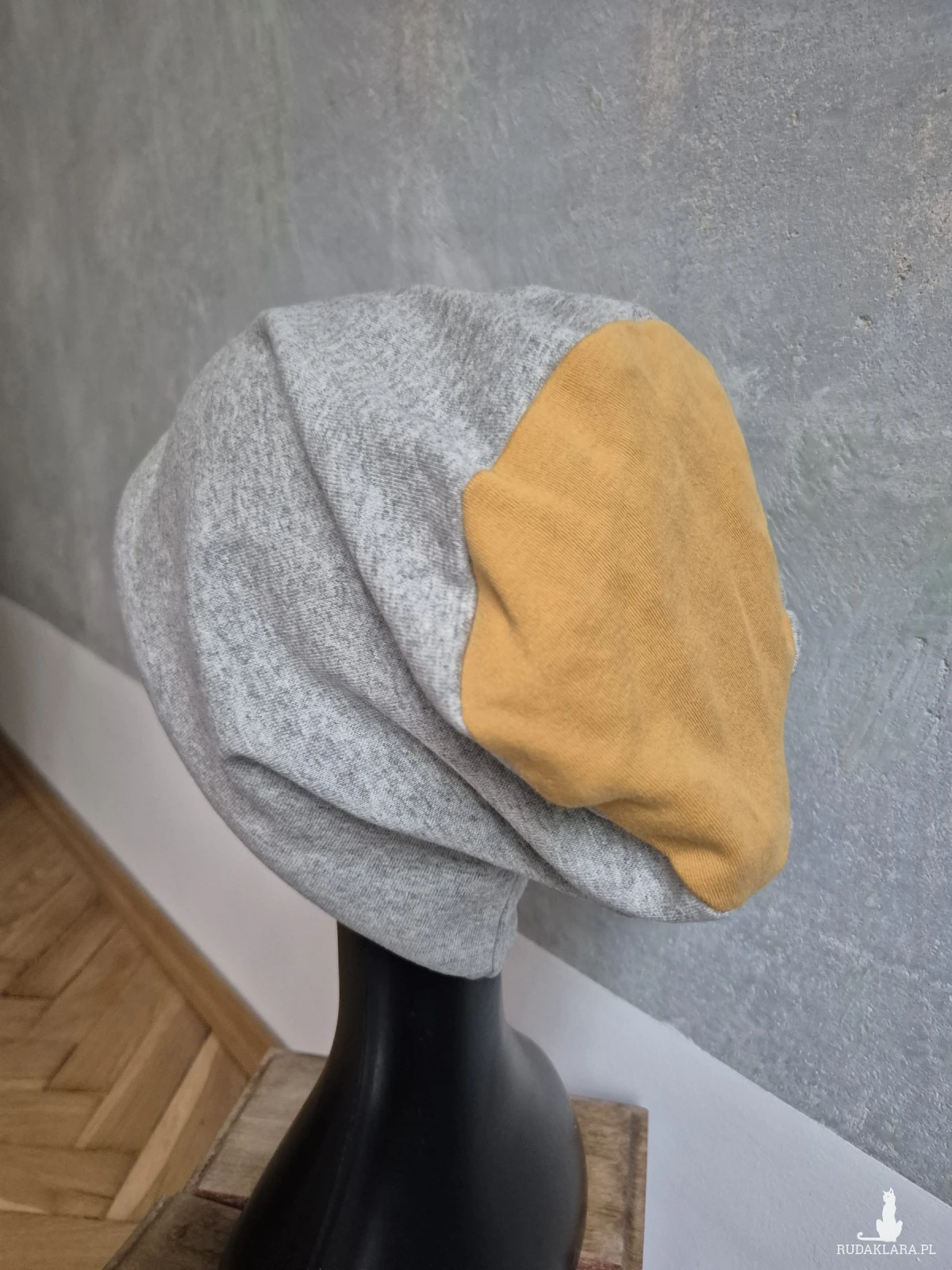 Czapka damsko-męska szaro-żółta brzegi wykończone ostro dzianinowa bez podszewki świetna na codzienne noszenie można ją podwinąć można nosić z ostrymi brzegami na czole może być smerfetką i może też być krótka zależy od tego jak się ją ułoży polecam boks E1