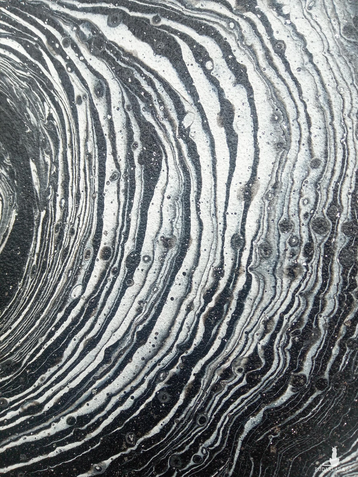 „Zen” — abstrakcyjny obraz w odcieniach czerni i bieli, stworzony techniką acrylic pouring, zaprasza do świata równowagi, spokoju i czystej formy. Jego okrągły kształt symbolizuje harmonię i cykl życia, a subtelne kontrasty czerni i bieli tworzą hipnotyzujący efekt, który przyciąga wzrok i wycisza umysł. W obrazie pojawiają się delikatne, błyszczące punkty, które dodają mu głębi i subtelnego magnetyzmu. To sztuka, która nie krzyczy — ona płynie.