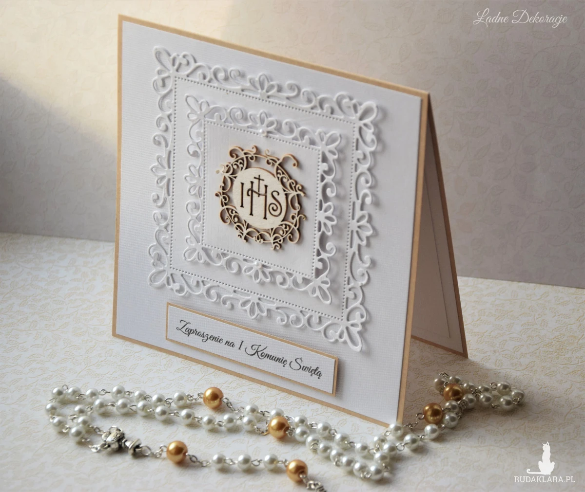 Delikatne i eleganckie zaproszenie na Pierwszą Komunię Świętą wykonane własnoręcznie metodą scrapbookingu z najwyższej jakości materiałów. Połączenie bieli i jasnego brązu nadaje mu subtelny, uroczysty charakter, idealny na tę wyjątkową okazję.