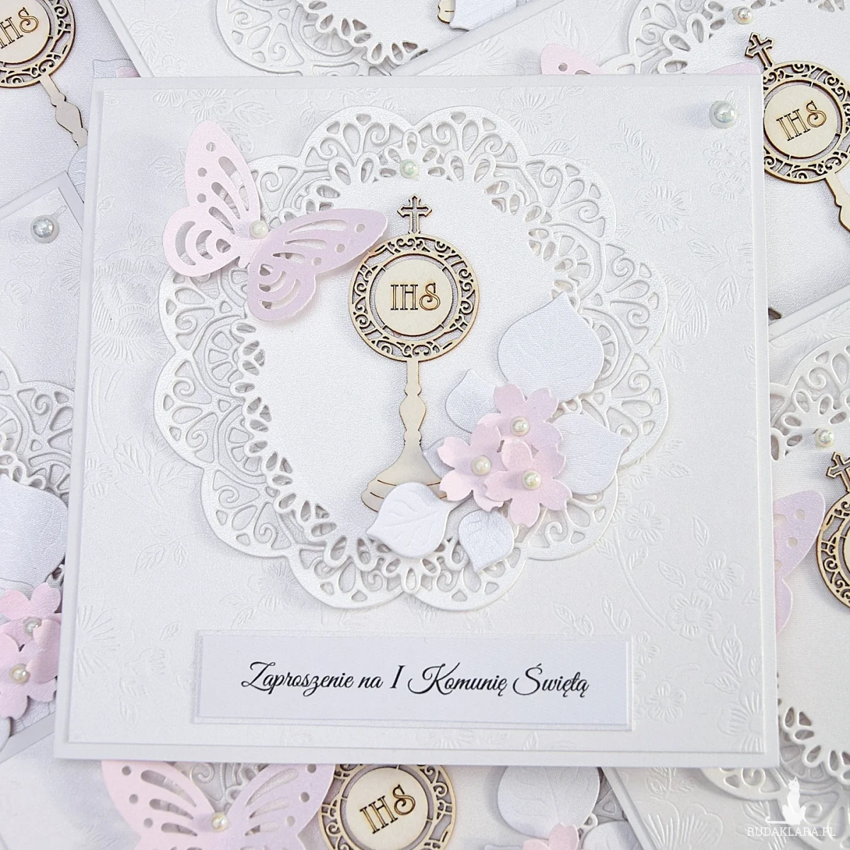 Delikatne i eleganckie zaproszenie na Pierwszą Komunię Świętą wykonane własnoręcznie metodą scrapbookingu z najwyższej jakości materiałów. Połączenie bieli i pudrowego różu nadaje mu subtelny, uroczysty charakter, idealny na tę wyjątkową okazję.