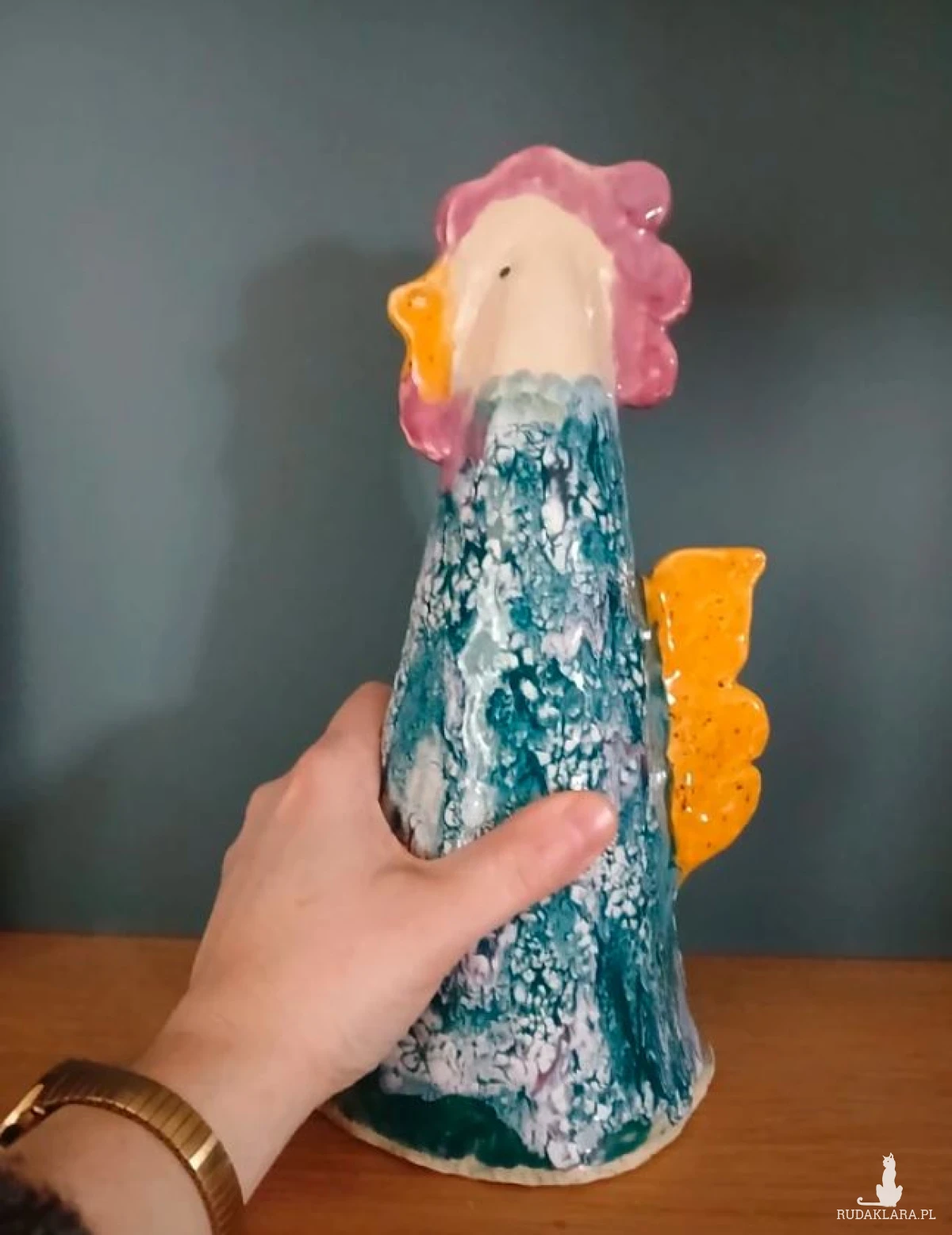 Kogut czy kura? Dekoracyjna rzeźba gliniany kogucik lub kurka doda wiejskiego folkowego klimatu każdemu wnętrzu. Może też posłużyć jako rzeźba ogrodowa w rustykalnym klimacie. Jedyna i niepowtarzalna.