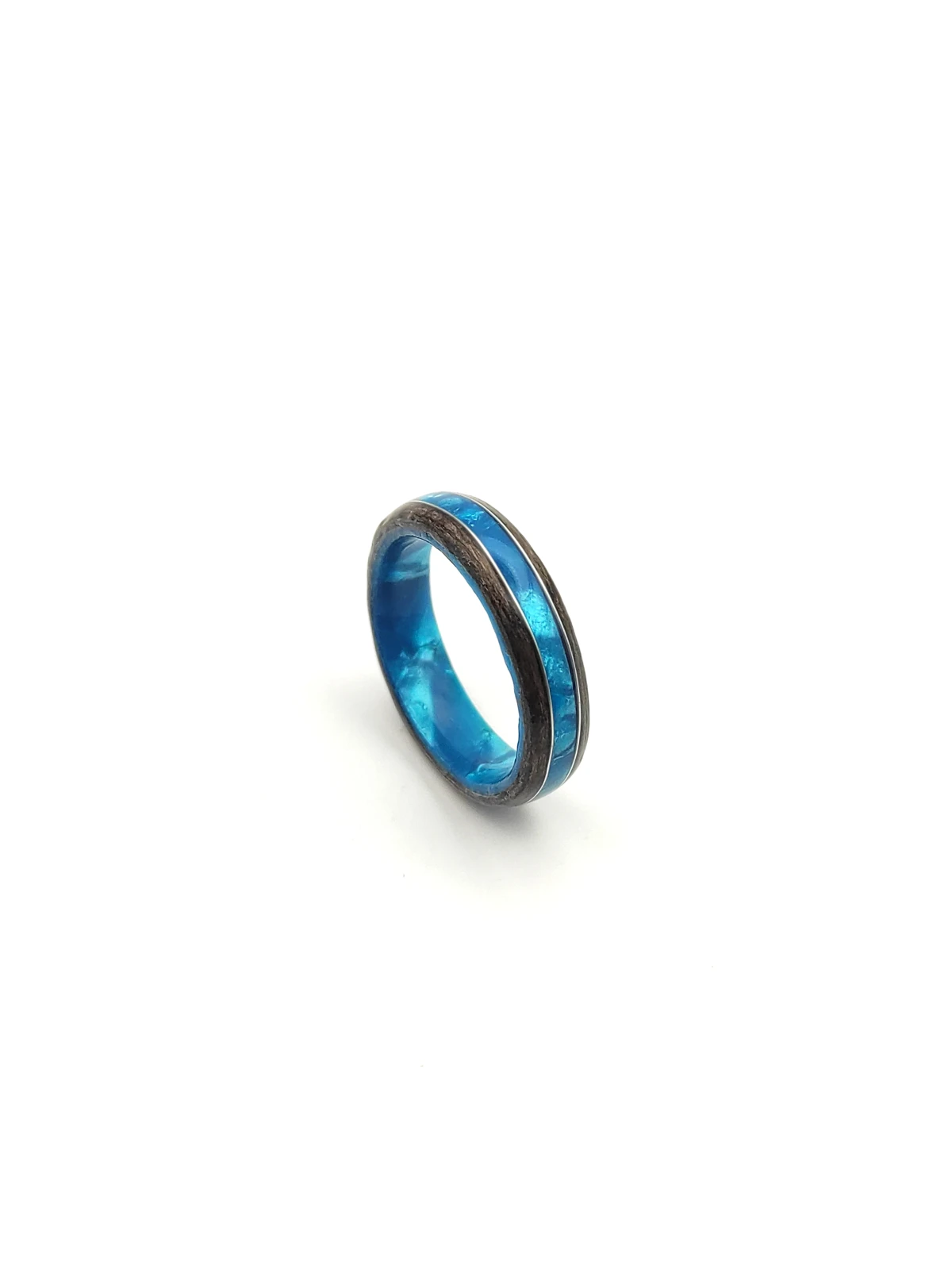 Pierścionek Błękitna Głębia to ręcznie wykonane połączenie forniru orzechowego z jasnoniebieskim celuoidem, przedzielone delikatnym ciemnym drucikiem.