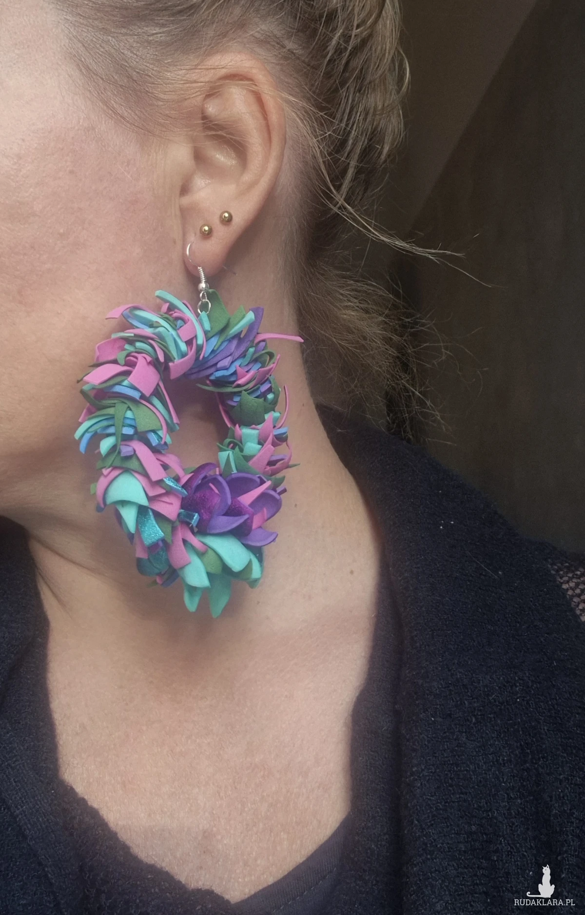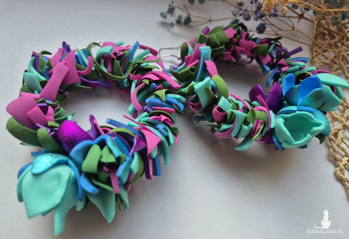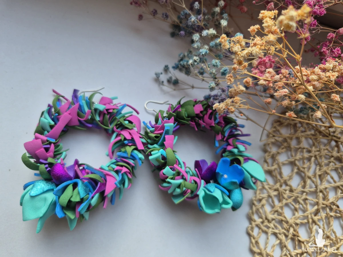 Kolczyki szalone, ukwiecone koła bardzo duże lekkie widoczne dla osoby która lubi istnieć i być tu teraz i wszędzie polecam