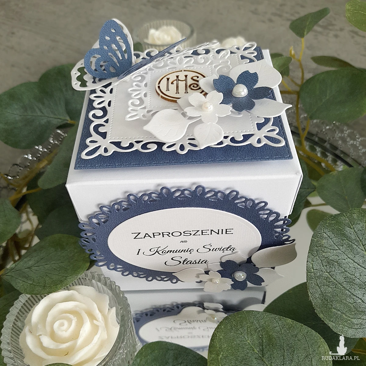 Zaproszenia te wykonywane są przeze mnie własnoręcznie metodą scrapbookingu z materiałów najwyższej jakości z należytą starannością i dbałością o szczegóły. Połączenie bieli i głębokiego granatu nadaje mu subtelny, uroczysty charakter, idealny na tę wyjątkową okazję.