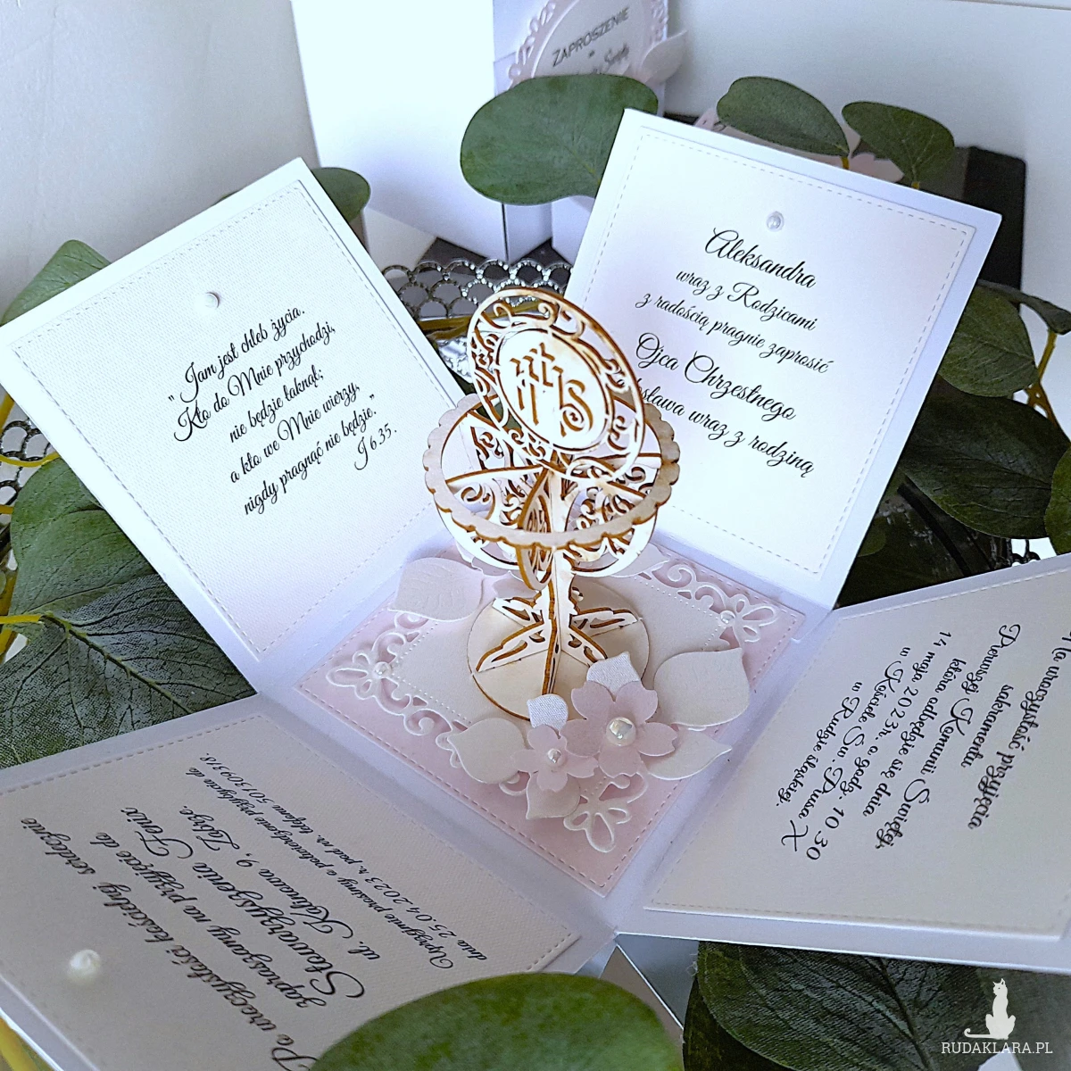 Zaproszenia te wykonywane są przeze mnie własnoręcznie metodą scrapbookingu z materiałów najwyższej jakości z należytą starannością i dbałością o szczegóły. Połączenie bieli i pudrowego różu nadaje mu subtelny, uroczysty charakter, idealny na tą wyjątkową okazję.