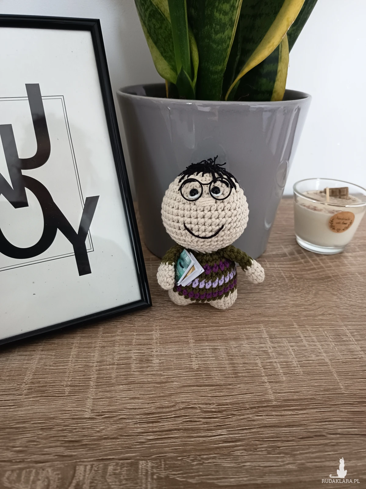 Szydełkowy brelok mól książkowy w dodających uroku okularach
