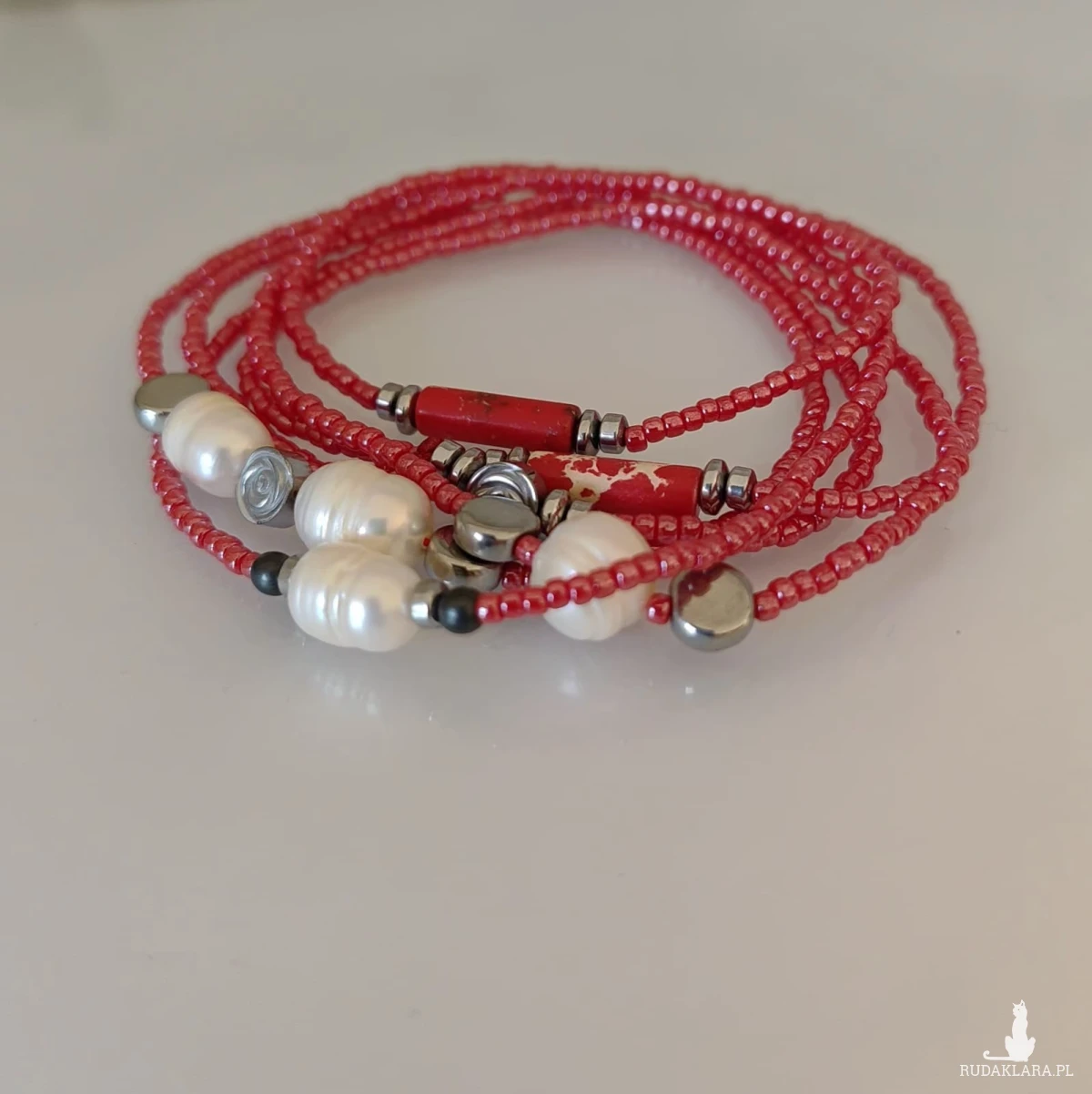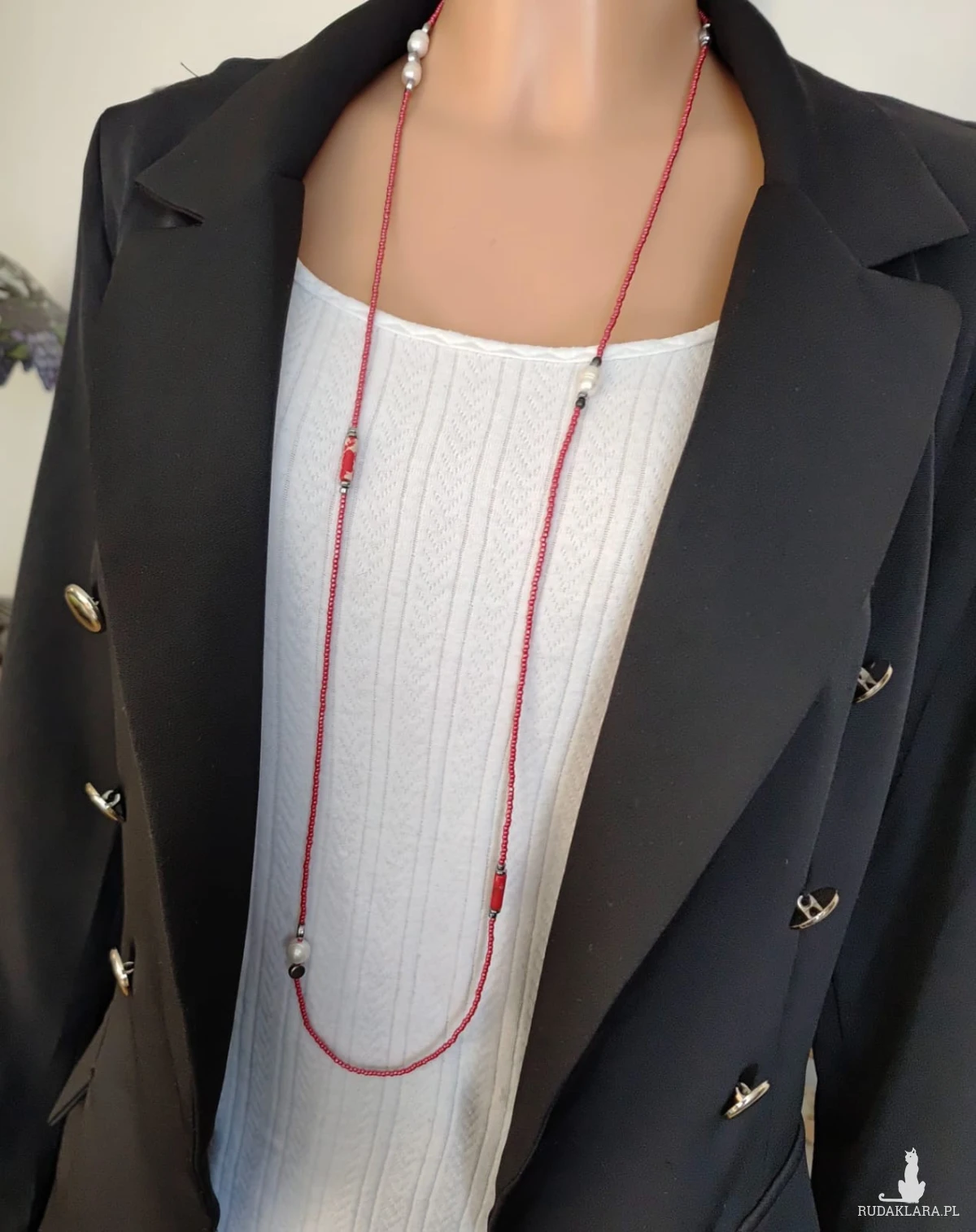Naszyjnik z bardzo drobnych koralików szklanych w czerwonym kolorze. Długi sznur z przekładkami z hematytu w formie różyczki i kulek,plasterków,dysków. Czerwone howlity. Cztery perły hodowlane 10 mm, dlugość sznura 2x52 cm
