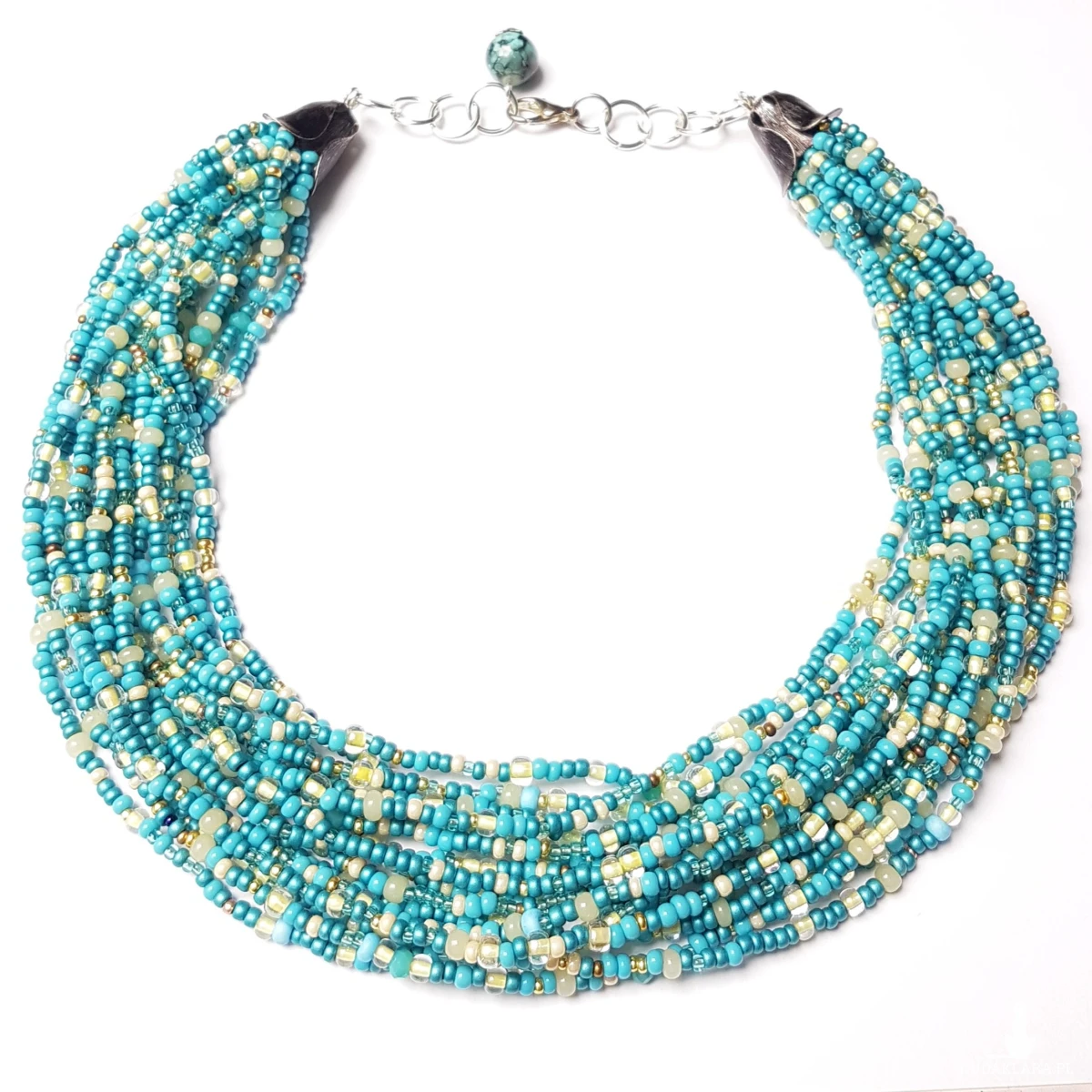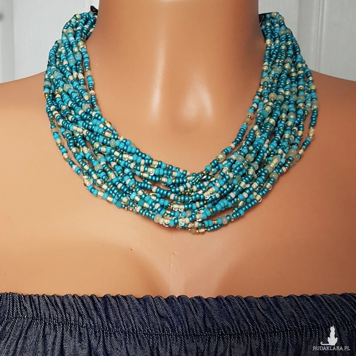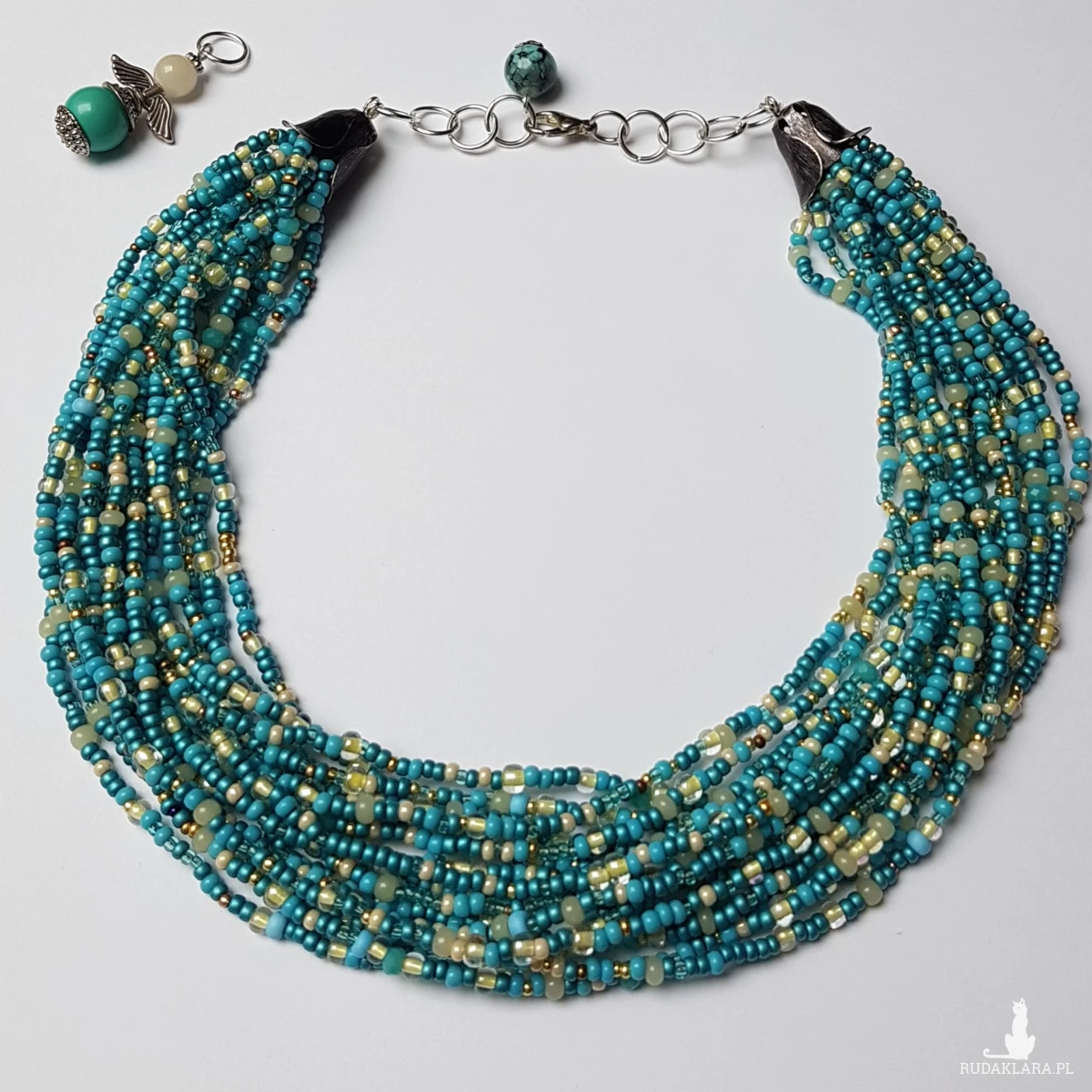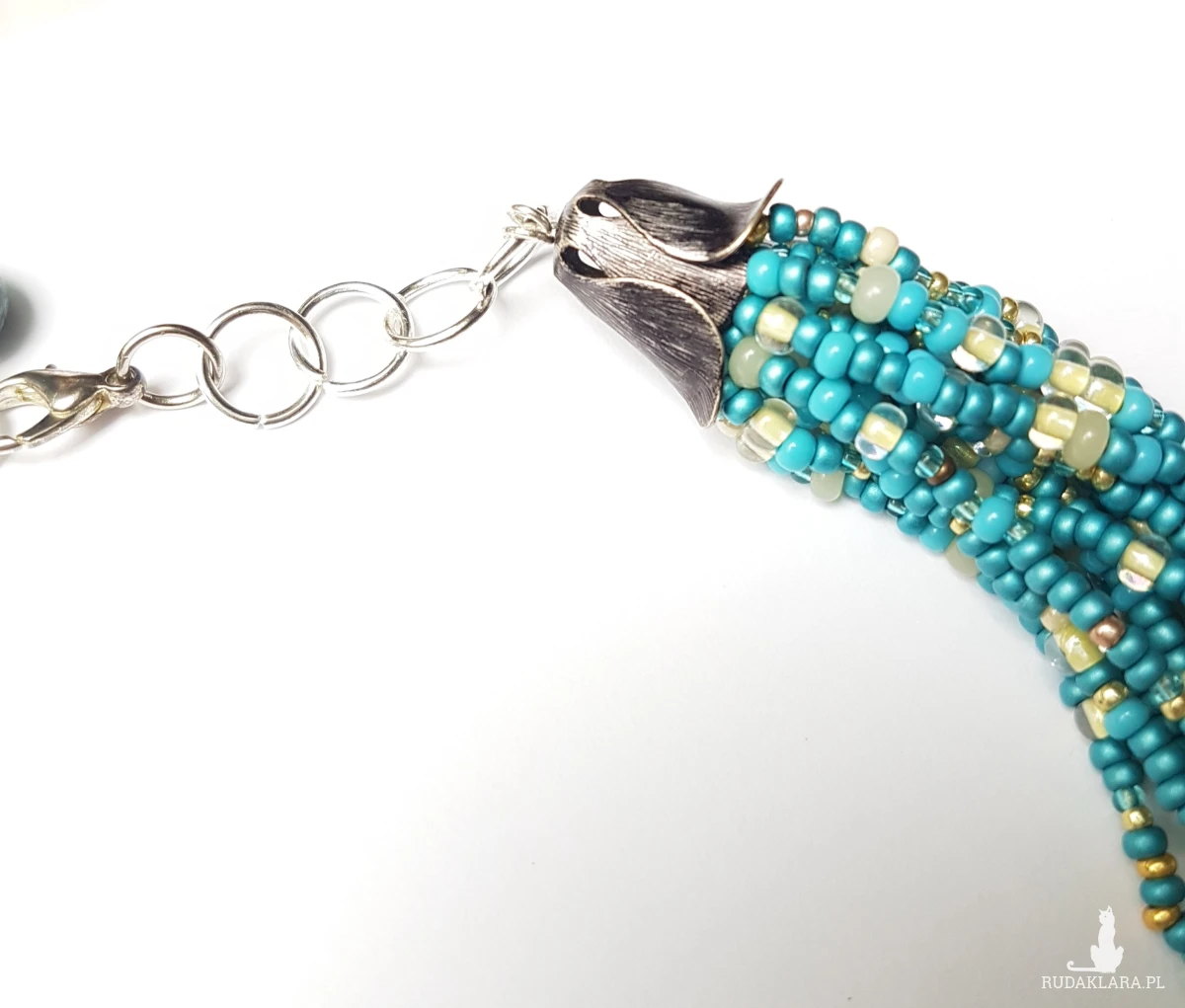 Duży naszyjnik z miksem turkusowych koralików. Posrebrzane końcówki w formie dużych kwiatowych kielichów, zapięcie duże i wygodne, objętość 46 cm