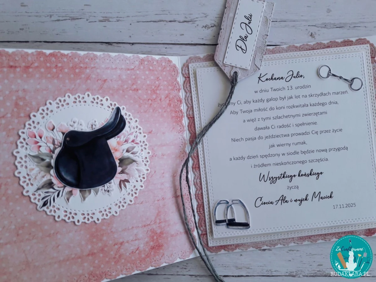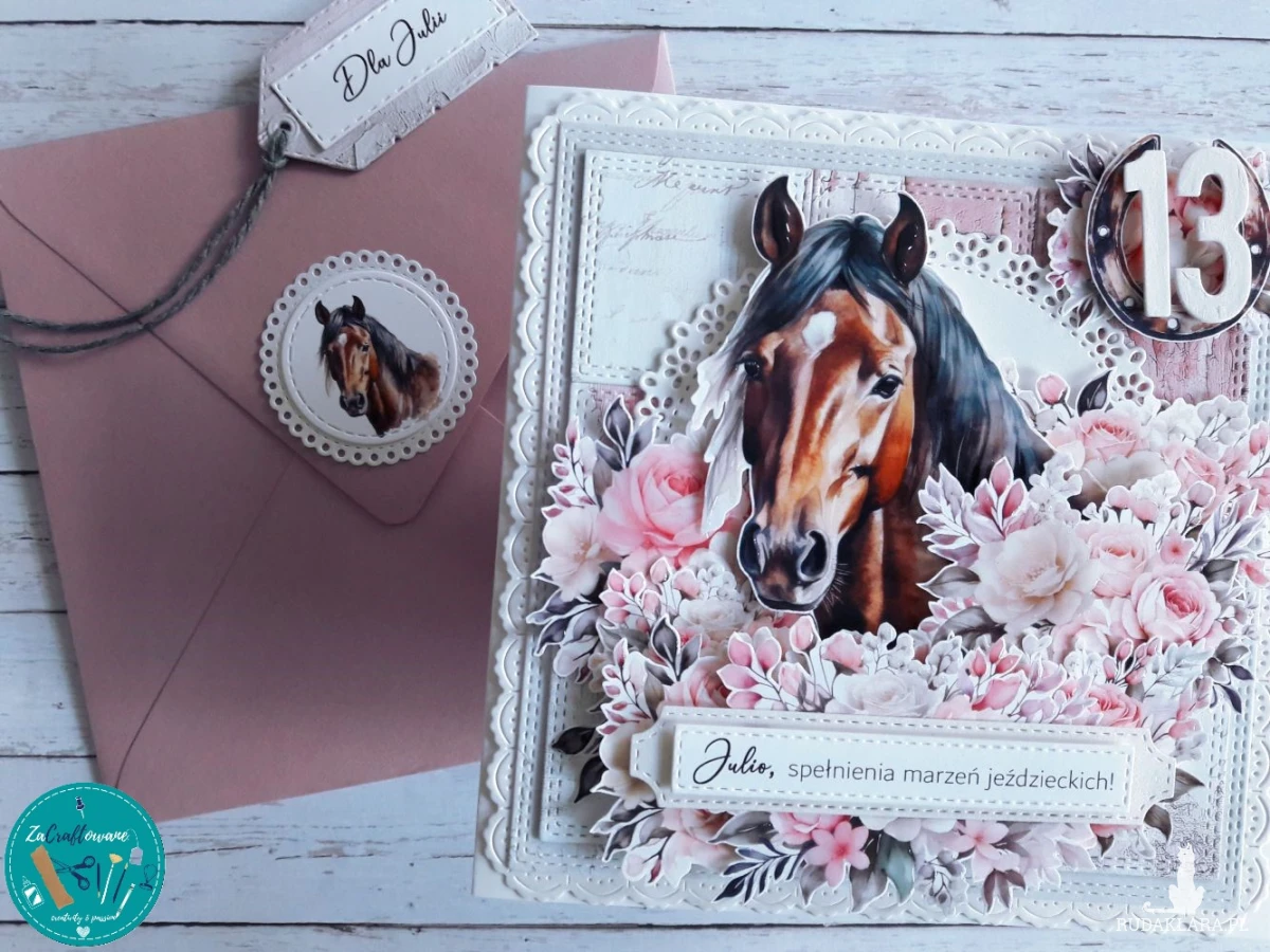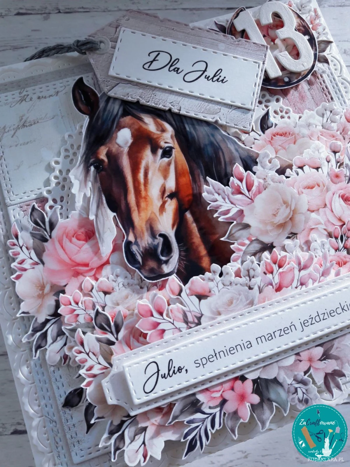Warstwowa kartka urodzinowa dla pasjonatki koni z efektem 3D, wykonana metodą scrapbookingu.