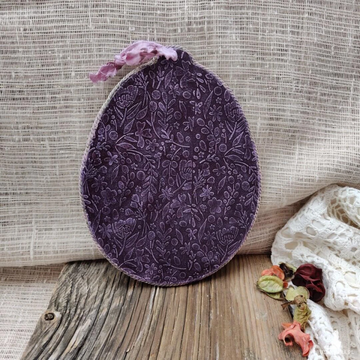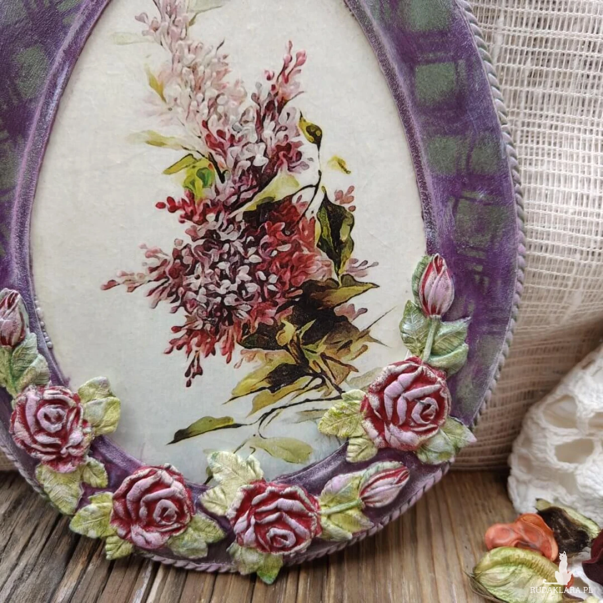 Wiosenna zawieszka wykonana w technice decoupage to prawdziwa uczta dla oczu. Jej głównym motywem są piękne fioletowe kwiaty, które emanują świeżością i radością nadchodzącej pory roku. Każdy detal został starannie wykonany, a delikatne cieniowania dodają głębi i lekkości, sprawiając, że kwiaty wydają się niemal trójwymiarowe.