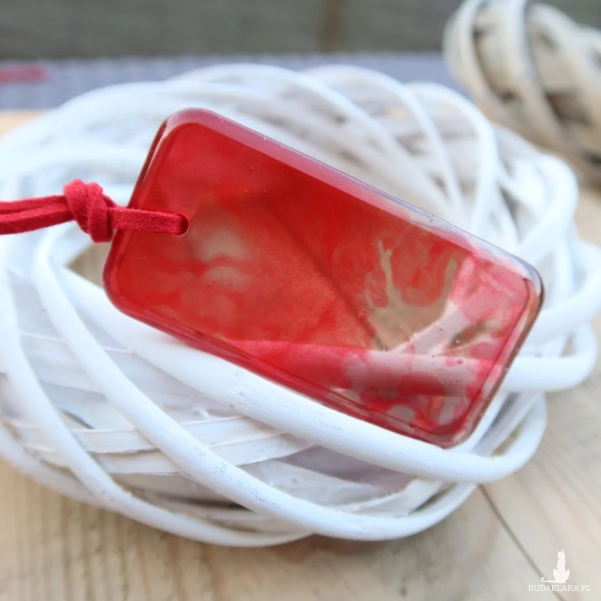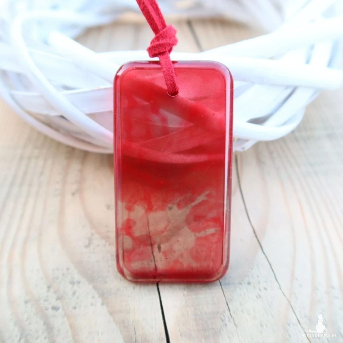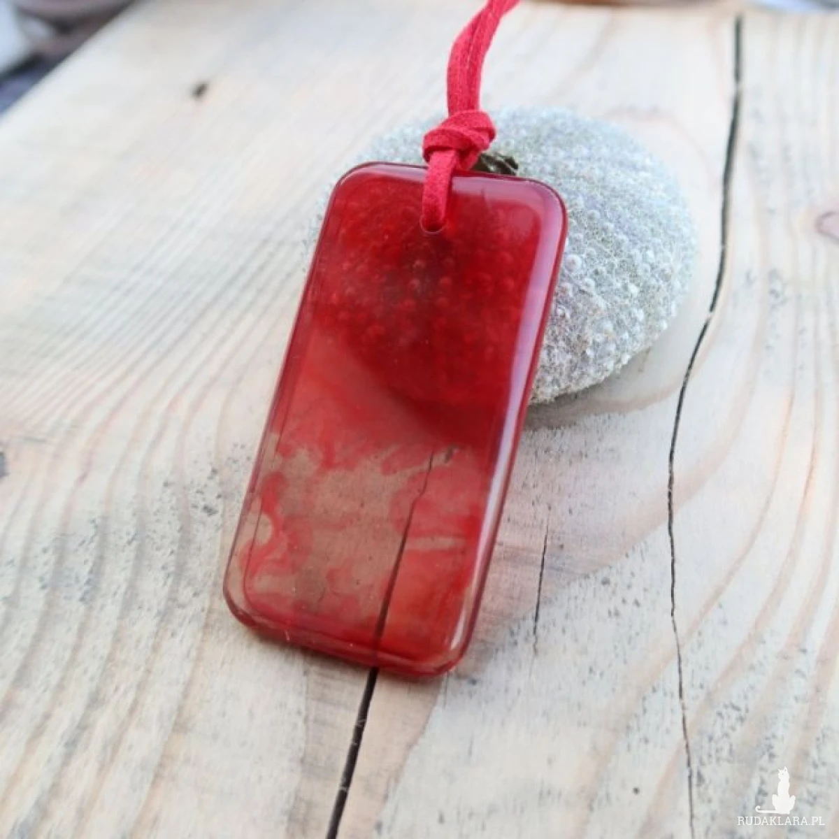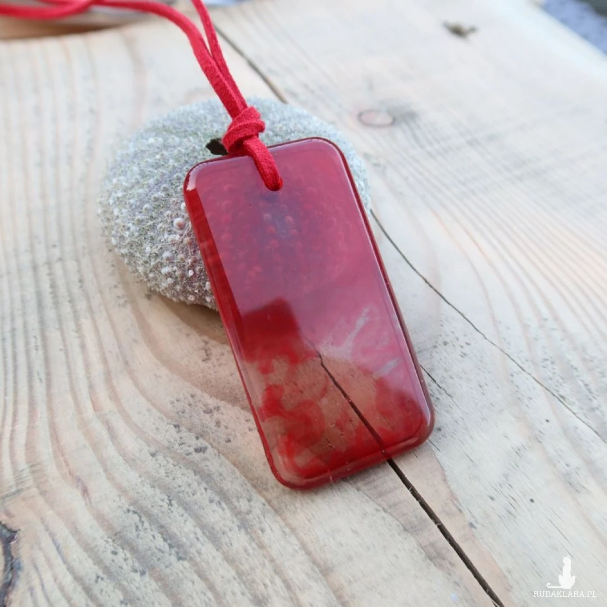 Zawieszony na czerwonym rzemyku, staje się jeszcze bardziej wyrazisty i oryginalny. Kontrast między intensywnym malinowym kolorem, a jaskrawym czerwienią rzemyka sprawia, że całość prezentuje się gustownie i stylowo.