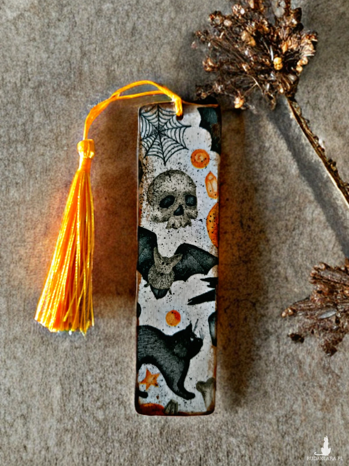 Drewniana, cieńka zakładka do książki, zdobiona dwustronnie techniką decoupage.