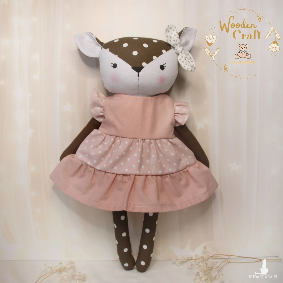 Przeurocza przytulanka, sarenka w wersji dziewczęcej, uszyta ręcznie z najwyższą starannością, ubrana w różową sukieneczkę w kropeczki, z falbankami. Wykonana ze 100% bawełny, wypełniona antyalergiczną kulką silikonową. Oczka i nosek malowane wodoodpornym markerem. Sukieneczkę można swobodnie zdejmować - jest zapinana na rzep. Górne i dolne łapki układają się luźno, sarenka siedzi z podparciem.