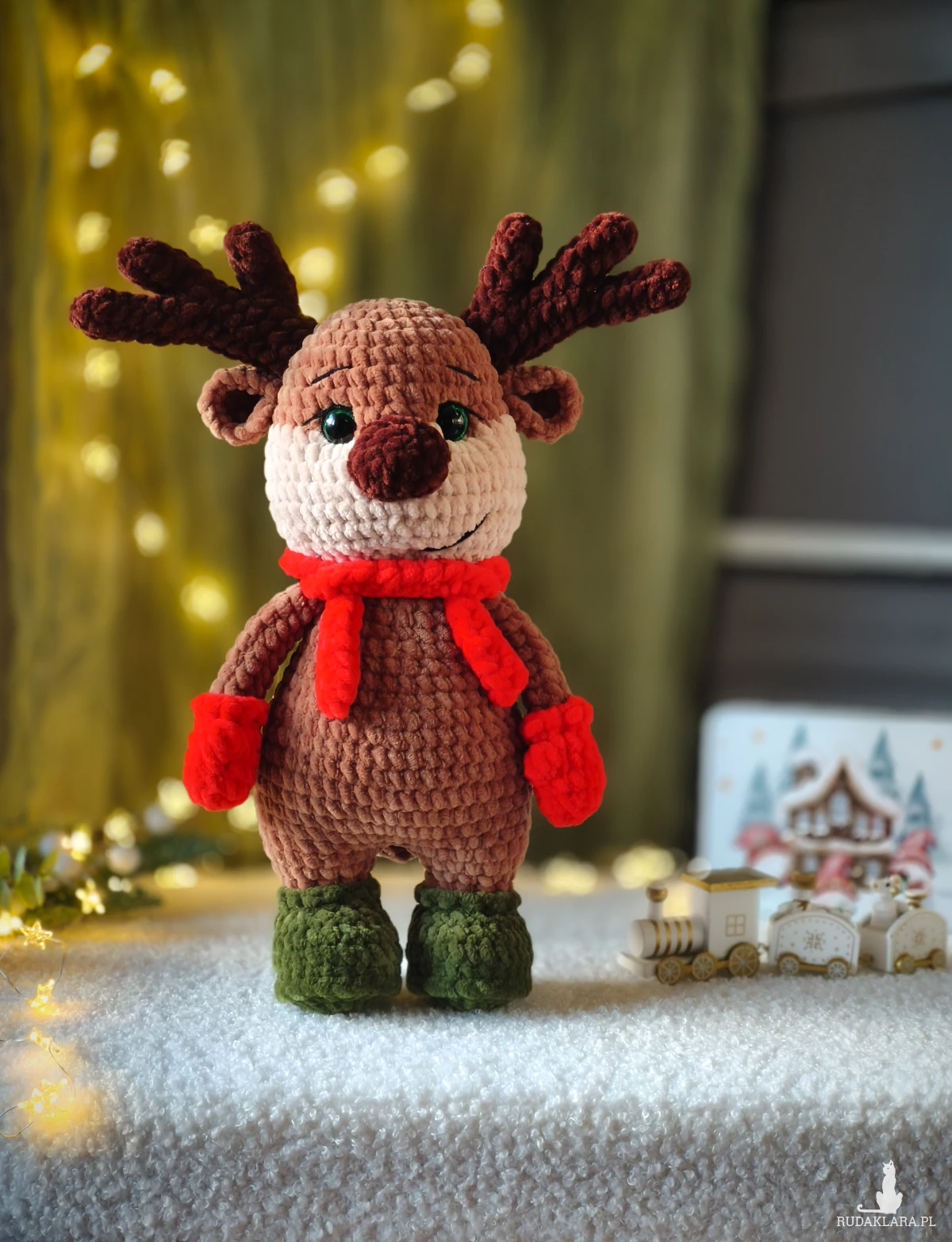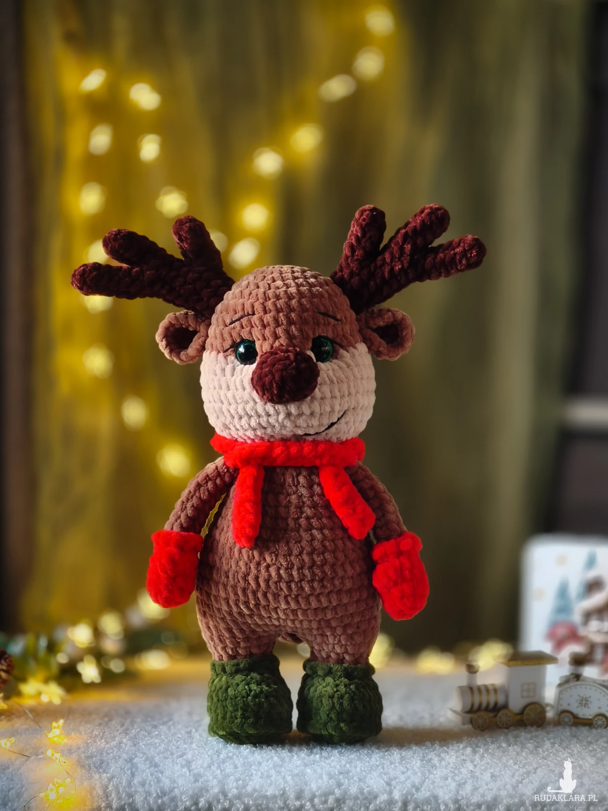 - Jeleń ma na sobie nieodpinane buciki zielone i czerwone rękawiczki.