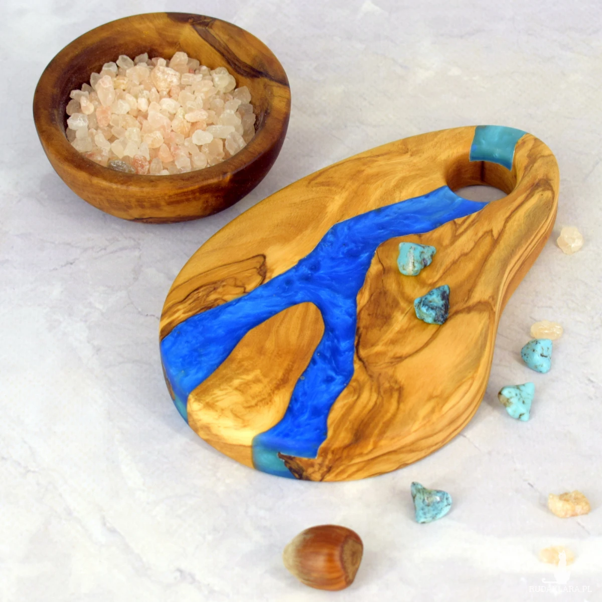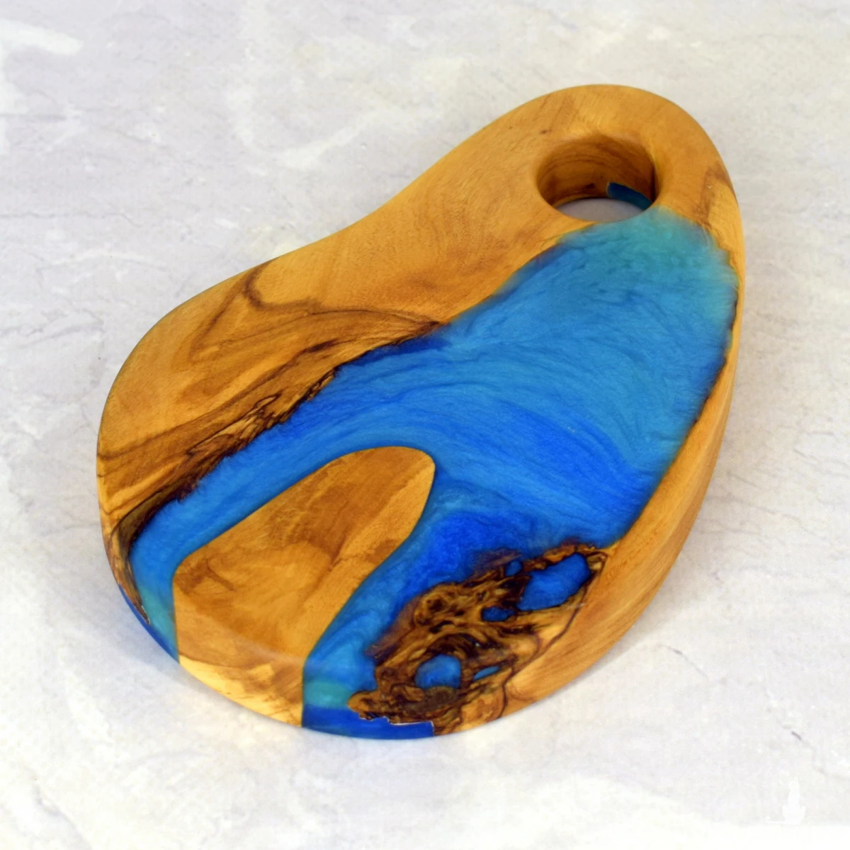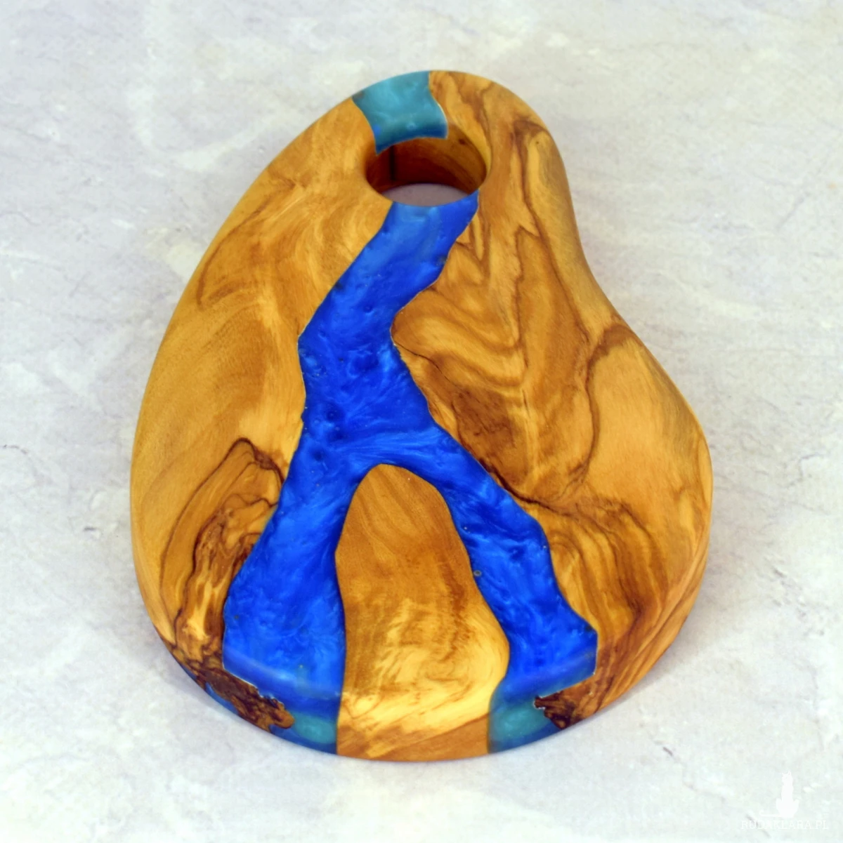 Ręcznie wykonana deska dekoracyjna o długości 15 cm z jednego kawałka drewna oliwnego. Jej wyjątkowy charakter podkreśla naturalny ubytek wypełniony perłową niebieską żywicą epoksydową, tworząc harmonijne połączenie natury i subtelnej elegancji. Idealna jako ozdoba stołu, podstawka lub niewielki element użytkowy.