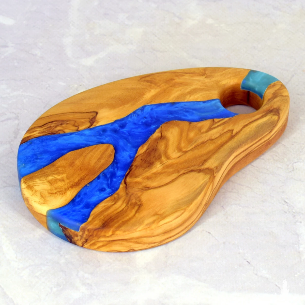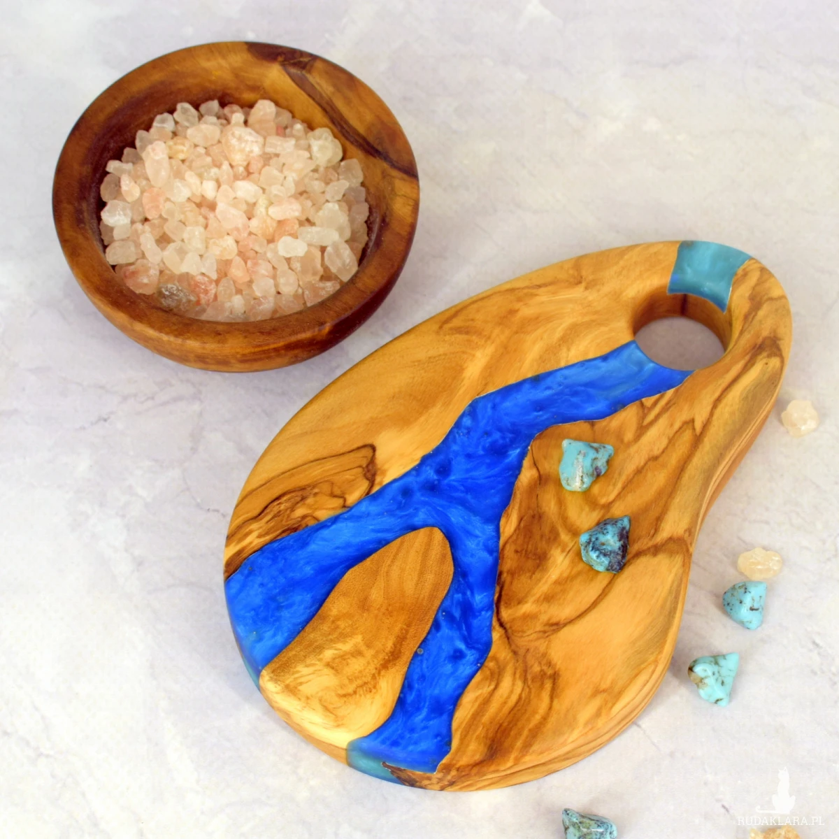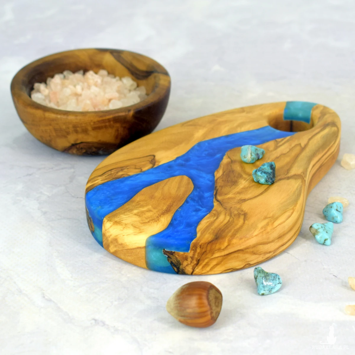 Ręcznie wykonana deska dekoracyjna o długości 15 cm z jednego kawałka drewna oliwnego. Jej wyjątkowy charakter podkreśla naturalny ubytek wypełniony perłową niebieską żywicą epoksydową, tworząc harmonijne połączenie natury i subtelnej elegancji. Idealna jako ozdoba stołu, podstawka lub niewielki element użytkowy.