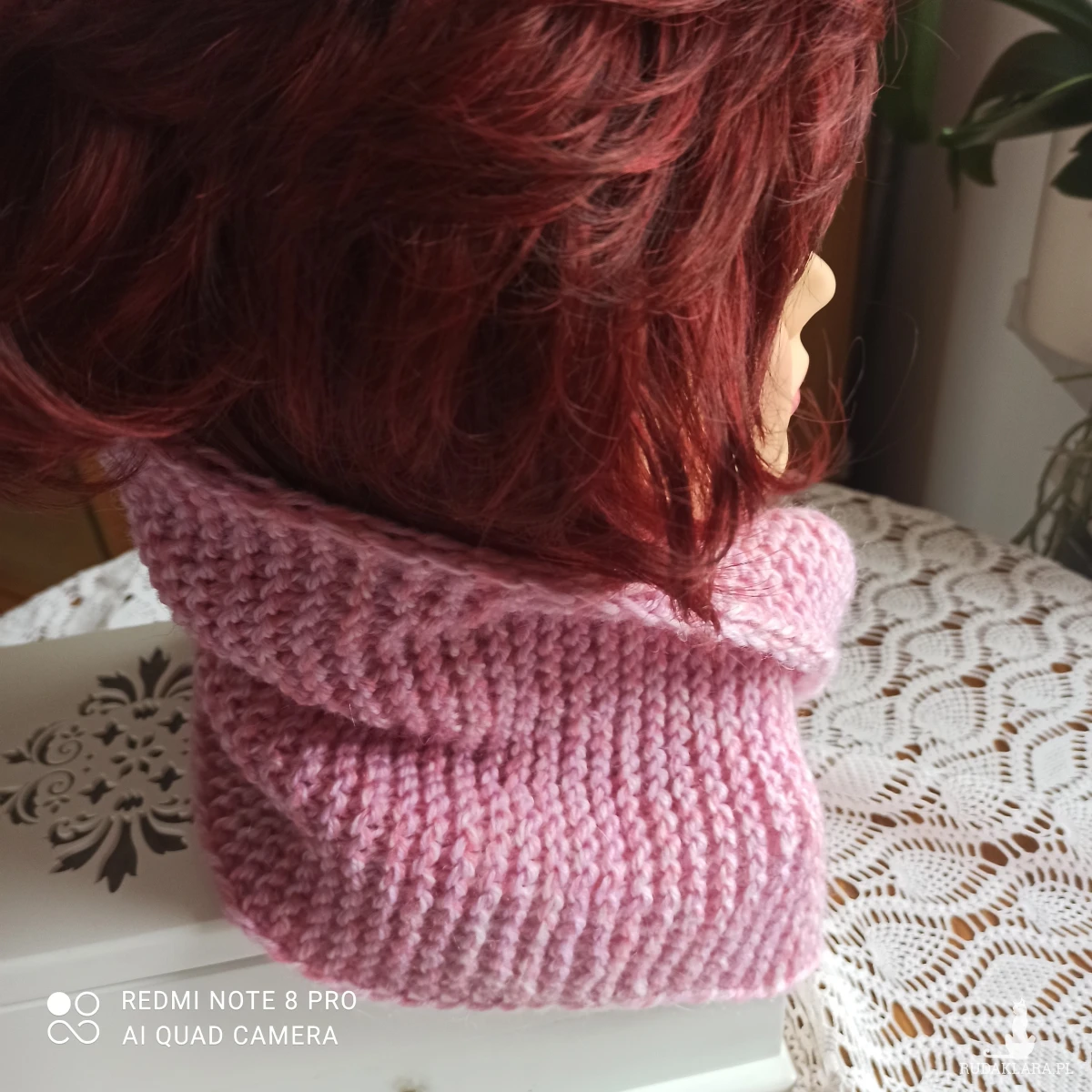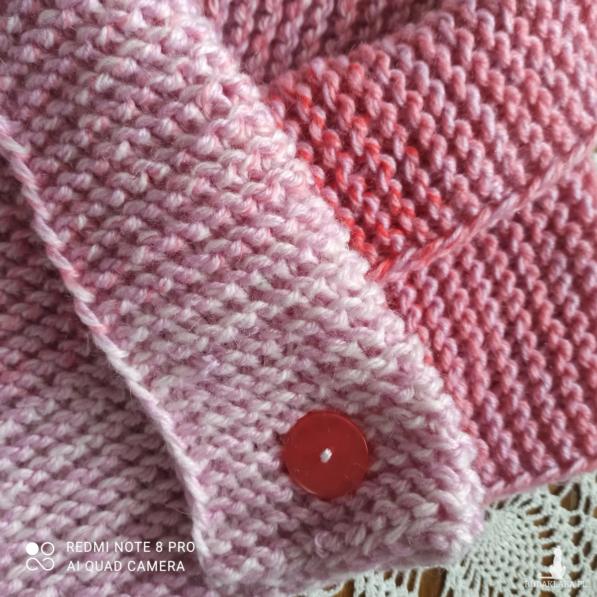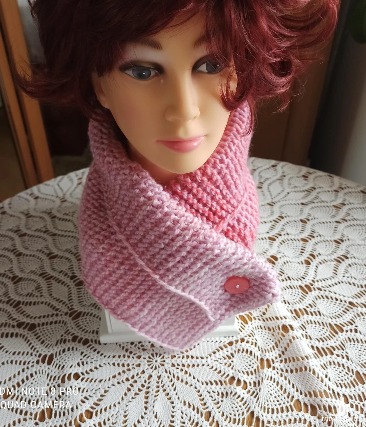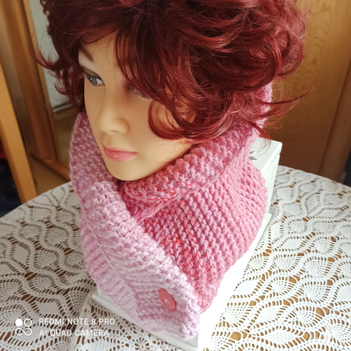 Komin w kolorze różowym wykonany handmade ściegiem francuskim z moheru z domieszką 50% akrylu, ozdobiony efektownym guzikiem. Nić cieniowana od jasnego pudrowego różu do nasyconego różowego. Guzik przymocowany tak, że pełni funkcję zapięcia, jest praktyczne i wygodne w użyciu, można obwód dopasować do własnych potrzeb. Bardzo miękki w dotyku, nie gryzie. Można odwinąć z tyłu wysoko i ochronić głowę od zimna. Skutecznie zatrzymuje ciepło, przepuszcza powietrze, łatwo przylega do ciała. Kolor modny w tym sezonie. Jedyny taki!!!