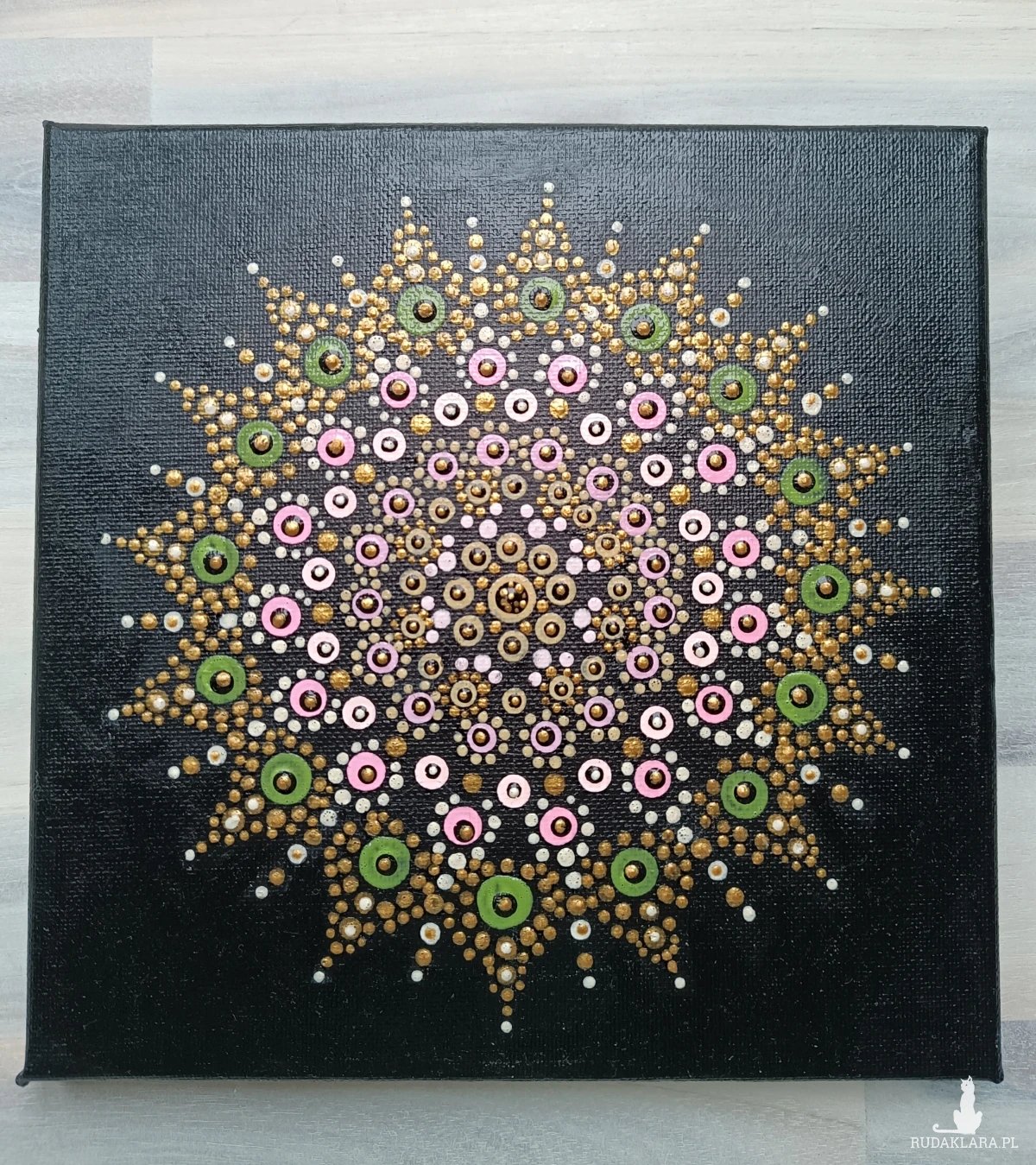 Obraz malowany na płótnie farbami akrylowymi metodą kropkowania. Przedstawia motyw mandali , który ma kojący wpływ na nasz układ nerwowy. Kontemplacja mandali rozwija naszą koncentrację, uspokaja, mobilizuje do pracy obie półkule mózgowe. Motyw kolorowej mandali będzie niebanalnym elementem dekoracyjnym we wnętrzu.