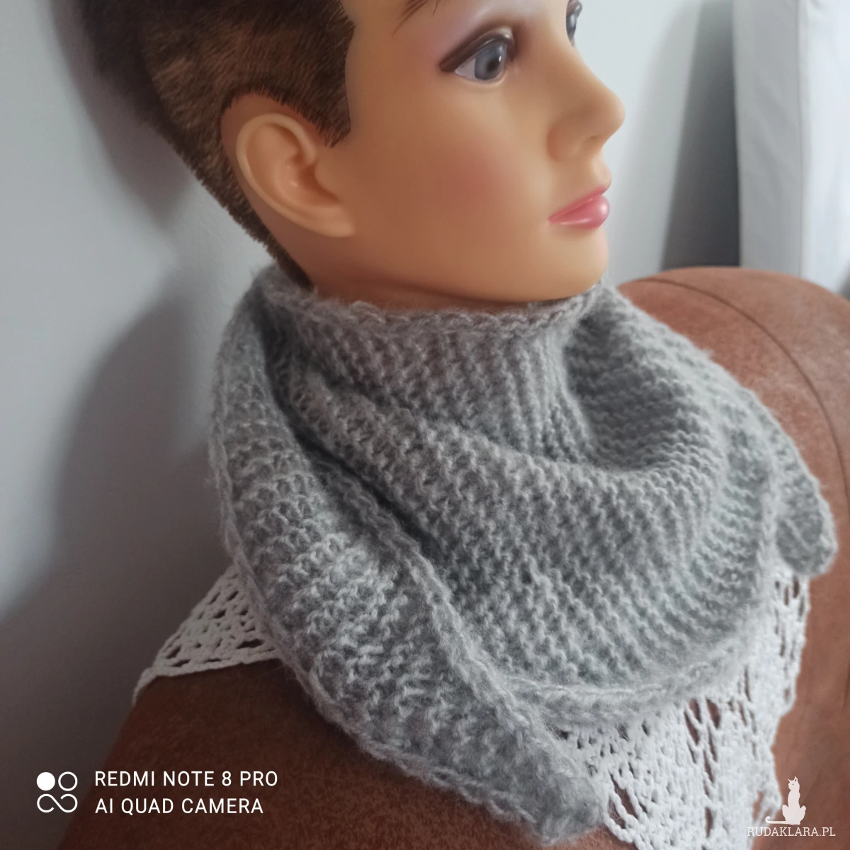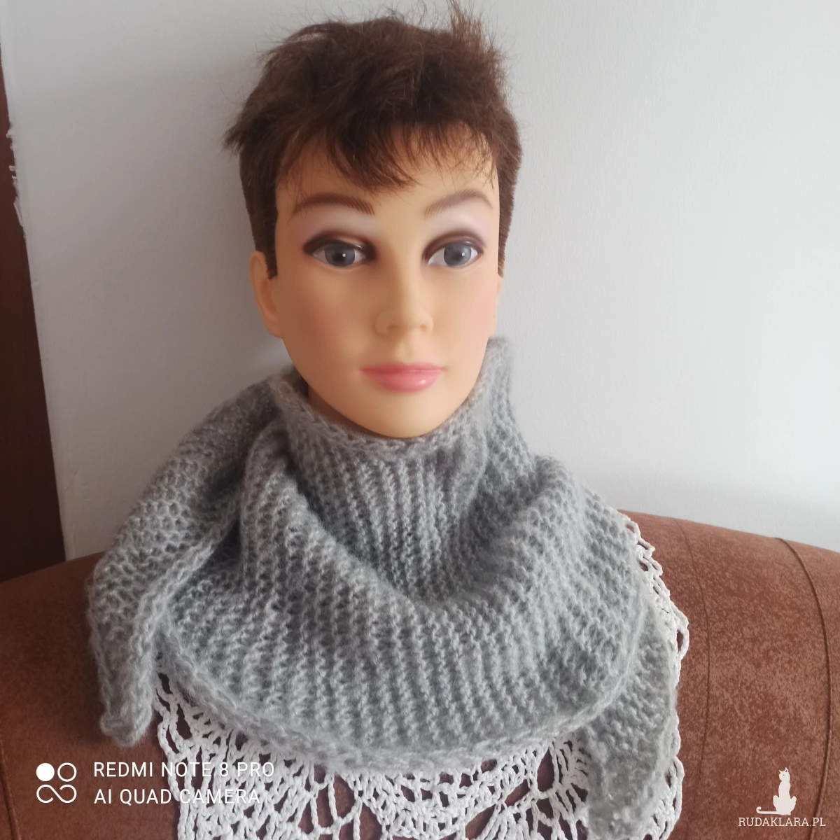 W komplecie czapka i szalik lub chusta /wedle uznania/w jasnoszarym kolorze wykonany na drutach z wełny Carlotta o składzie moher i polyacryl. Wyrób bardzo delikatny, lekki, mięciutki i bardzo przyjemny w dotyku. Czapka wykonana wzorem ściągaczowym jedno oczko lewe jedno prawe, obwód bez rozciągania 42 cm, wysokość czapki 30 cm. Czapka jest wysoka, umożliwiająca wywijanie , marszczenie, noszenie a la Smerfetka itp. Szalik lub chusta wykonany w takim kształcie by można go dwojako używać. Najszerszy pośrodku 25 cm, zwęża się w obu kierunkach. Całkowita długość 116 cm. Nie rozciąga się ale jest podatny na wydłużenie. Przy różnej pogodzie można wykorzystać wyrób jako tradycyjny szalik, chusta na bluzkę lub chusta bezpośrednio na głowę lub na czapkę z daszkiem. Doskonały dodatek na chłodniejszą lub nawet zimną pogodę. Kolor bardzo modny. Wykonany na drutach prawymi oczkami ściegiem francuskim. Doradzam pranie wyłącznie ręczne, w temperaturze do 30 stopni. Gorąco polecam, niska cena.