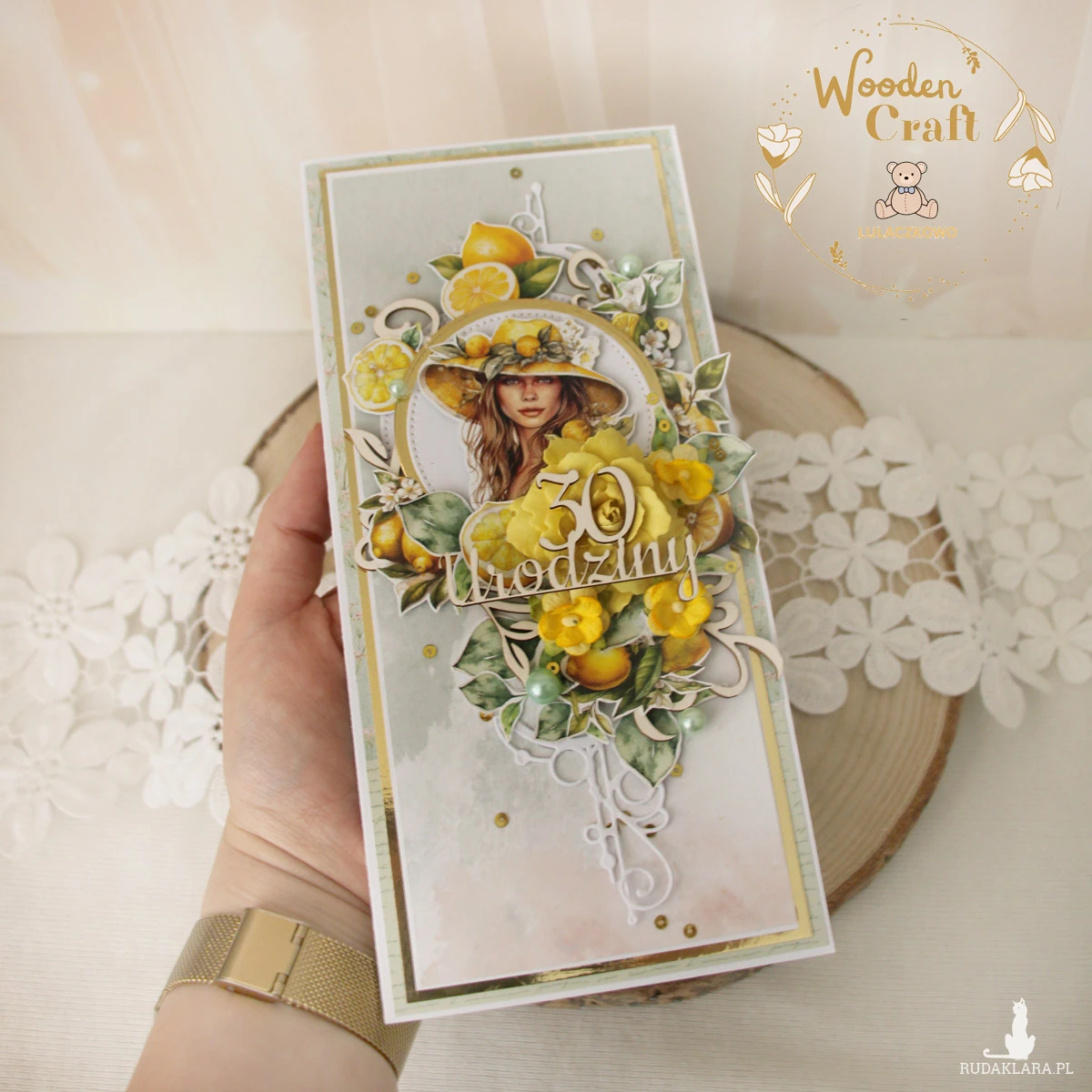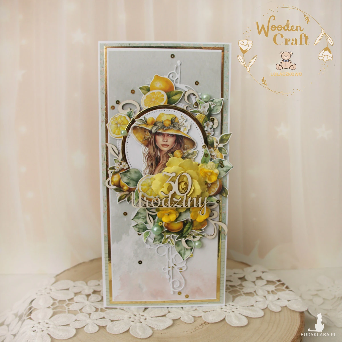 Piękna i nietuzinkowa kartka urodzinowa dla kobiety, utrzymana w odcieniach jasnej zieleni, cytryny i bieli, z dodatkiem złotych błyszczących akcentów, bogato zdobiona licznymi grafikami cytryn oraz kobiety w kapeluszu, udekorowana ręcznie robioną foamiranową różą, a także połyskującymi, złotymi cekinami oraz tekturkowym napisem "30 Urodziny".