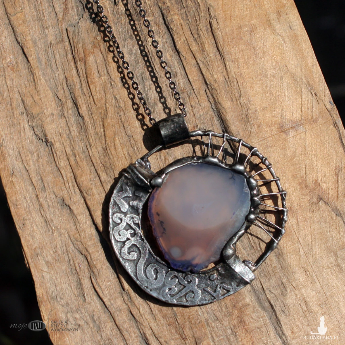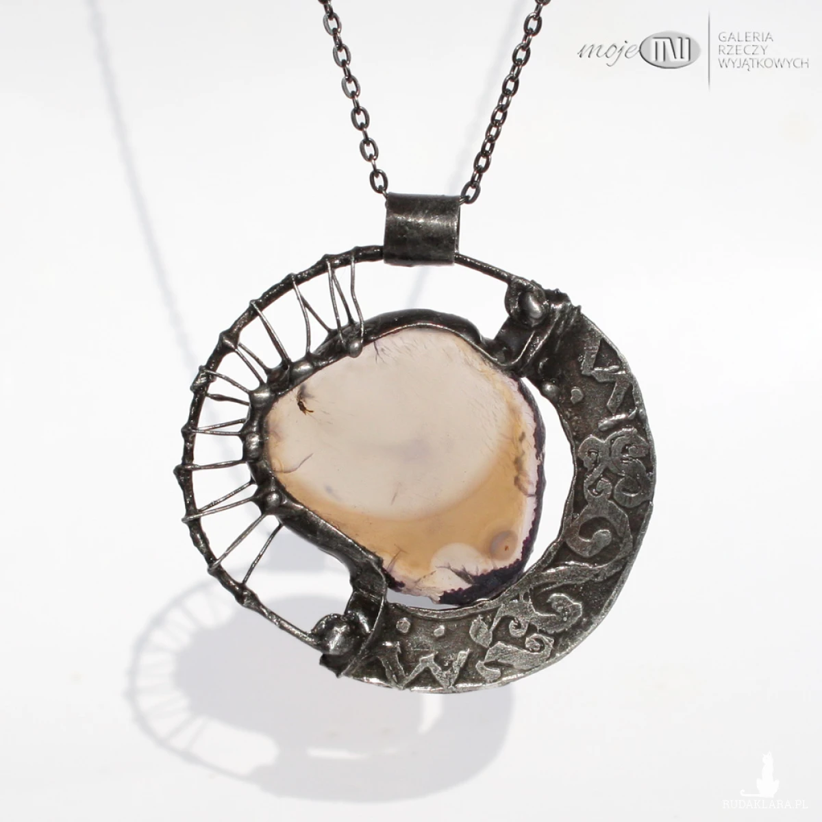 Dwustronny wisior z plastra agatu i miedzi. Agat jest w stonowanym brązowo-beżowym kolorze. Oprawiony i wykończony jest miedzią - cynowaną, patynowaną i przecieraną. Jest zawieszony jest na łańcuszku w kolorze grafitowym. Zazwyczaj dodaję łańcuszek o długości ok. 60-70 cm, ale klient może podać długość, która go interesuje.