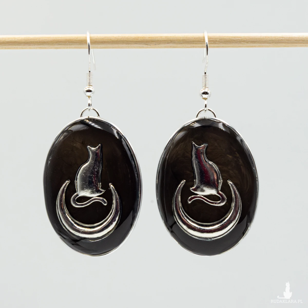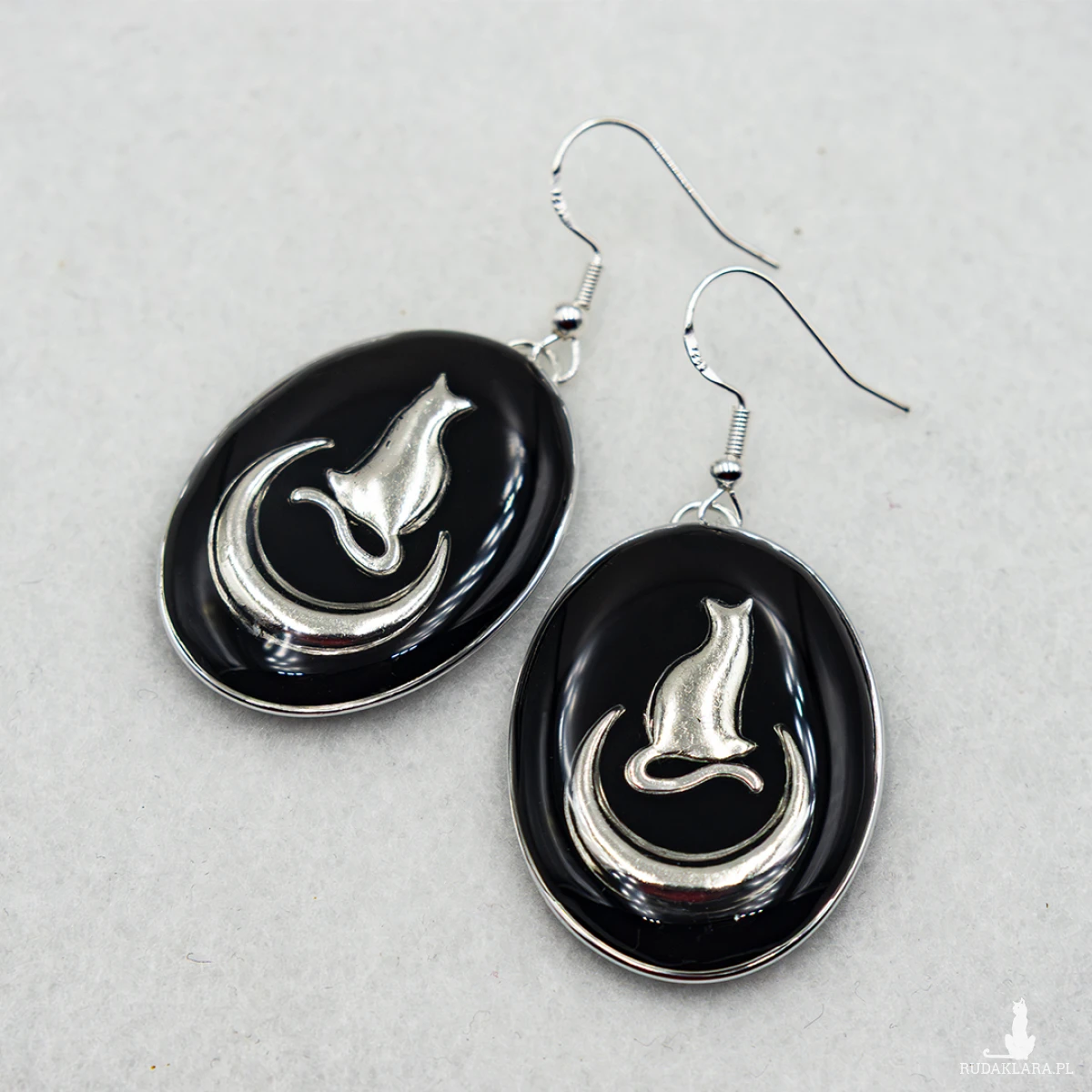 wykonane przeze mnie unikalne kolczyki w klasycznym gotyckim stylu z kotem i półksiężycem, dla wszystkich fanów "czarnej sceny". Należę do niej od blisko 30 lat i dlatego tworzę biżuterię, która może wydawać się mniej "gotycka" niż inne wzory, tzn. mniej wizualnie wybujała, ale skierowana jest przede wszystkim do tych, którzy cenią sobie subtelność bez utraty podstawowych gotyckich cech.
