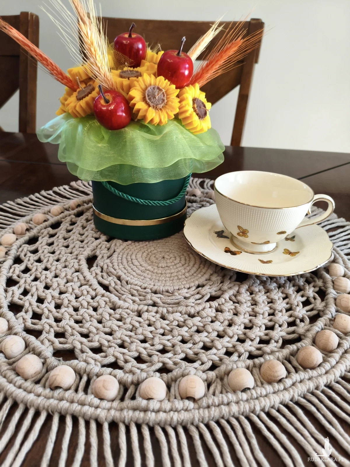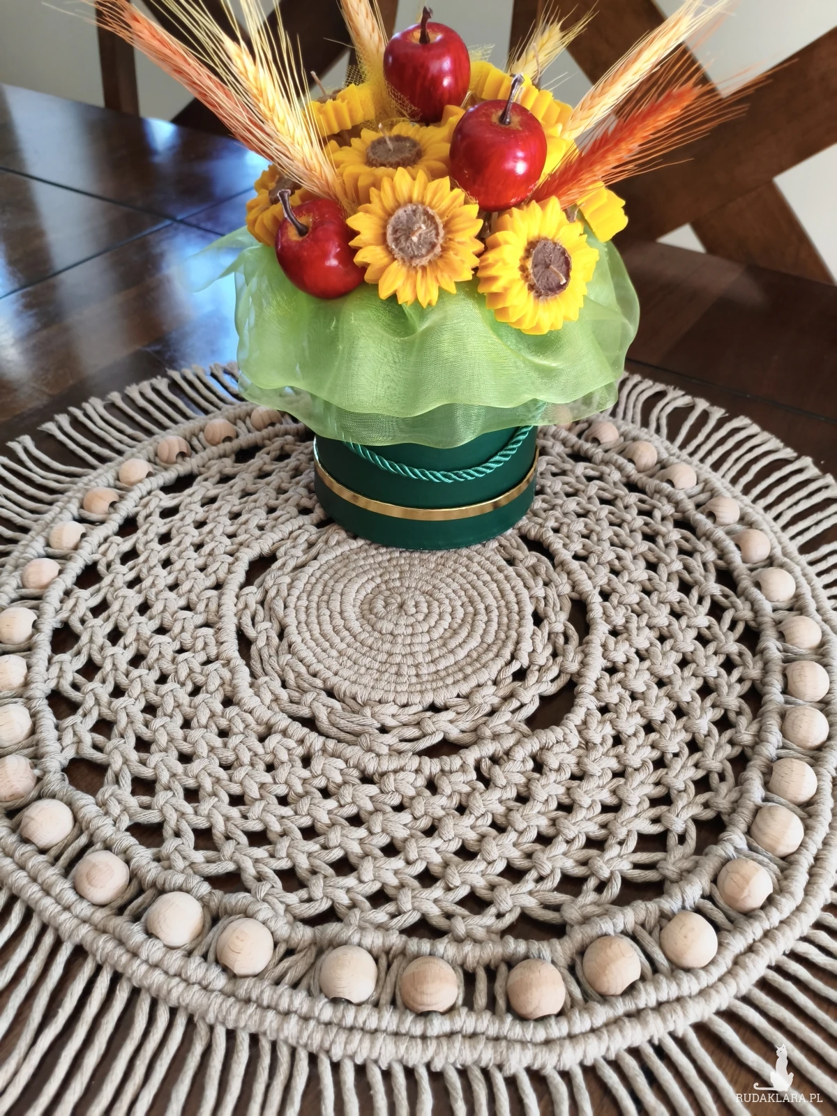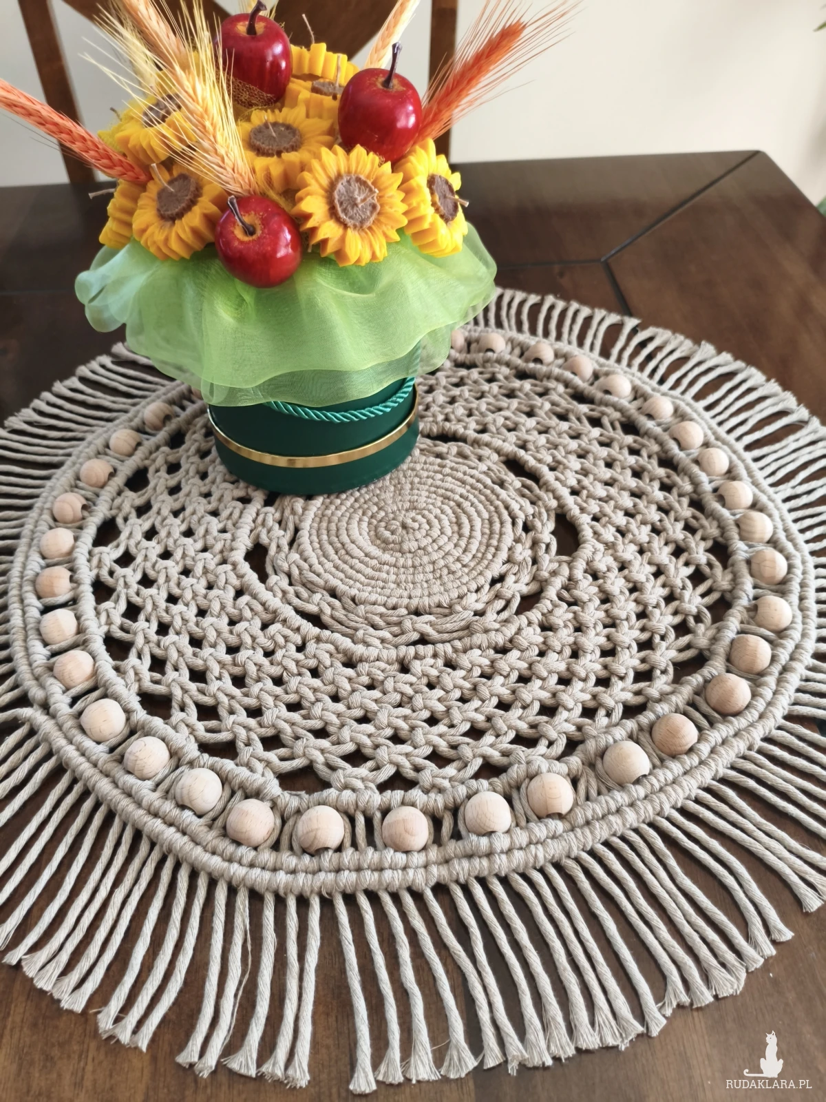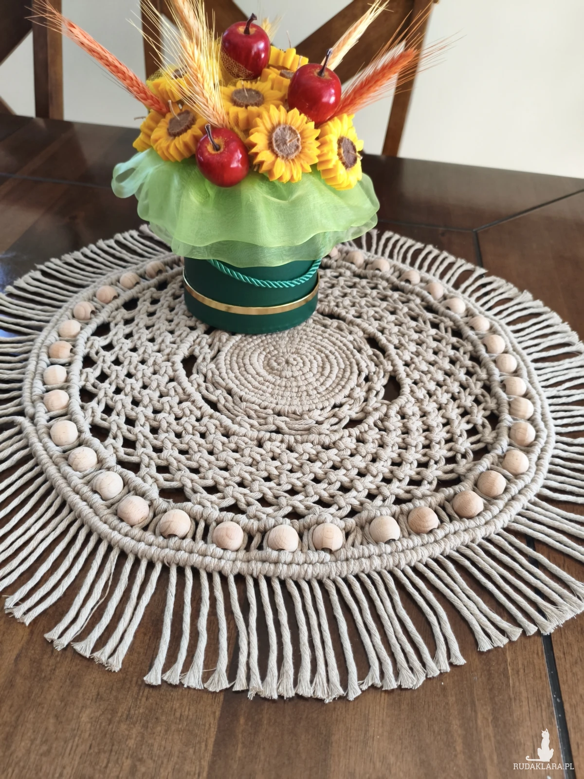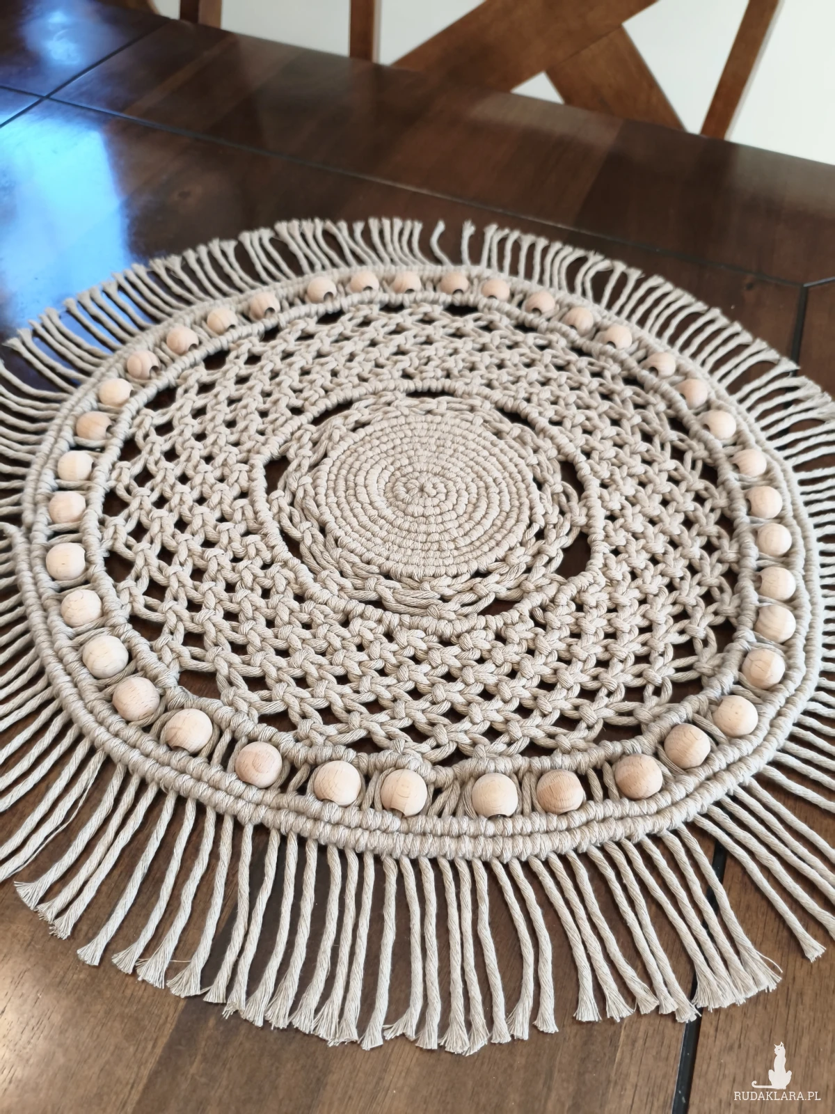 Sprzedam okrągły makramowy bieżnik o średnicy około 45 cm. Wykonany ręcznie z naturalnego sznurka skręcanego w beżowych odcieniach. Ozdobiony drewnianymi koralikami, które nadają mu rustykalny charakter. Idealny jako dekoracja do salonu, sypialni lub na taras.