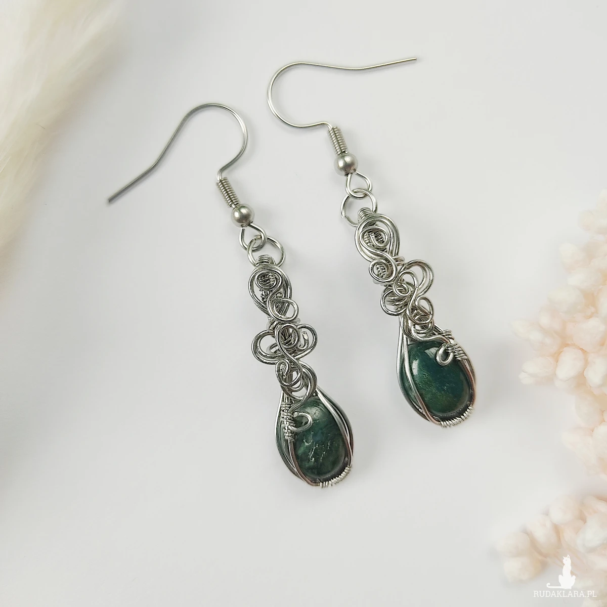 Kolczyki Agat Mszysty ręcznie robione. Wykonane techniką wirewrapping z drutów ze stali chirurgicznej.