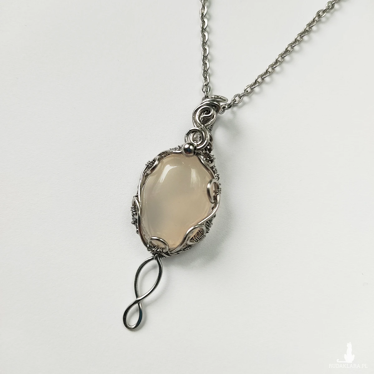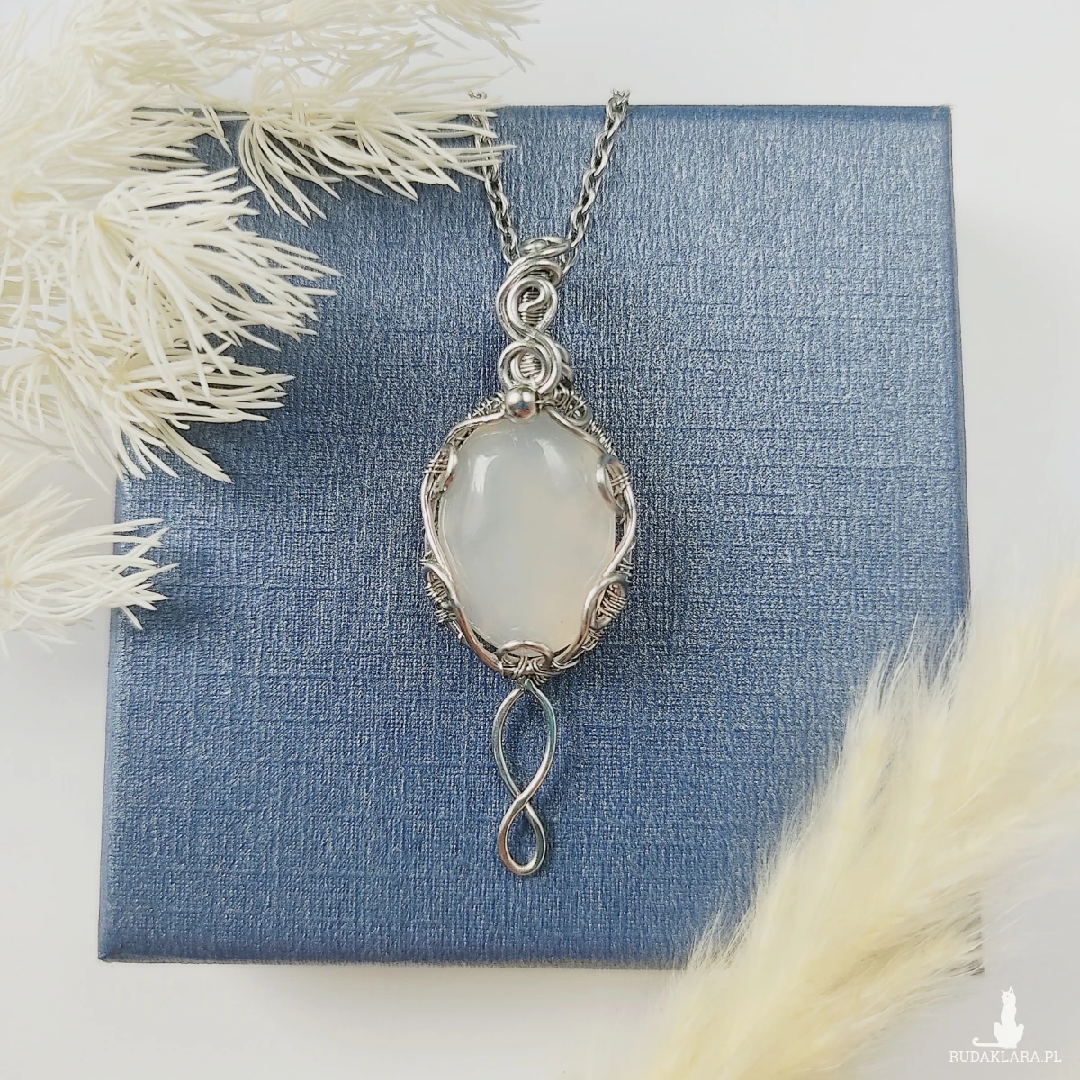 W technice wire wrapping metal jest ręcznie oplatany wokół kamienia, tworząc misterną, ozdobną ramę. Każdy detal został starannie uformowany, by podkreślić naturalne piękno chalcedonu. Stal chirurgiczna, z której wykonano naszyjnik, jest materiałem trwałym, odpornym na korozję i antyalergicznym, dzięki czemu biżuteria zachowuje swój blask przez długie lata.