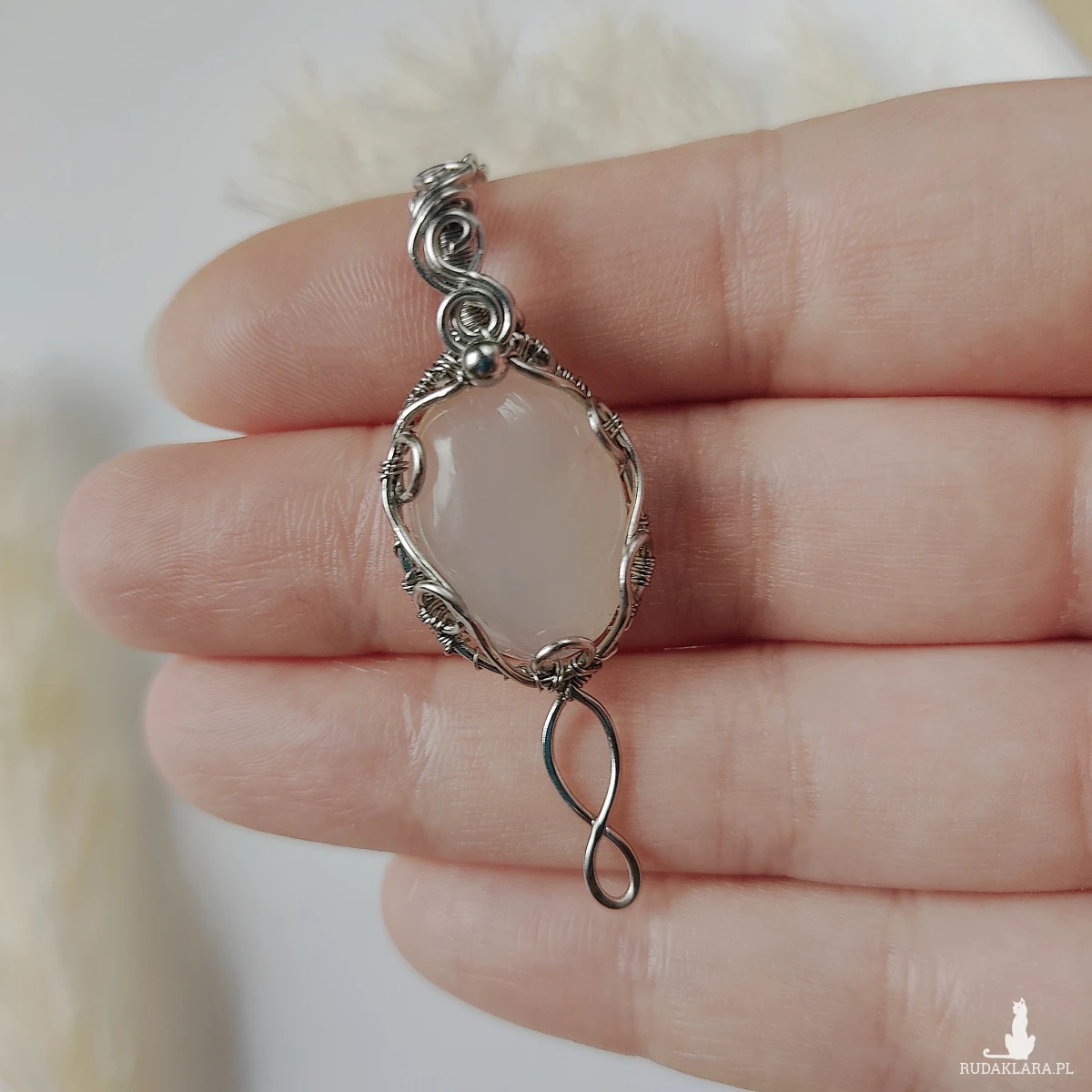 Naszyjnik Vilya to połączenie elegancji, magii i rękodzielniczej precyzji. Wykonany metodą wire wrapping z najwyższej jakości stali chirurgicznej, został ozdobiony subtelnym kamieniem półszlachetnym – chalcedonem, znanym ze swojego mlecznego blasku i harmonizującej energii. Ten wyjątkowy naszyjnik inspirowany elficką biżuterią zachwyca lekkością, finezją i symbolicznym znaczeniem.