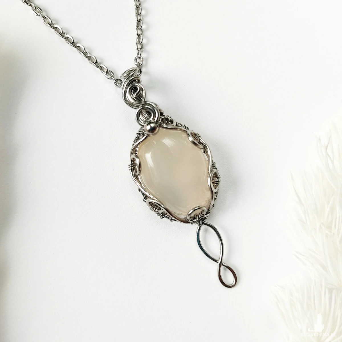 Naszyjnik Chalcedon „Vilya” ręcznie robiony. Wykonany techniką wire wrapping z drutów ze stali chirurgicznej.