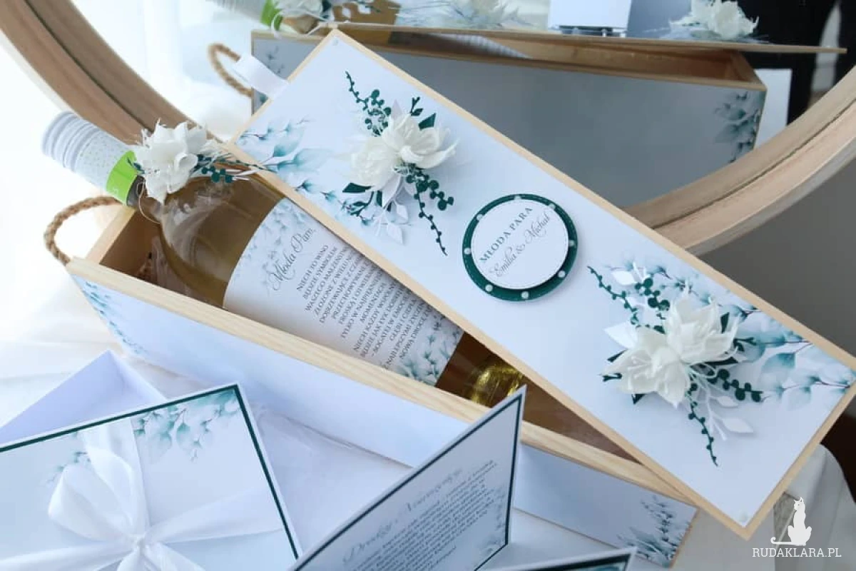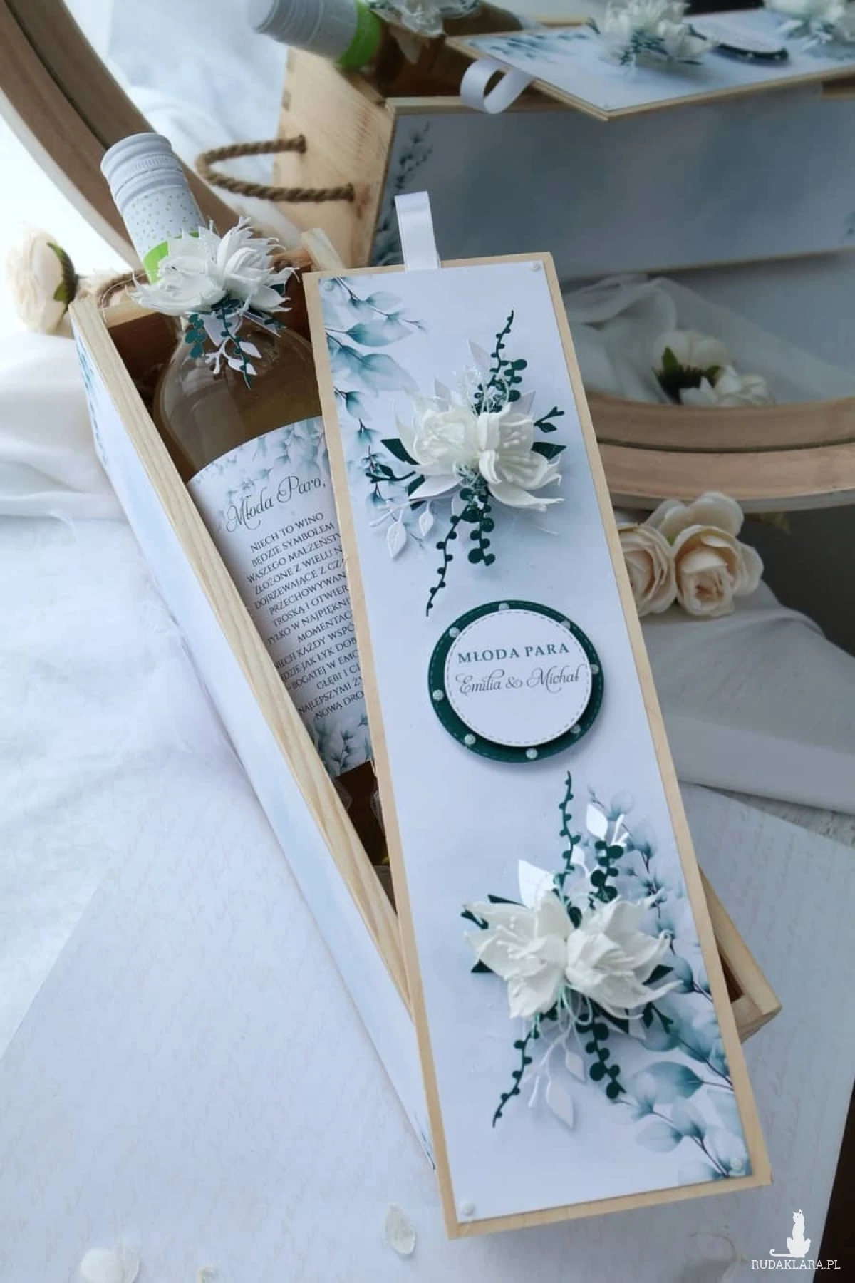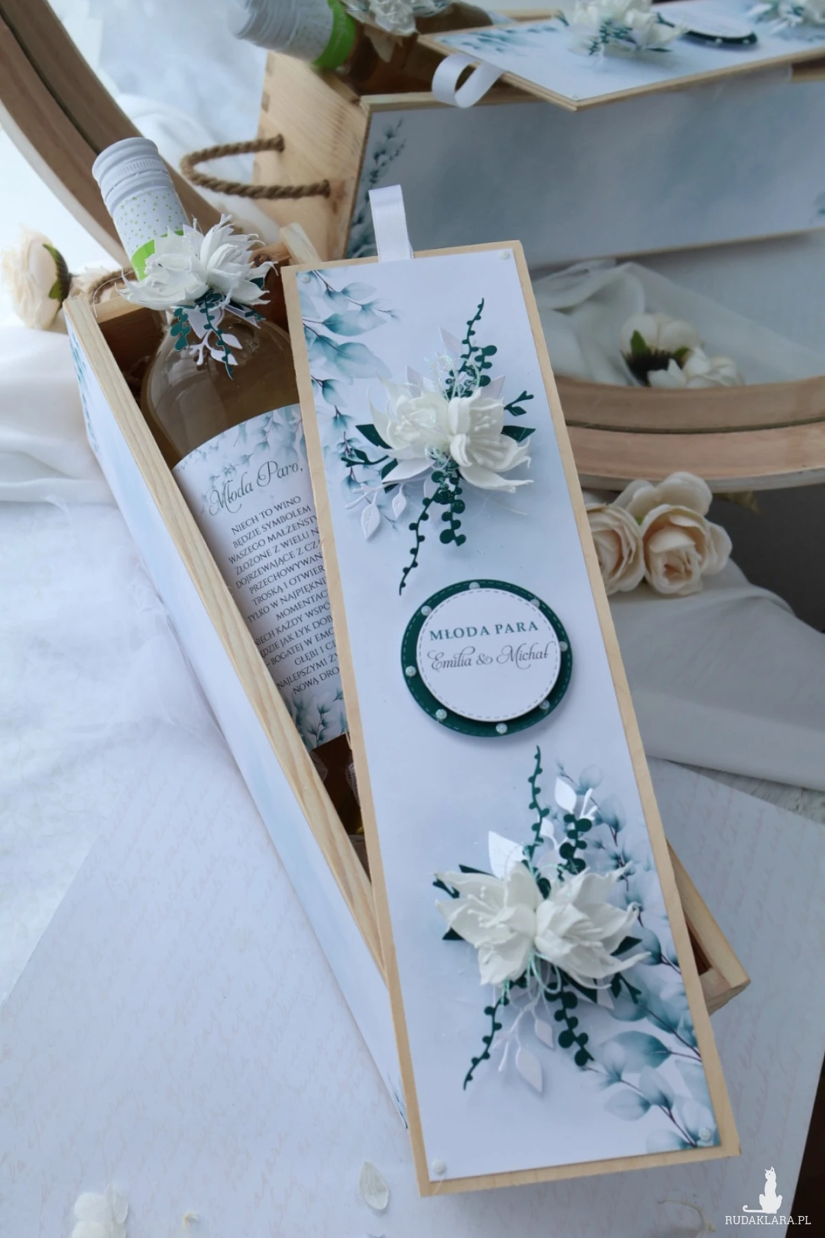Butelkowa zieleń + biel i ręcznie zdobione detale sprawiają, że ta personalizowana skrzynka na wino wygląda elegancko w każdym wnętrzu. Etykieta z dedykacją i zawieszka tworzą spójną całość – wystarczy dodać wino i prezent gotowy.