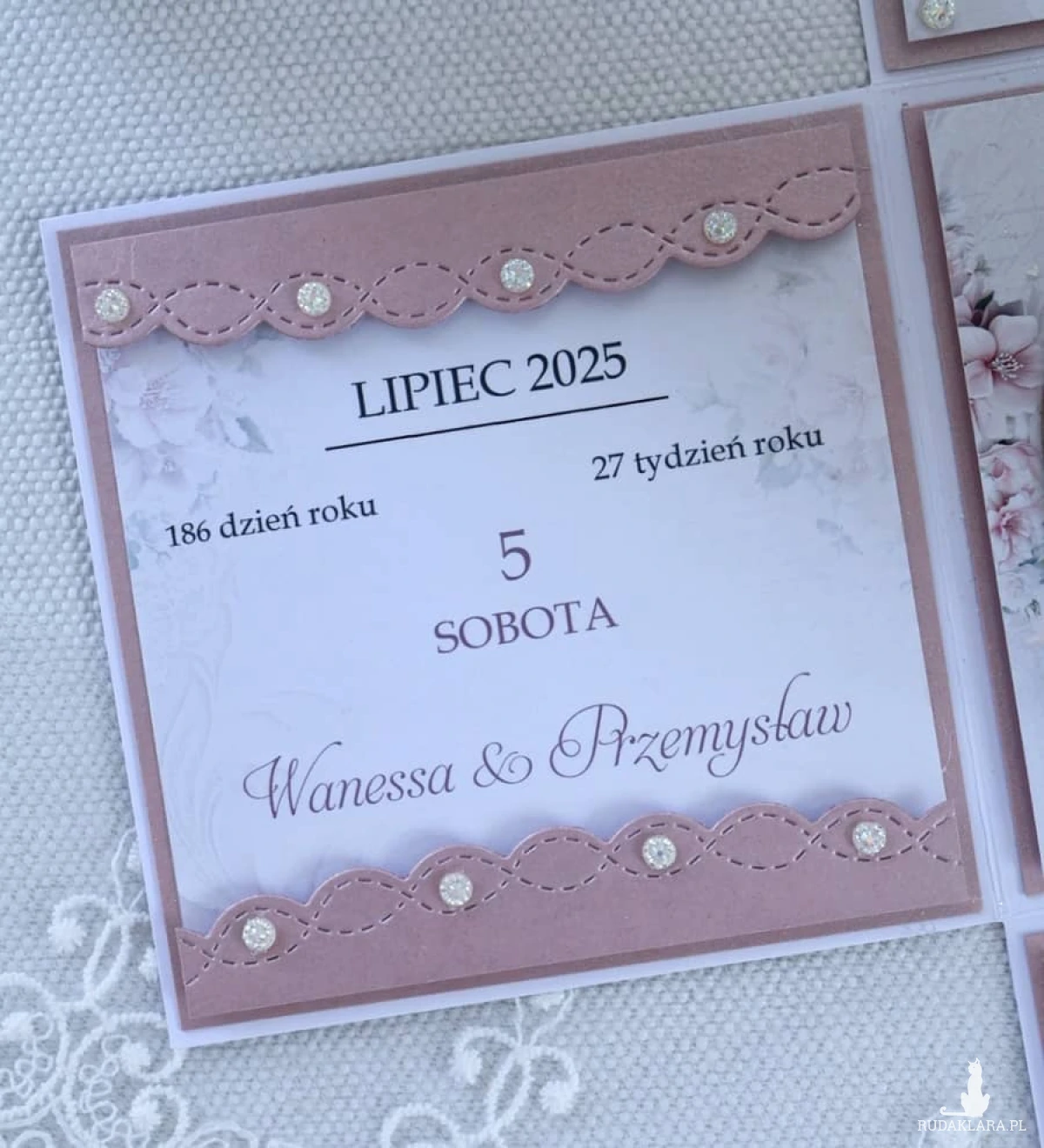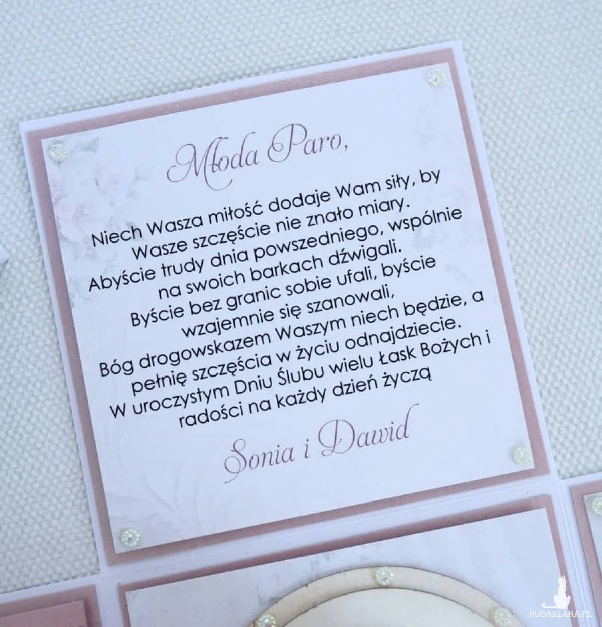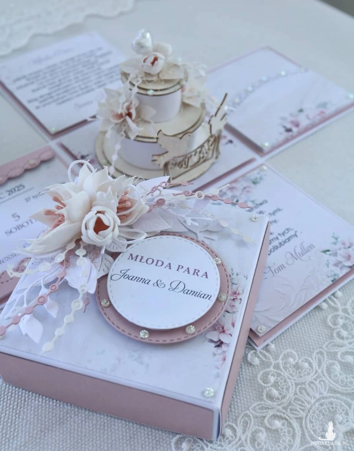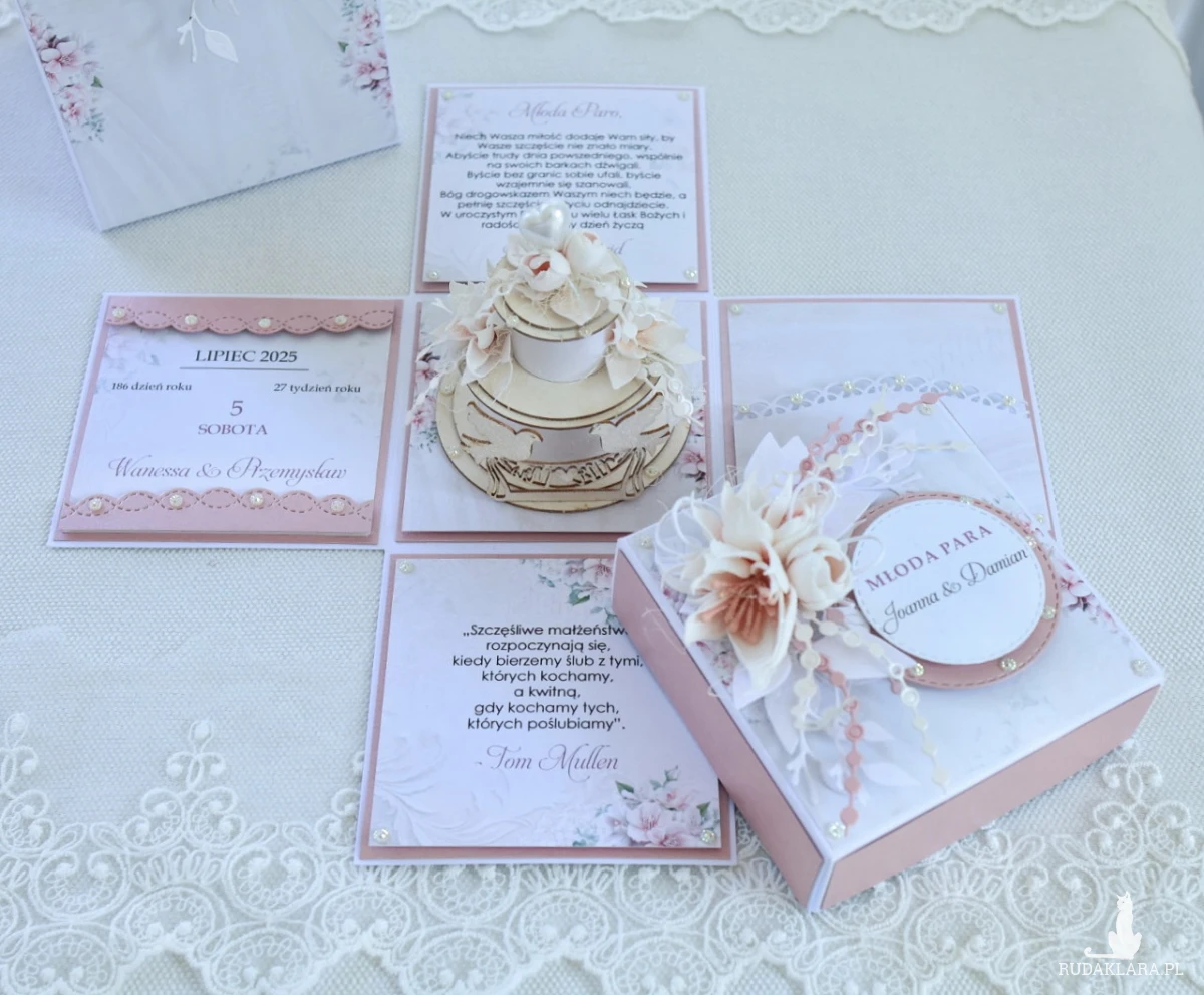 To nie jest zwykła kartka, to mały rytuał radości. Po zdjęciu wieczka pudełko rozkłada się i odsłania ręcznie wykonany tort 3D. Cztery ścianki to Wasza przestrzeń: życzenia/cytat, kalendarz z datą ślubu albo fotografia Młodej Pary.