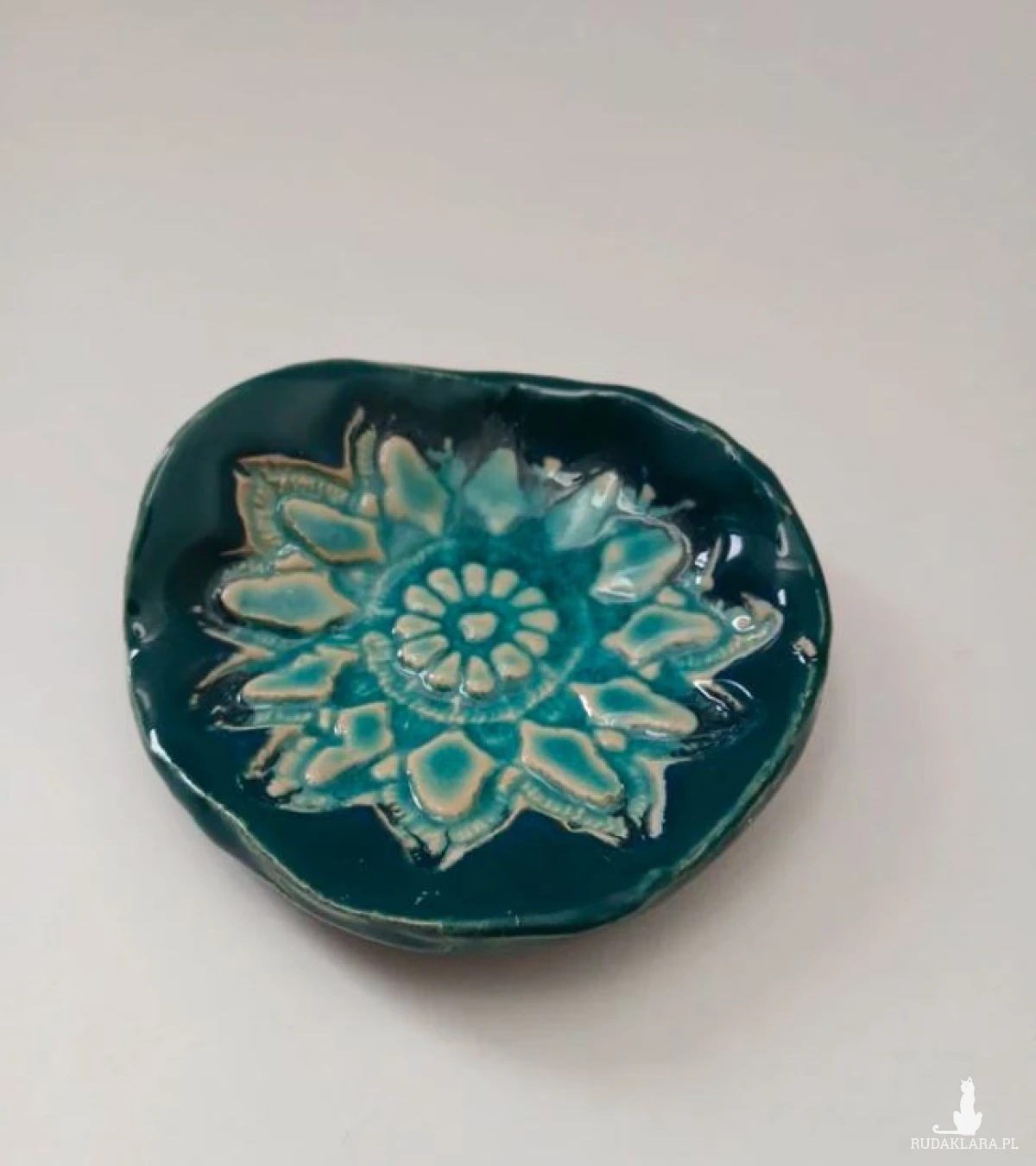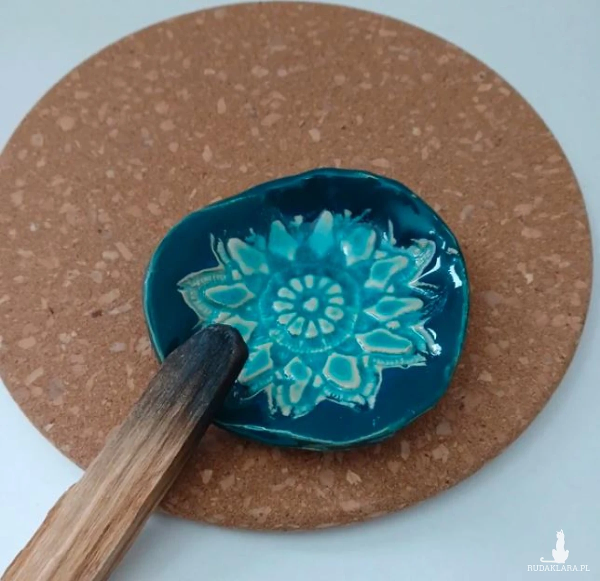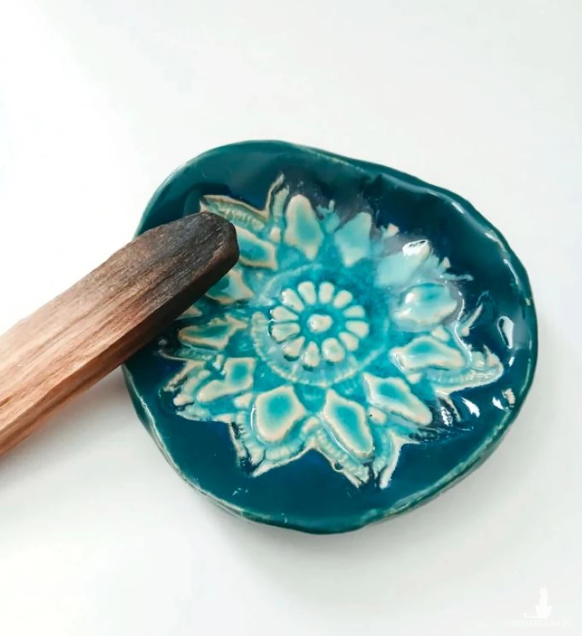 Ceramiczna podstawka na kadzidełko, palo santo, miseczka na biżuterię, tłoczona boho mandala, koronka, świecznik stojak na tealight, mały talerzyk z koronką, podkładka na obrączki w stylu rustykalnym Wymiary: średnica ok 8-9cm Ręcznie robiona gliniana ceramika artystyczna galeria sztuki.