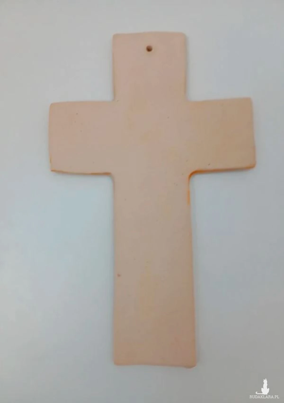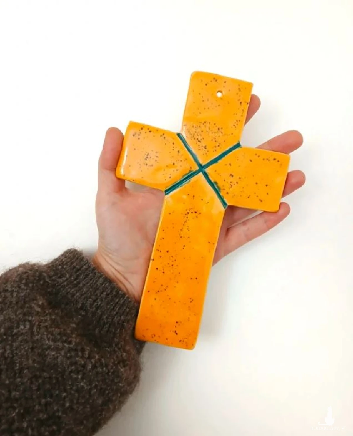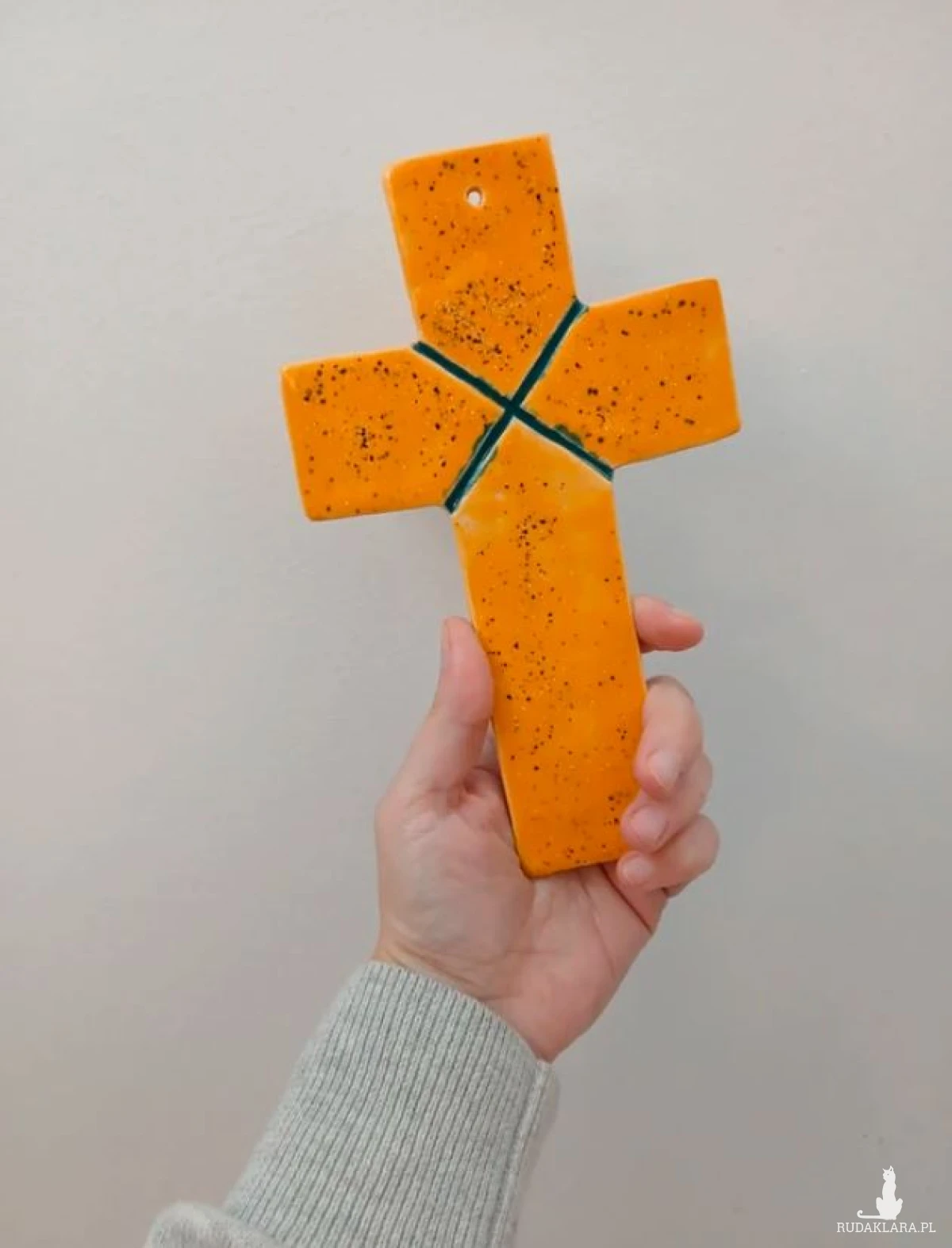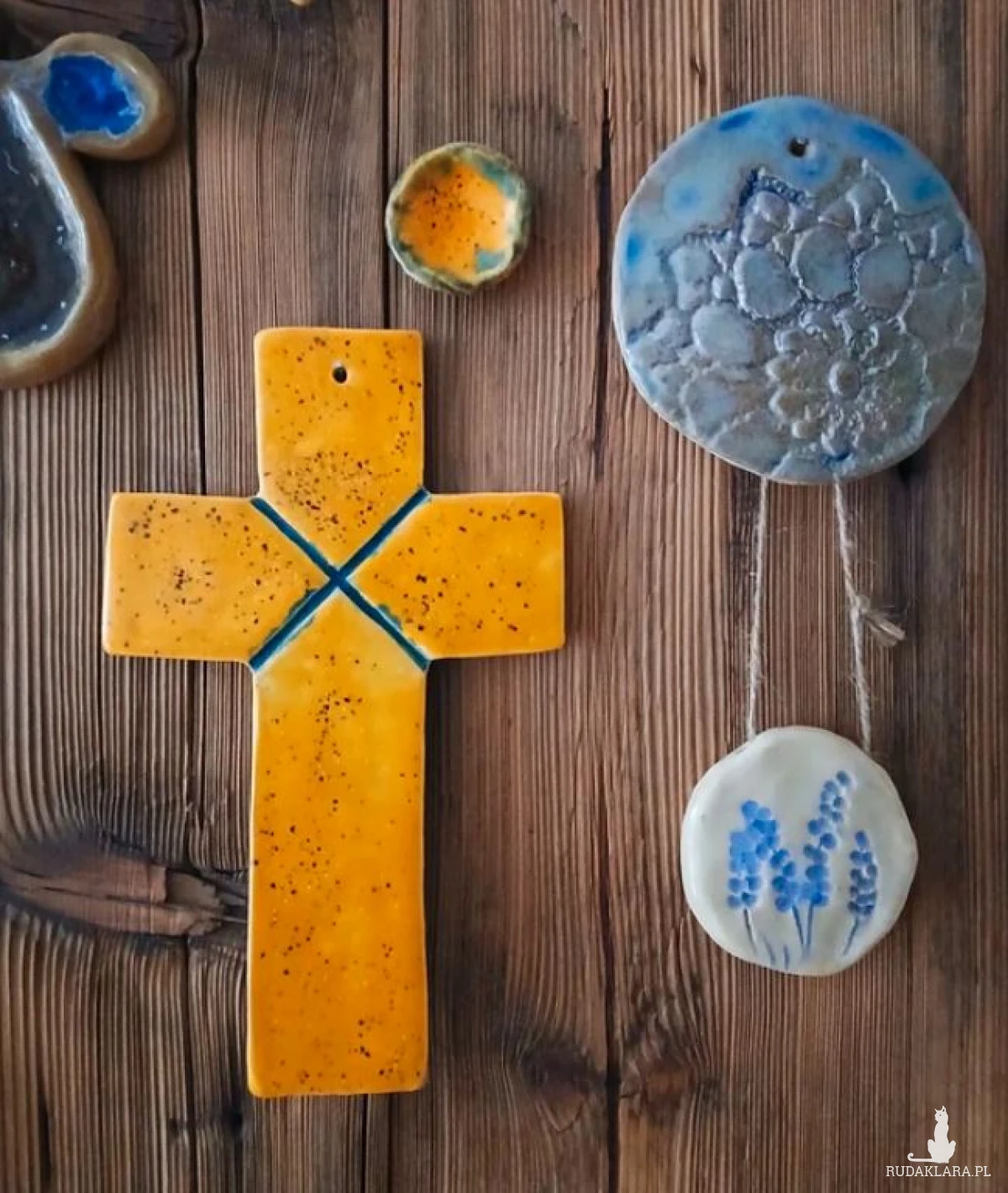 Kolorowy ceramiczny krzyż, gliniany krzyżyk do powieszenia na ścianie 19x11.5cm.